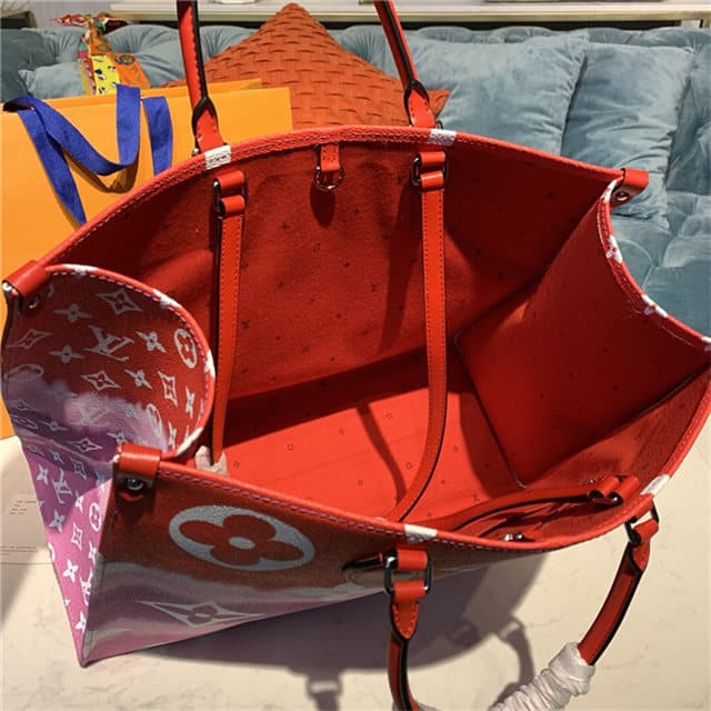 Inspired by the ancient Japanese Shibori technique of knotting and folding the fabric before dyeing it, the LV Escale Collection brings a fresh colorful beach feel to the Onthego GM tote bag for Summer 2020. Large and easy to carry with its shoulder straps or top handles, this large tote is a perfect everyday bag.