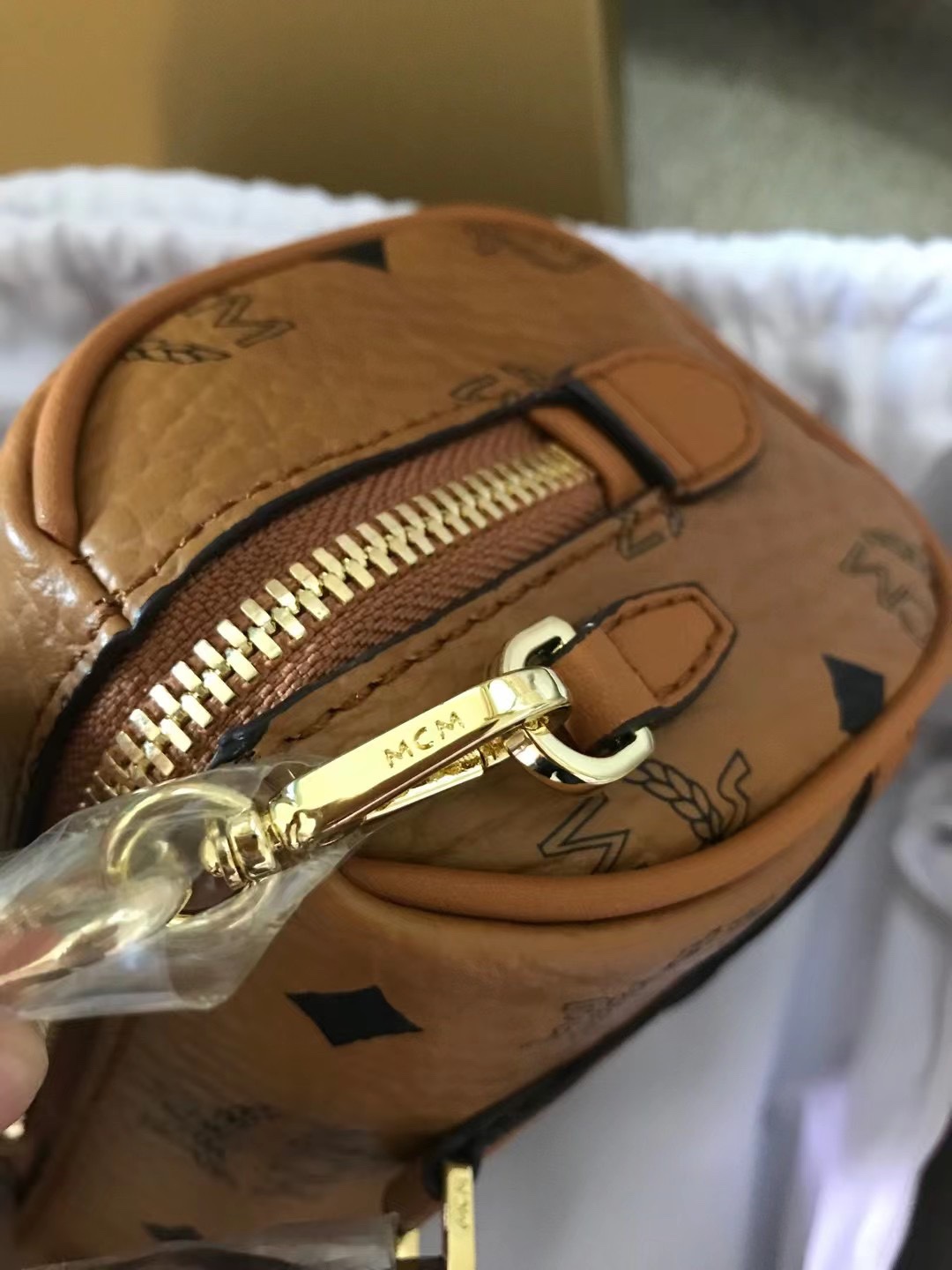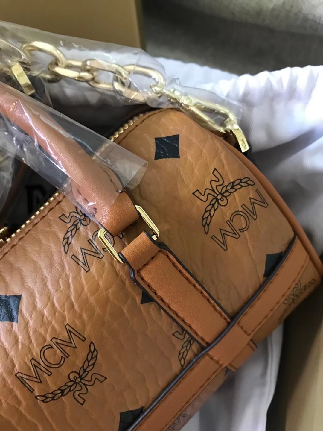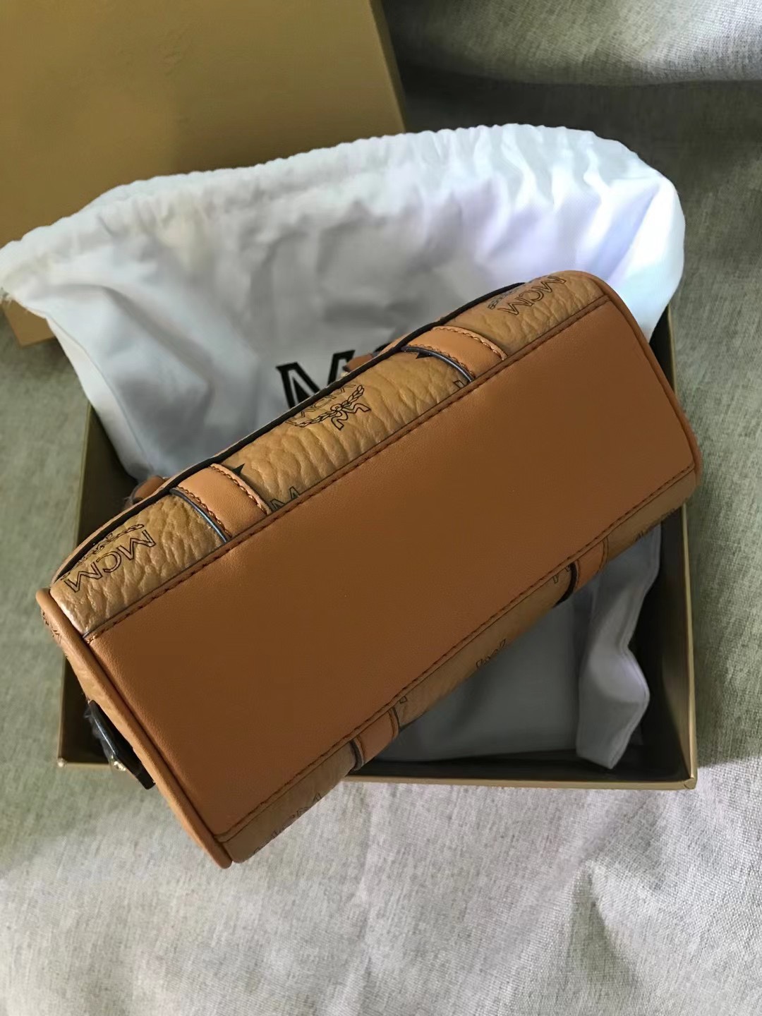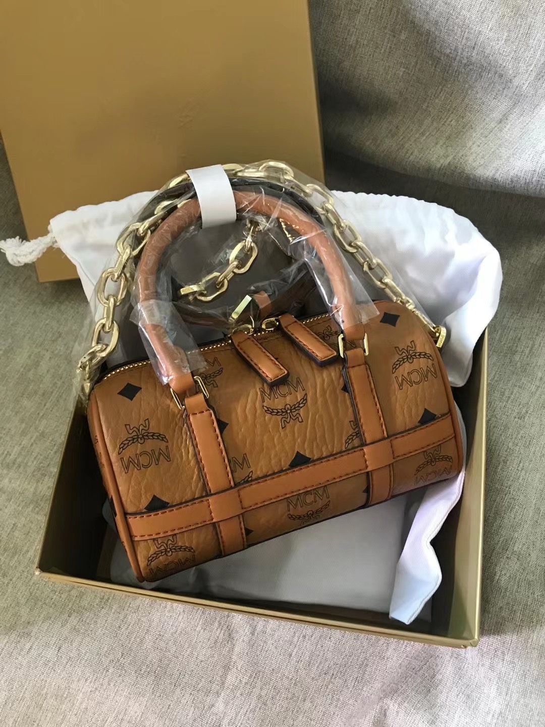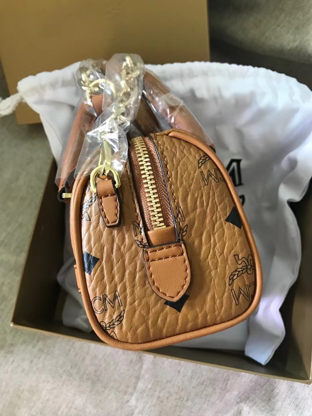 MCM Noble MINI Boston Bag, equipped with a leather keychain, a tag-style pendant, and metal locks, showcases a fashionable style in terms of design, structure, and styl