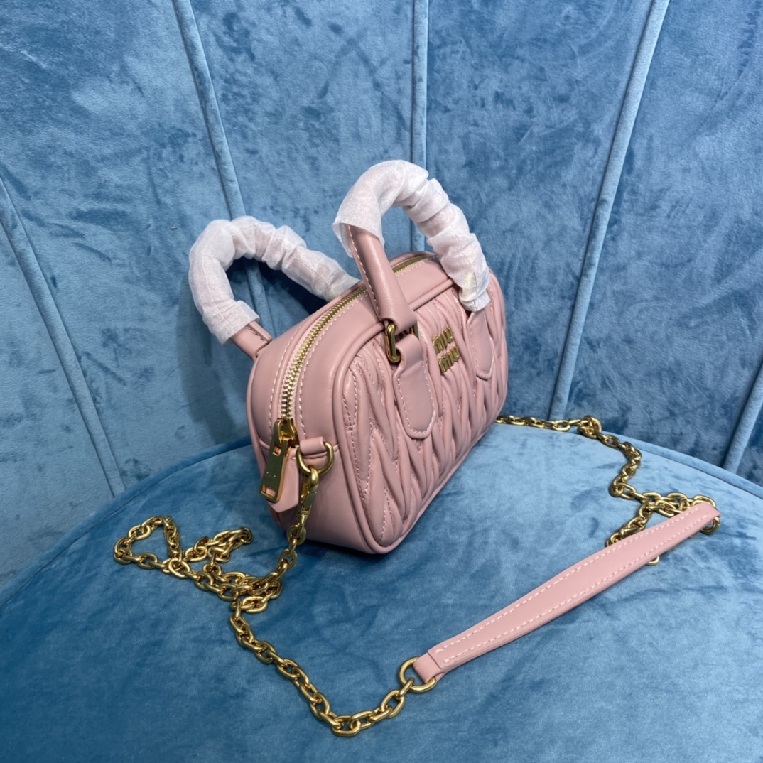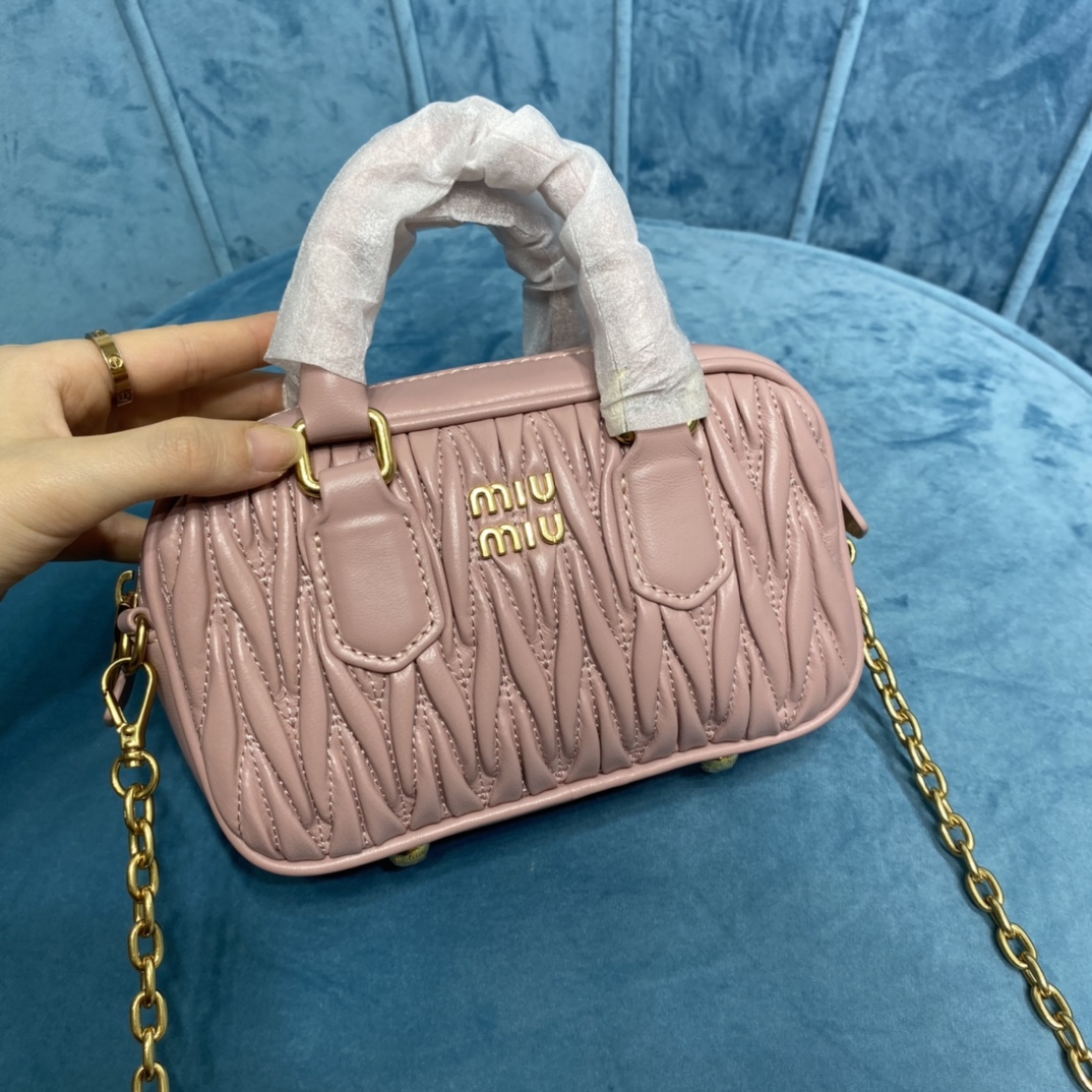 Miu Miu introduces the new Too Pretty Bowling Bag in a stylish Blue Gray color. It is crafted from imported lambskin with the brand’s iconic Matelasse embroidery, vintage matte hardware, and a playful touch. The bag maintains its inherent playfulness while exuding a structured and stylish silhouette. It is versatile, fitting any occasion, and has ample capacity. It has become a highly sought-after accessory among fashion enthusiasts, with popularity rivaling that of the previous Miu Wander. Available in a variety of colors and three different sizes.