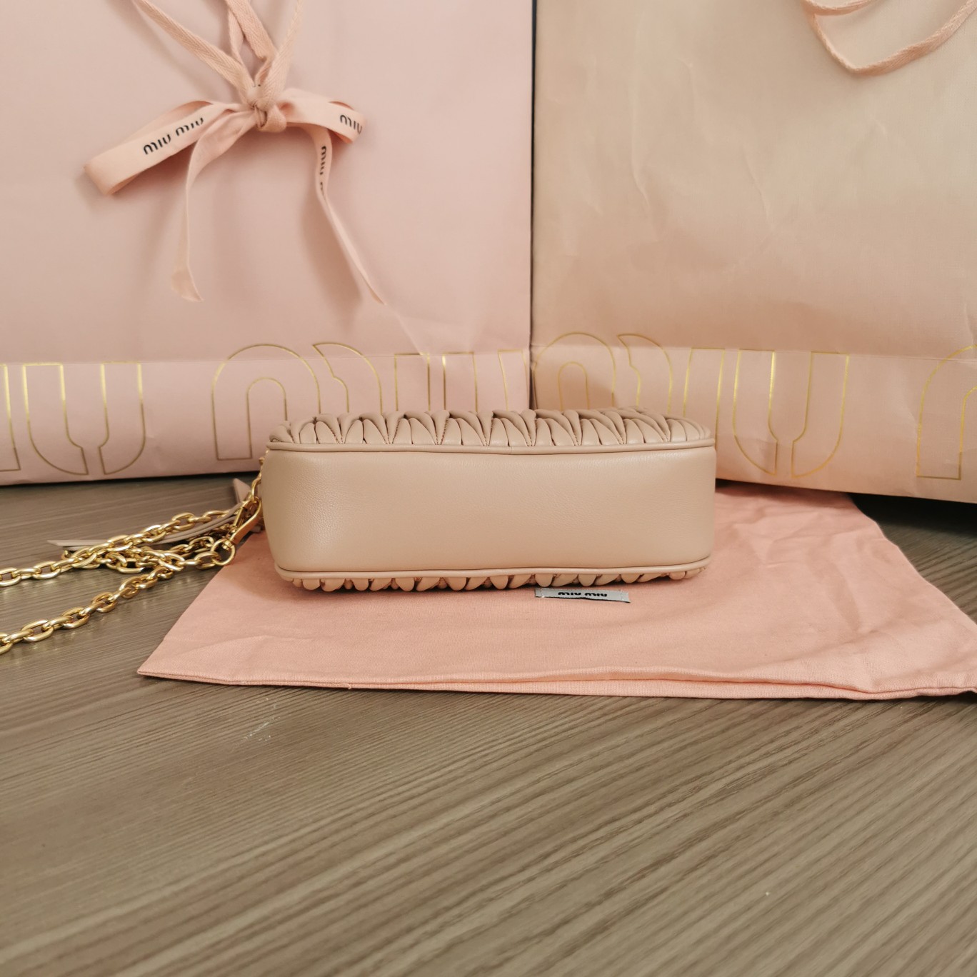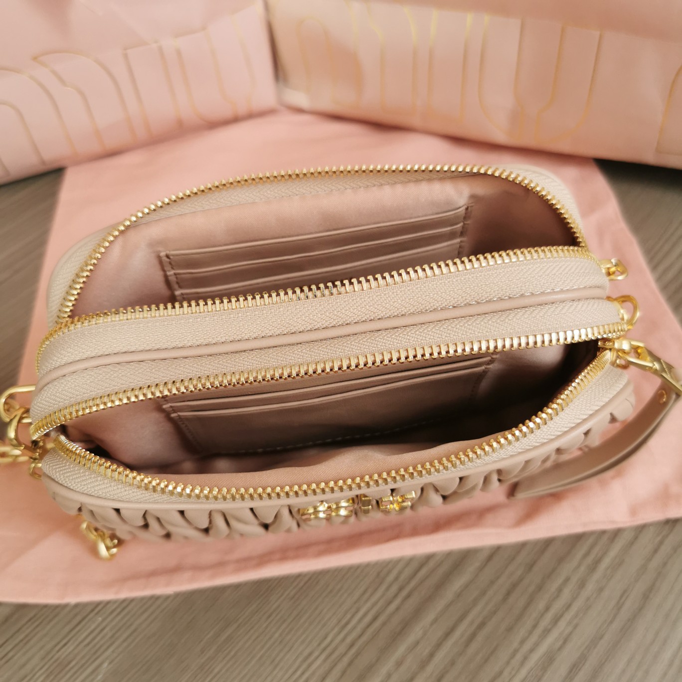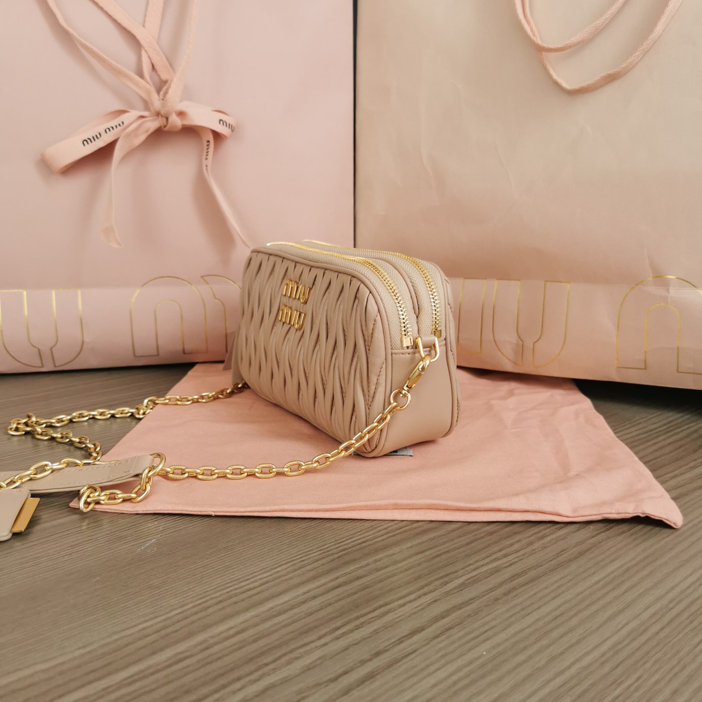 The new MiuMiu double-zip crossbody bag is crafted with imported lambskin featuring the brand’s iconic Matelasse embroidery. It showcases vintage matte hardware and a detachable 115cm metal chain shoulder strap. The interior is designed with multiple card slots for enhanced practicality. It comes with a brand new Miu signature pendant and has a structured and stylish shape, exuding personality. It is both cute and queen-like, offering ample capacity. It comes with the original packaging.