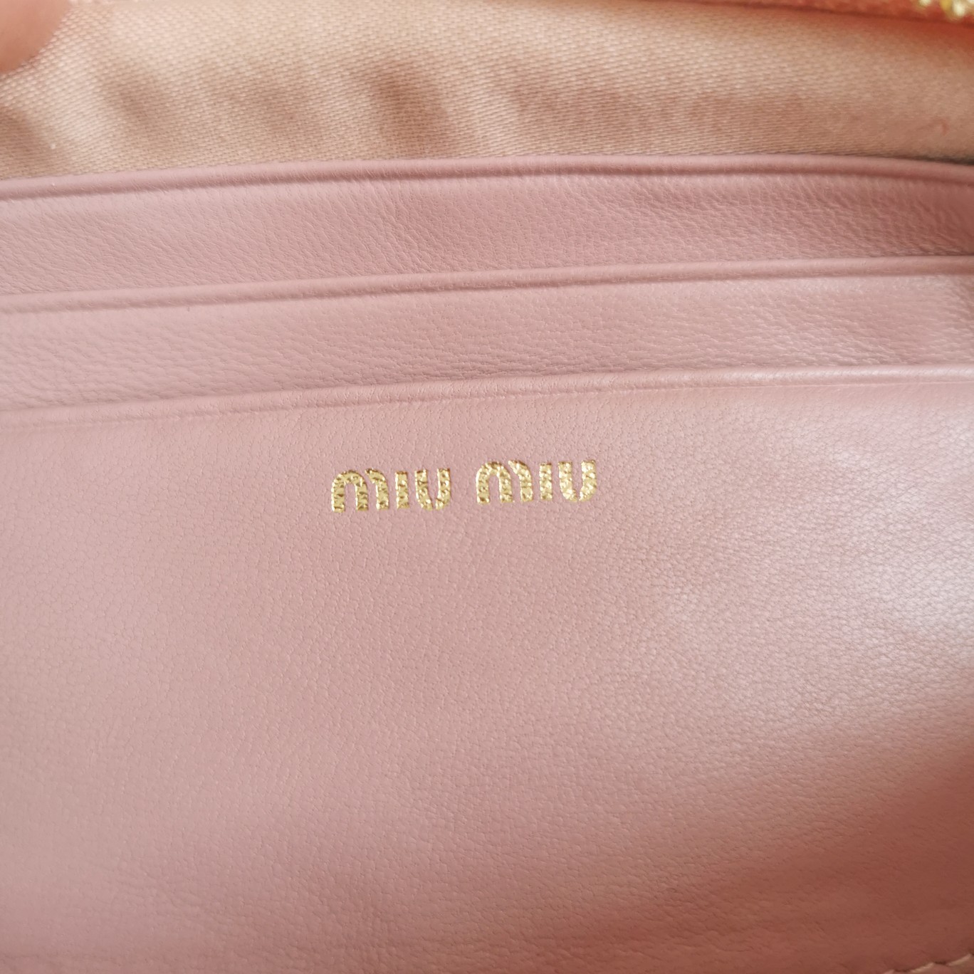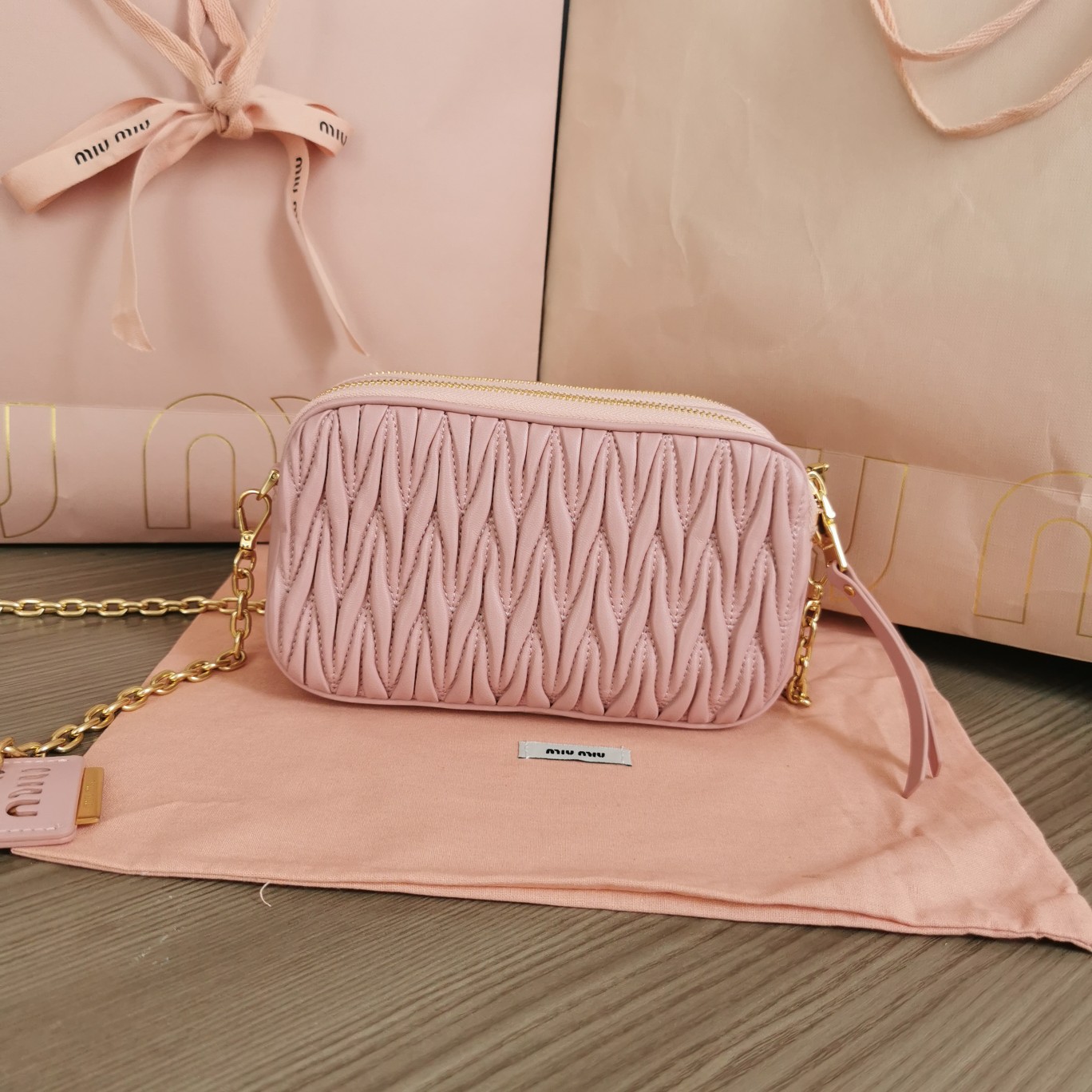 The new MiuMiu double-zip crossbody bag is crafted with imported lambskin featuring the brand’s iconic Matelasse embroidery. It showcases vintage matte hardware and a detachable 115cm metal chain shoulder strap. The interior is designed with multiple card slots for enhanced practicality. It comes with a brand new Miu signature pendant and has a structured and stylish shape, exuding personality. It is both cute and queen-like, offering ample capacity. It comes with the original packaging.