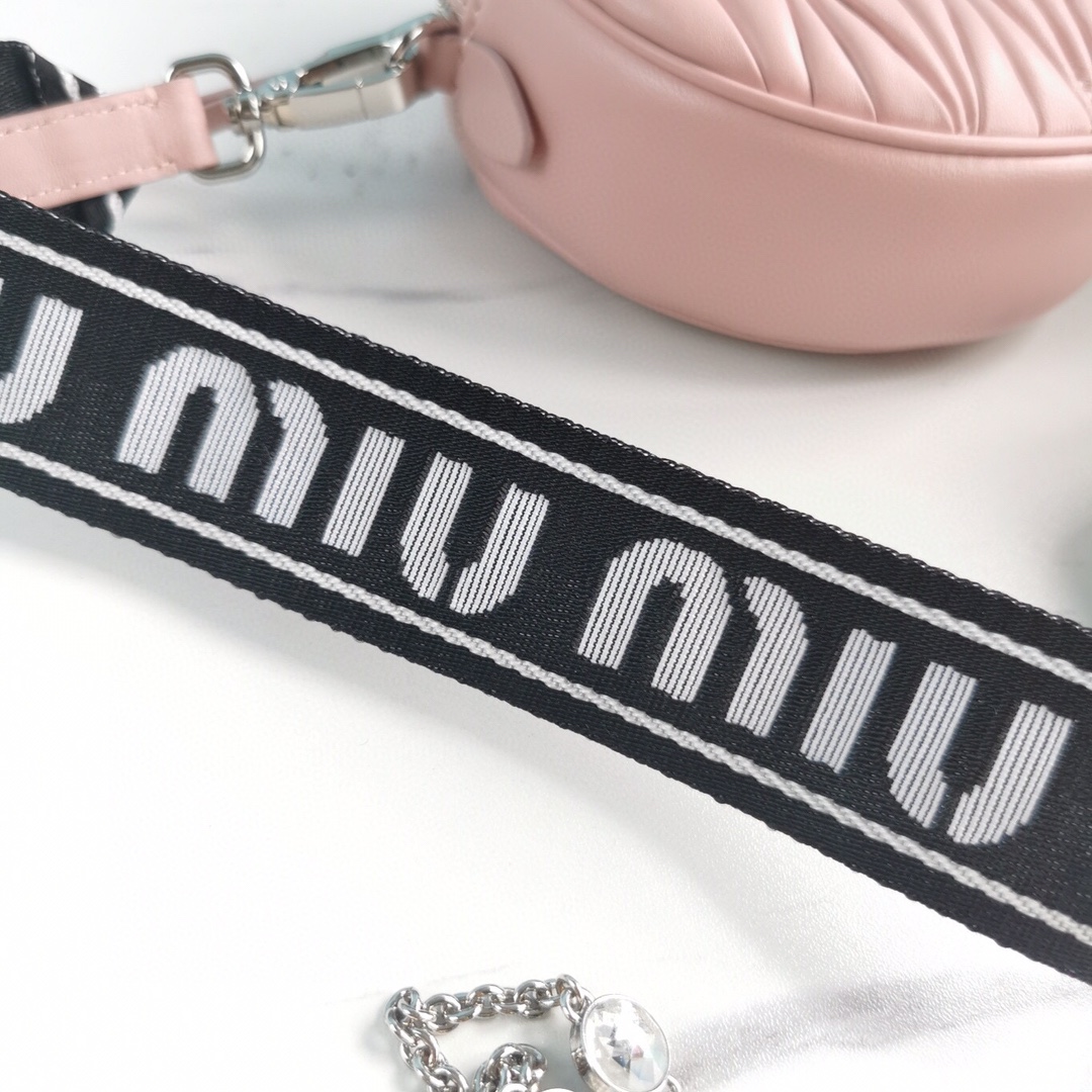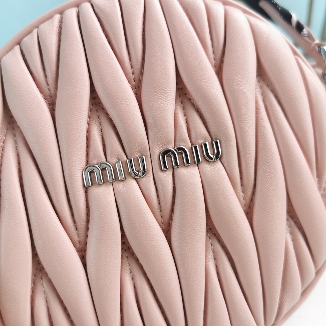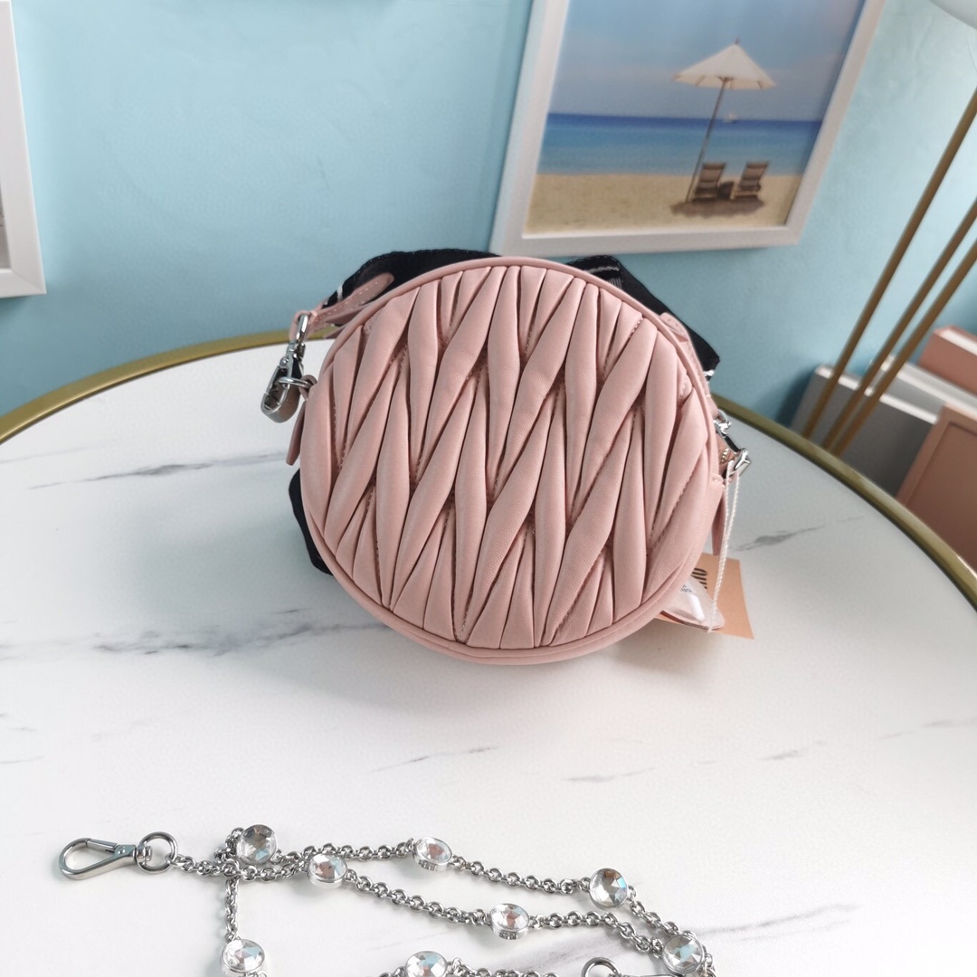 New product: Two-in-one diamond chain bag with small round cakes. The bag features delicate embossed pleats and wrinkles, made with imported Cloquet lambskin for an incredibly comfortable feel. It is lined with cotton satin and designed with dual shoulder straps: a detachable crystal chain shoulder strap and an adjustable woven shoulder strap with a Miu Miu logo print. The bag also comes with a mini round cake accessory. It offers multiple ways to wear and creates a cool and versatile look. It is packaged in a boutique-style packaging.