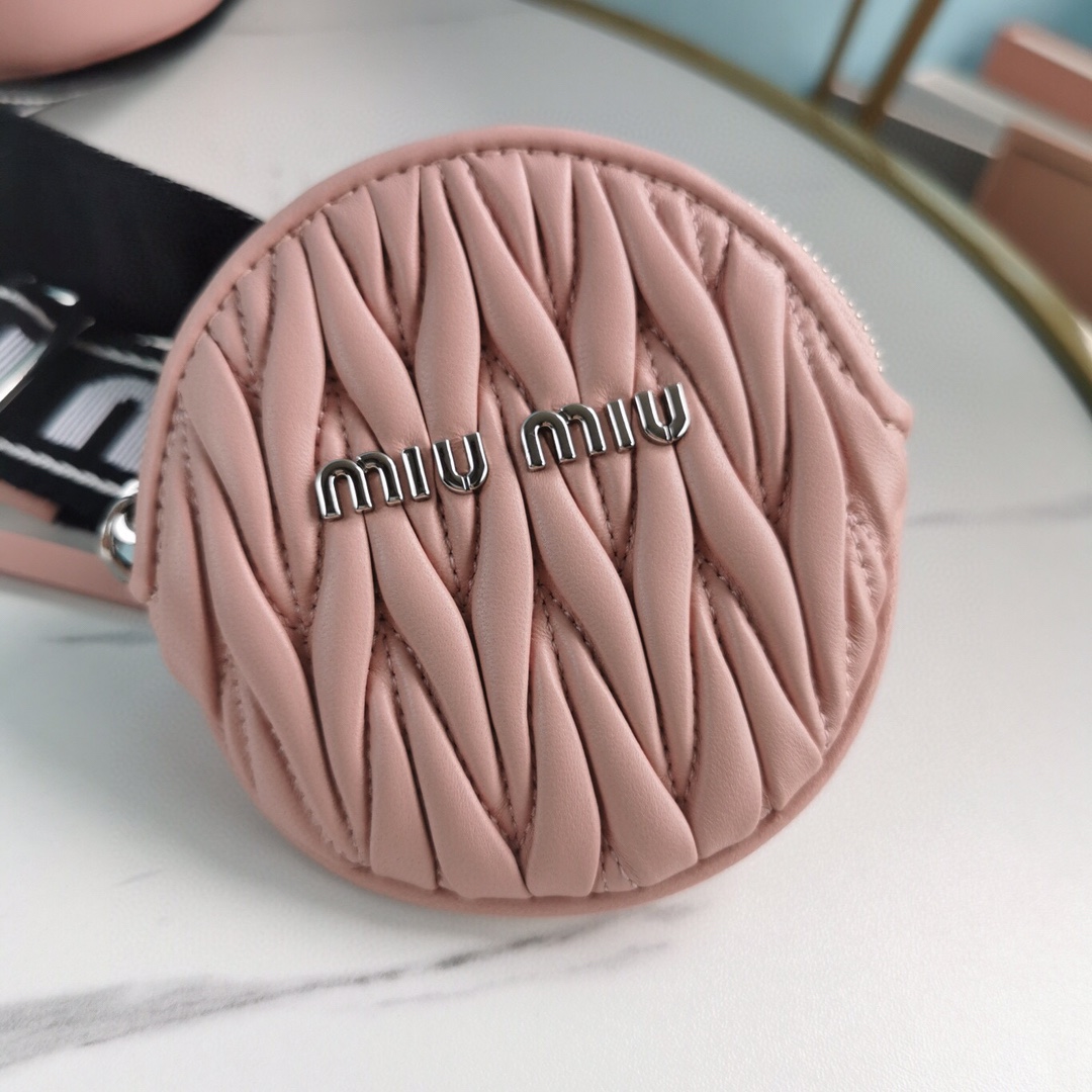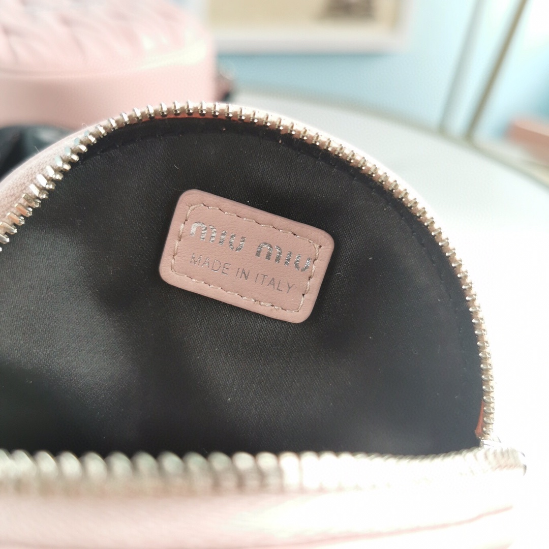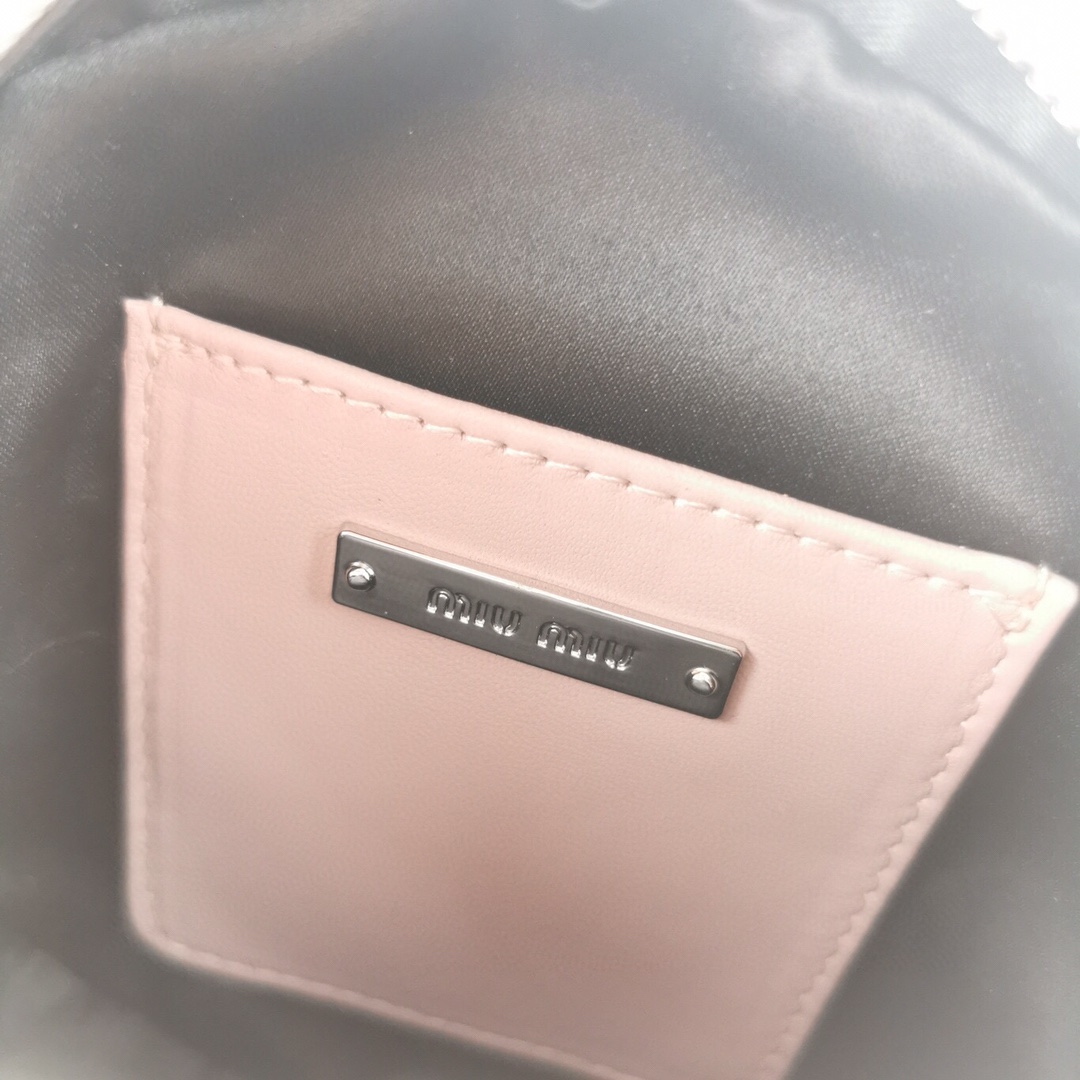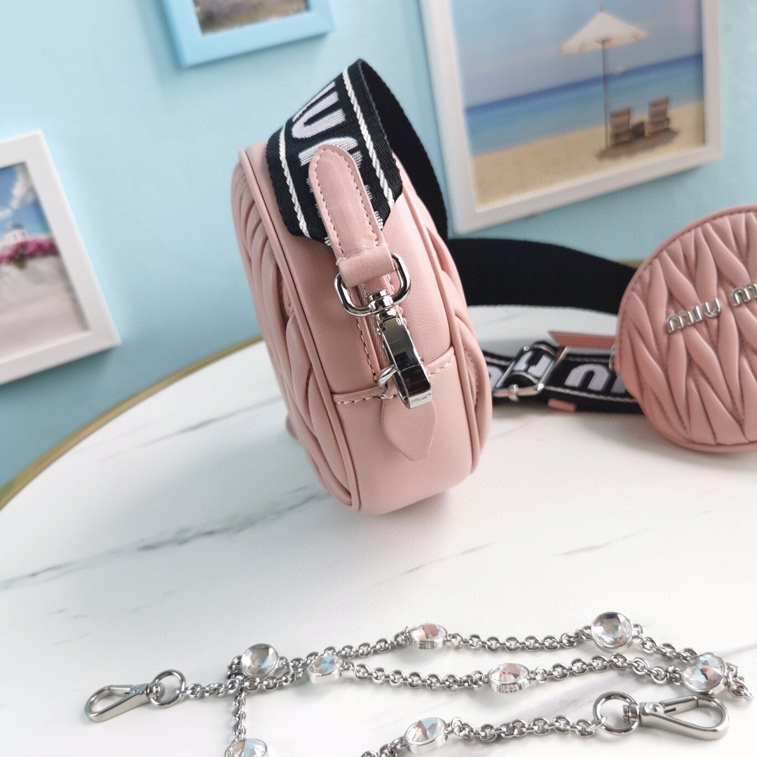 New product: Two-in-one diamond chain bag with small round cakes. The bag features delicate embossed pleats and wrinkles, made with imported Cloquet lambskin for an incredibly comfortable feel. It is lined with cotton satin and designed with dual shoulder straps: a detachable crystal chain shoulder strap and an adjustable woven shoulder strap with a Miu Miu logo print. The bag also comes with a mini round cake accessory. It offers multiple ways to wear and creates a cool and versatile look. It is packaged in a boutique-style packaging.
