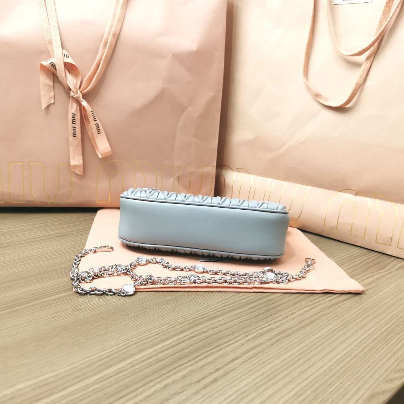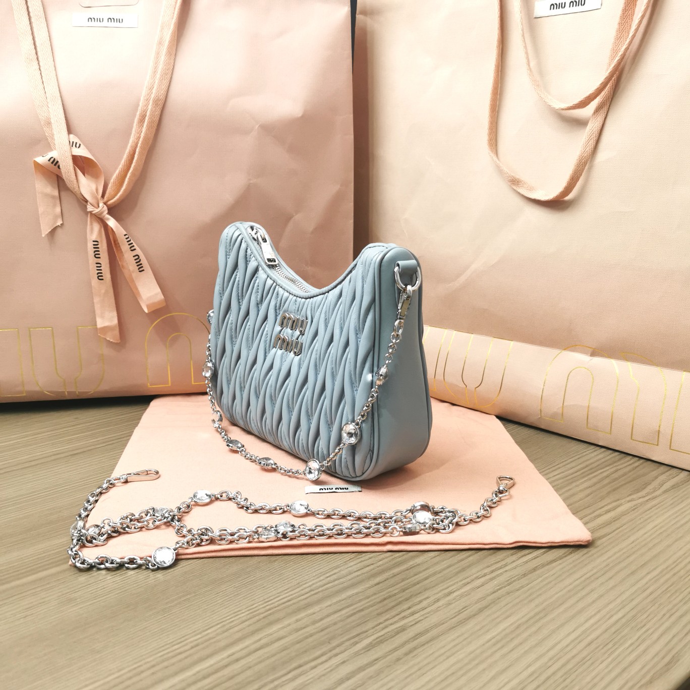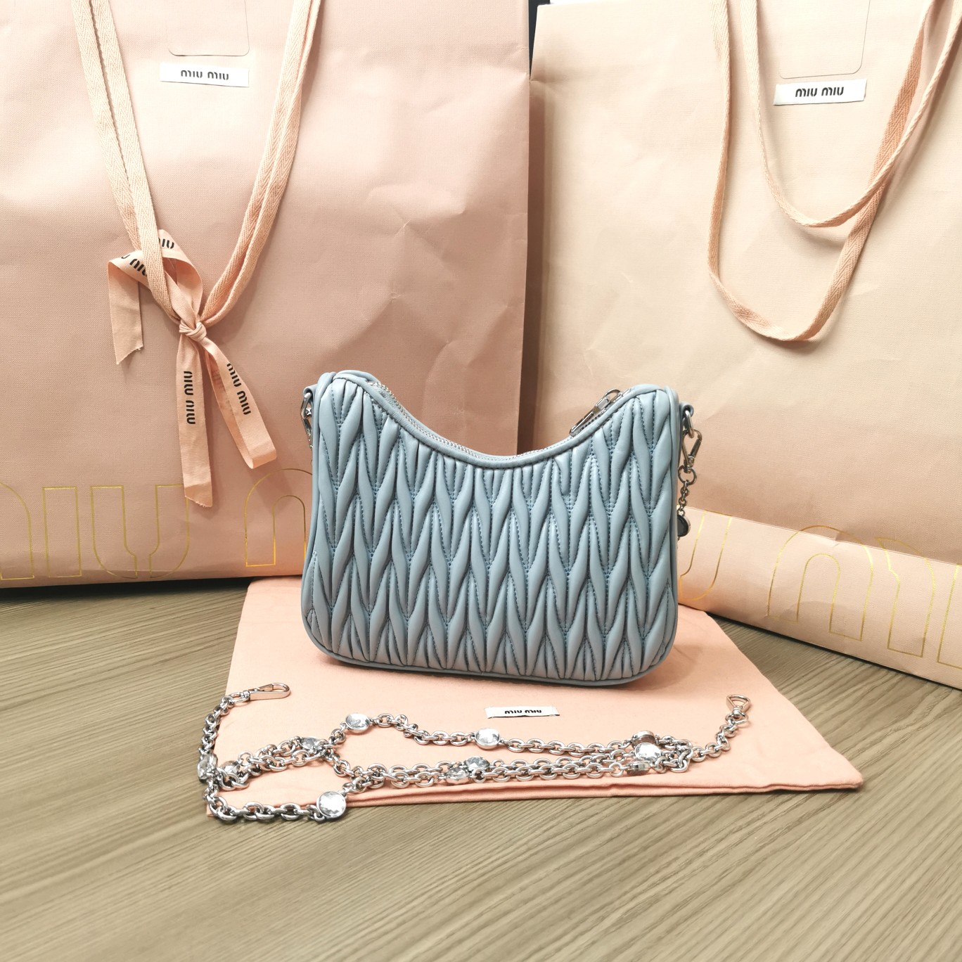 The new season’s Miu Miu Crystal Chain Edition accessory collection handbag features the signature Matelassé embroidered lambskin material, a unique design exclusive to Miu Miu. The stunning shoulder strap adorned with crystal-like decorations showcases a distinctive feature. The bag’s design exudes exquisite elegance, with a metal engraved logo on the front. It has a zip closure, satin and soft lambskin pockets, and comes with original packaging.