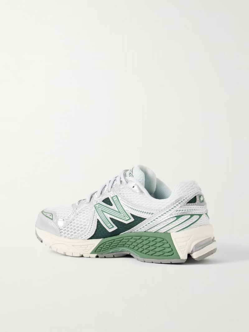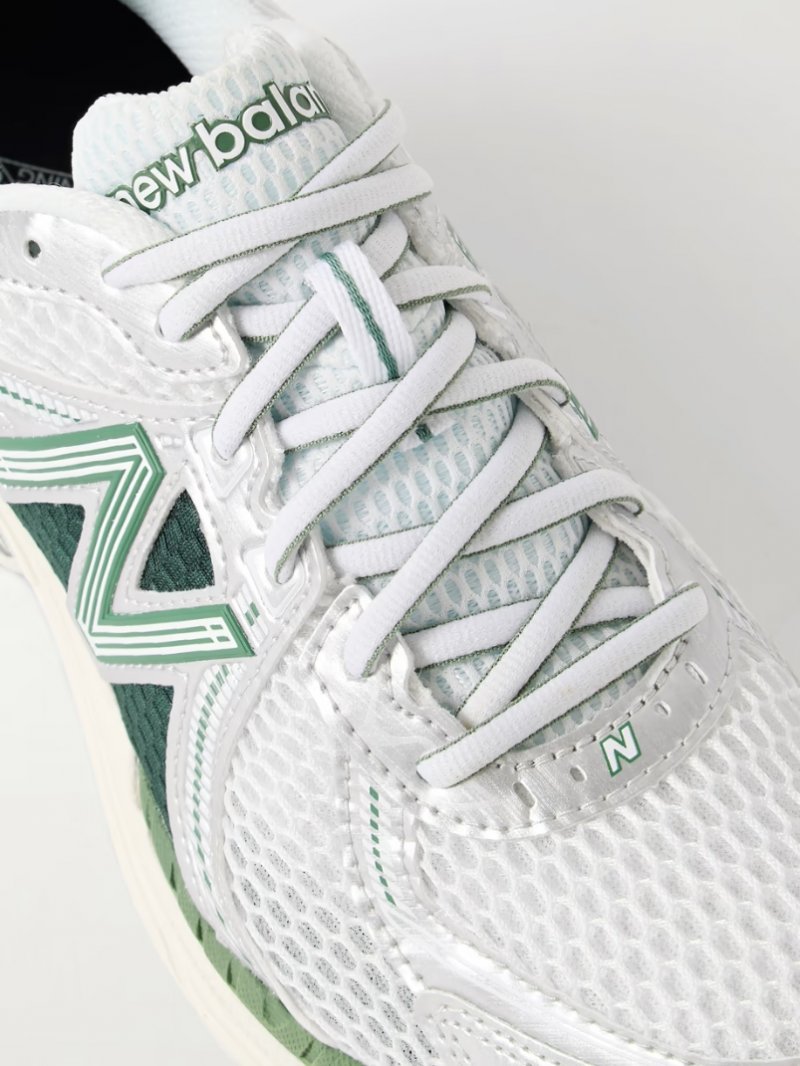 - White mesh, silver leather, white and dark-green rubber