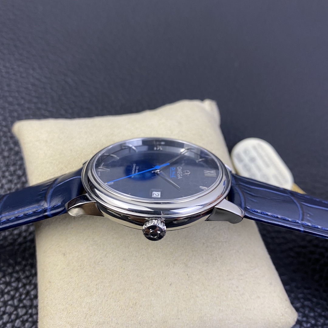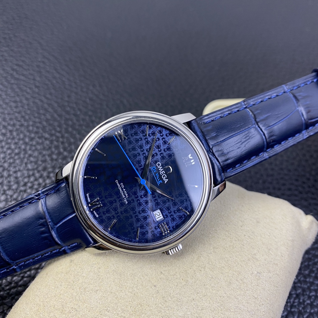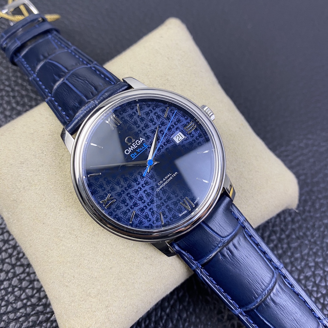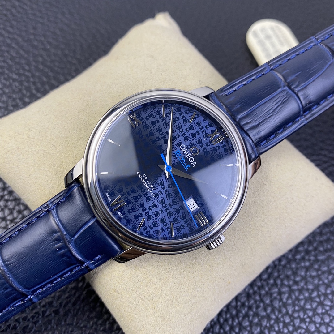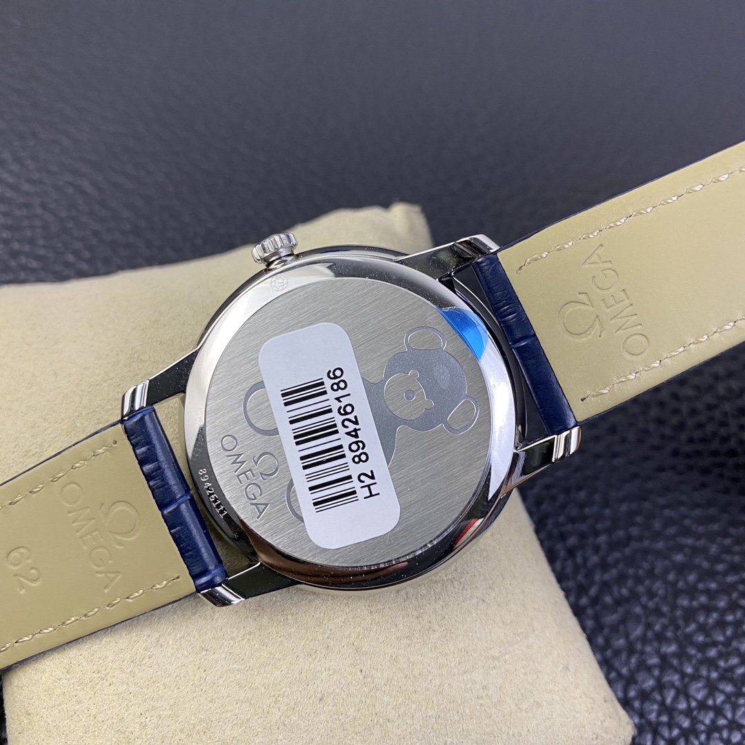 Dial: The sunray-brushed blue lacquered dial is beautifully decorated with an exquisite Omega teddy bear pattern.