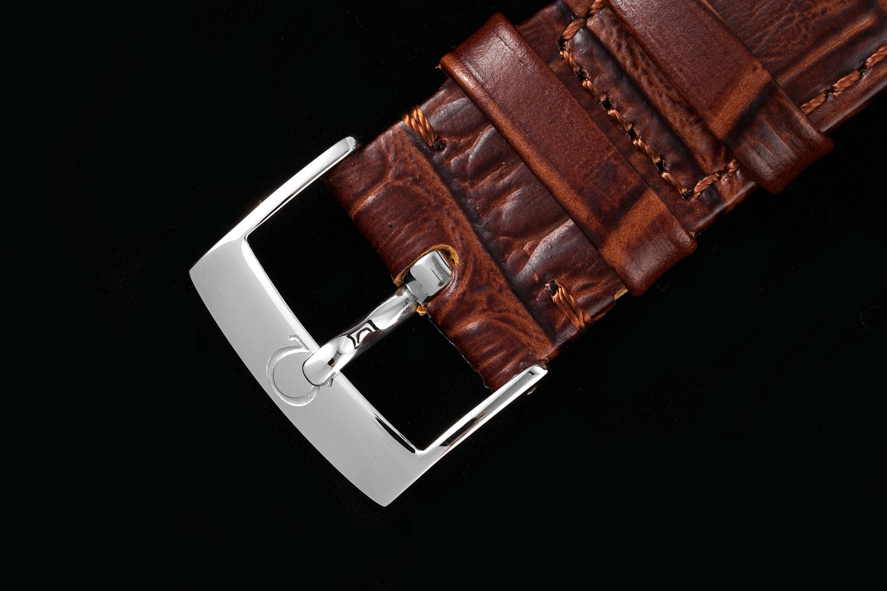 Strap: The strap is thick in the middle, flat on the sides, and meticulously stitched for a delicate and practical finish. It is paired with the classic Omega-style buckle
