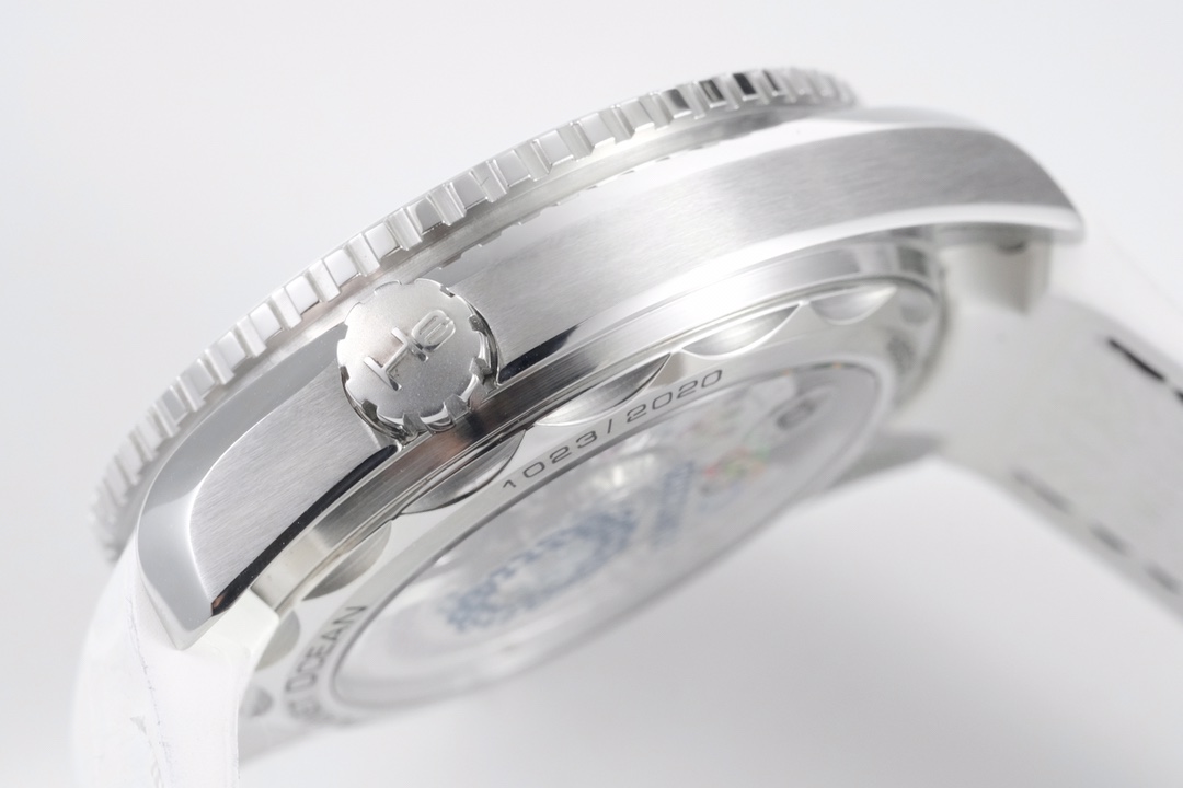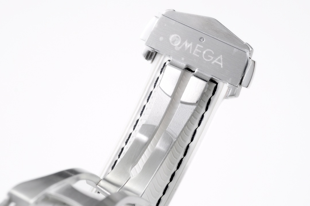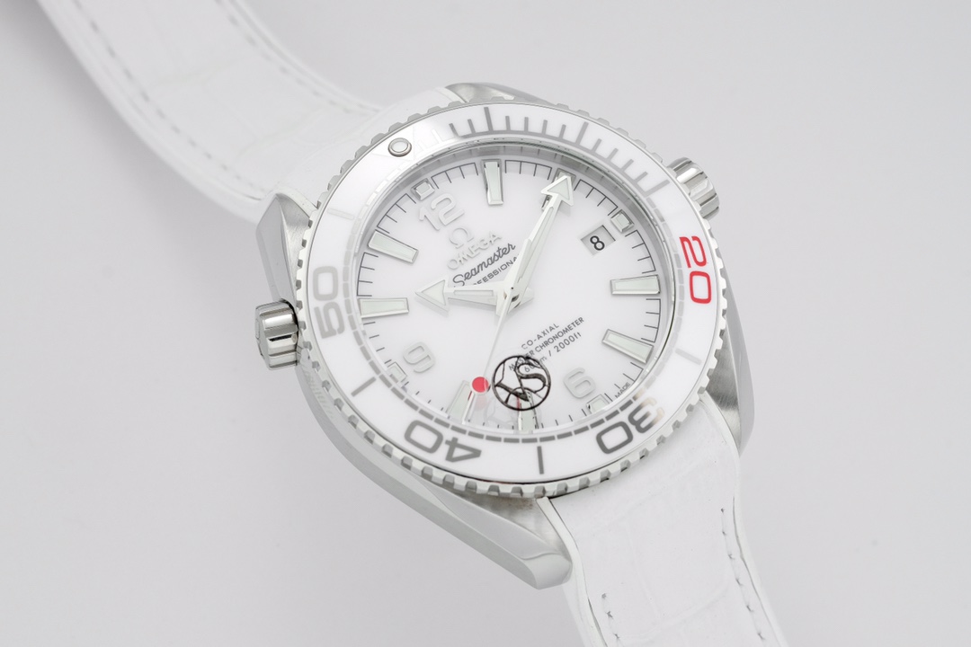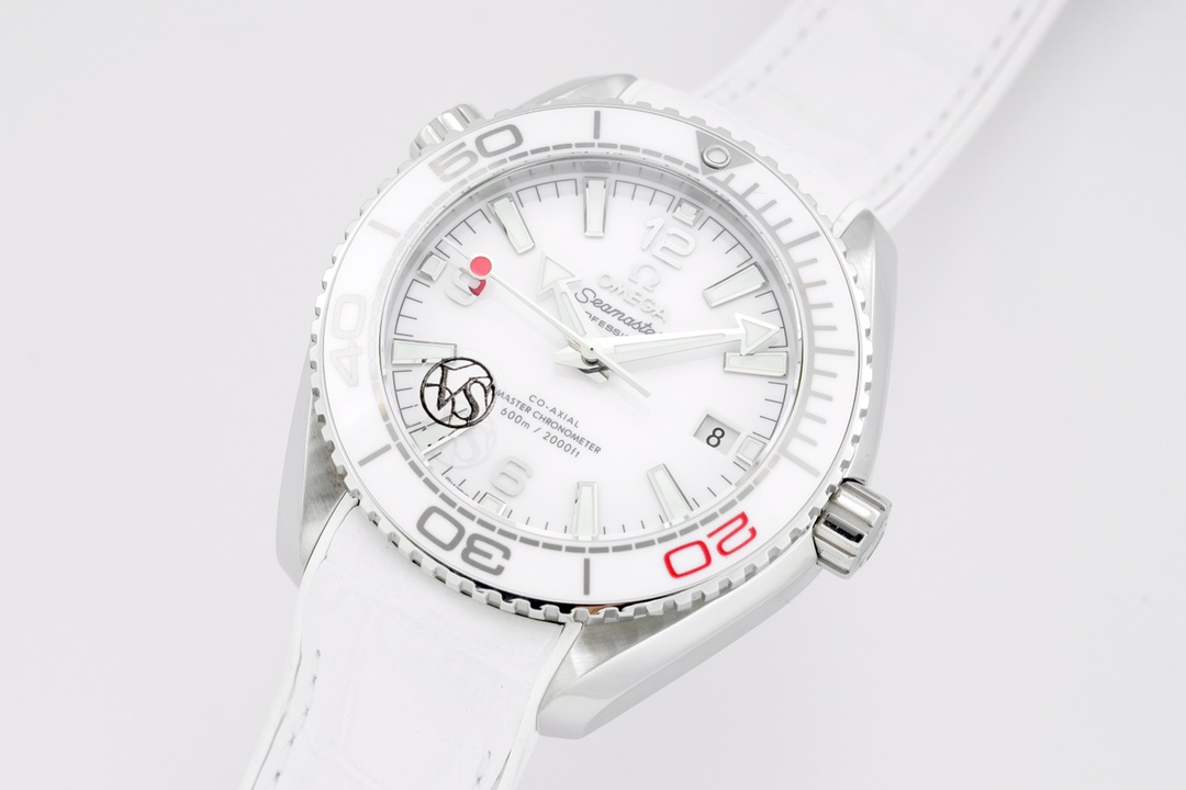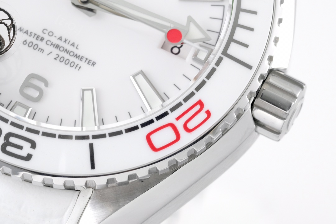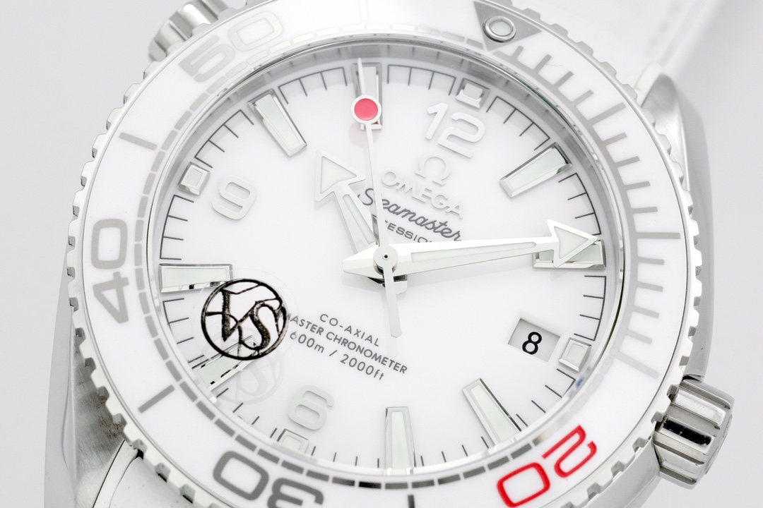 Dial: Polished white ceramic dial with a “lollipop” shaped central seconds hand, with a red tip.