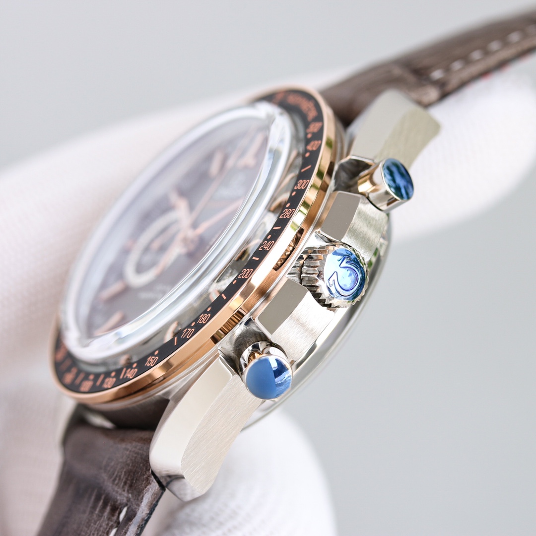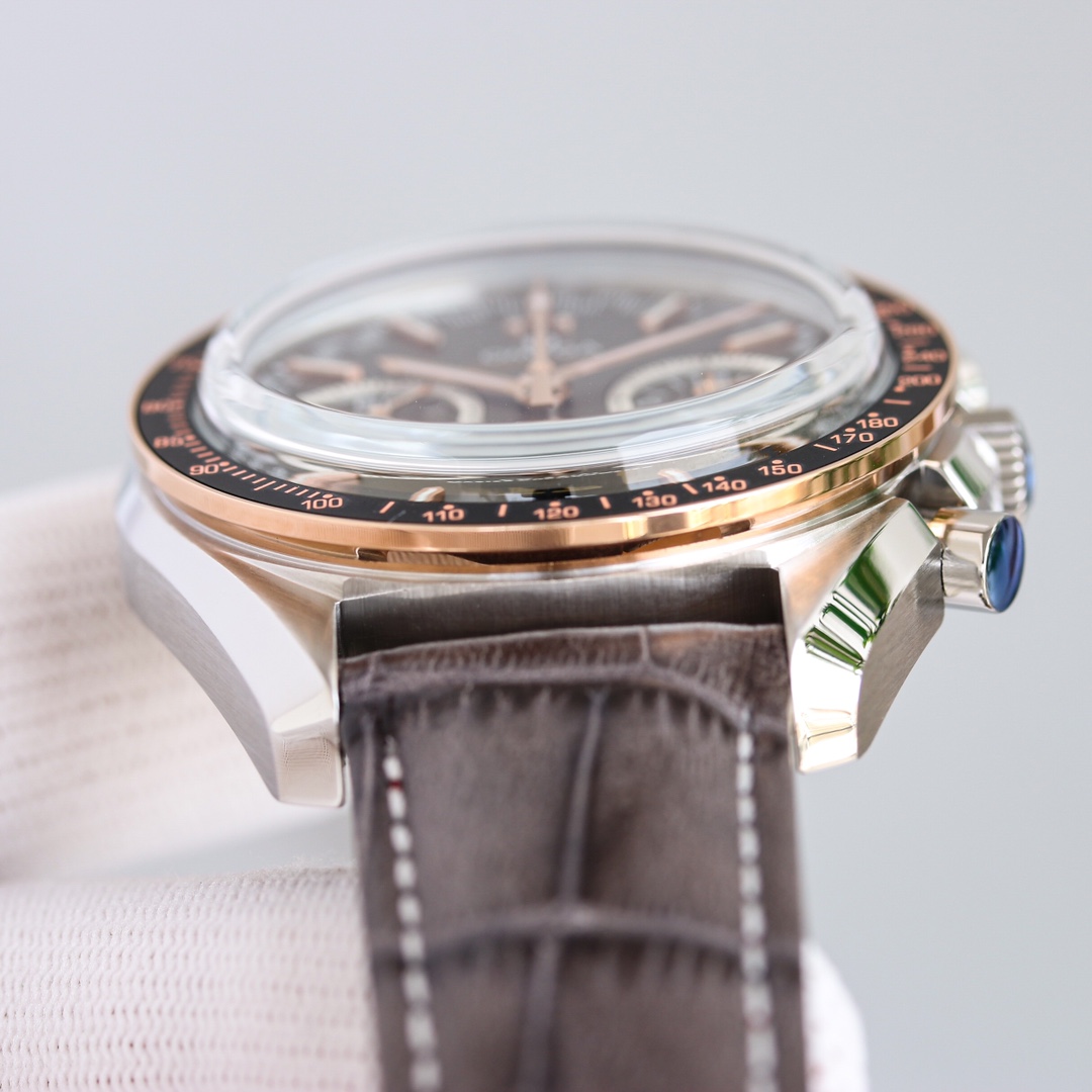 This watch features the Omega 9900 chronograph movement and the steel used is made of imported AISI316L special steel with hardened treatment, resulting in a hardness of 240HV. The sandblasted texture on the case is clear, delicate, and pure white, without any pores, perfectly reproducing the authentic material. The transparent curved sapphire crystal adds to the prominence of the dial. The matte dial is paired with platinum-plated indexes, and the luminous material is made of imported super luminous powder. The Supermaster Moonwatch series comes with a stainless steel bracelet and an imported leather strap, and the bracelet and ceramic bezel can be interchanged with the original version. We may never reach space, but we can at least own an Omega Moonwatch in our lifetime.