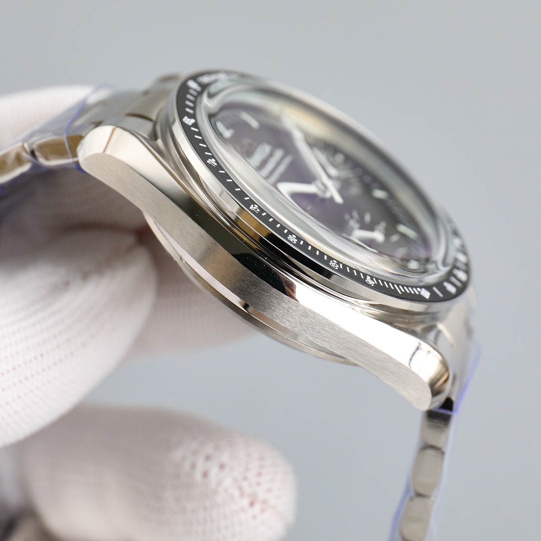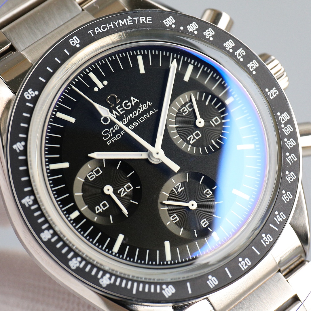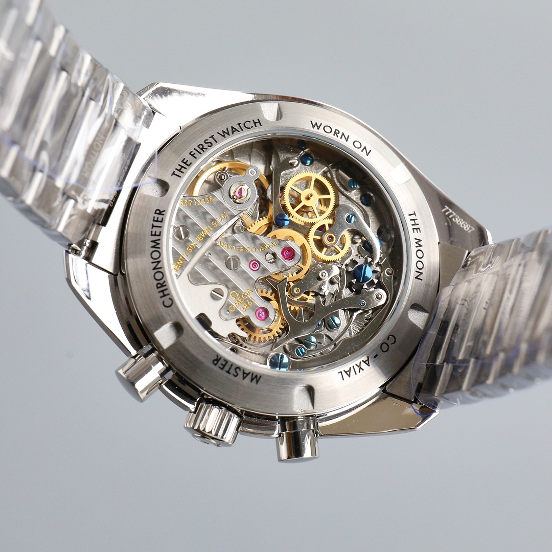 This Moonwatch is inspired by the style of the fourth generation Speedmaster watches. It comes with an integrated black rubber strap and is crafted from Moonshine 18K gold, giving it an elegant and timeless tone. The watch features a Moonshine 18K gold stepped dial with sunray brushed effect, blackened sub-dials and hour markers, a ceramic bezel adorned with a tachymeter scale made using OMEGA Ceragold technology, and the iconic Dot Over Ninety seen on early Speedmaster models, paying tribute to the illustrious lunar landing history of the Speedmaster.