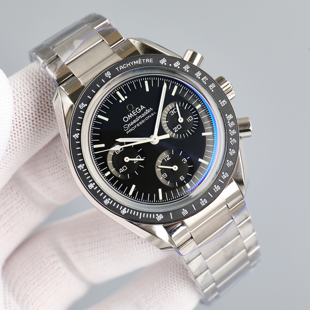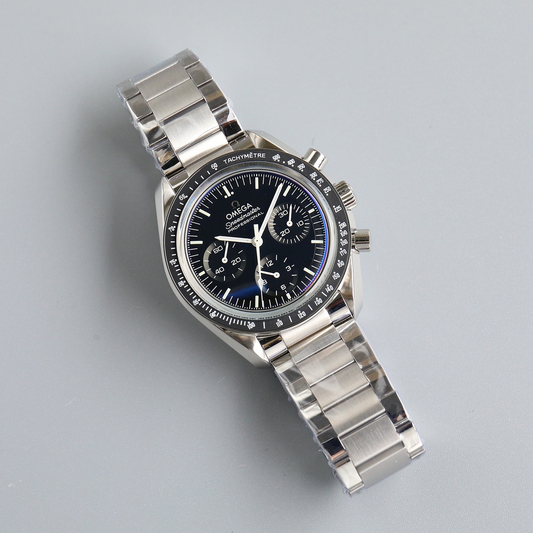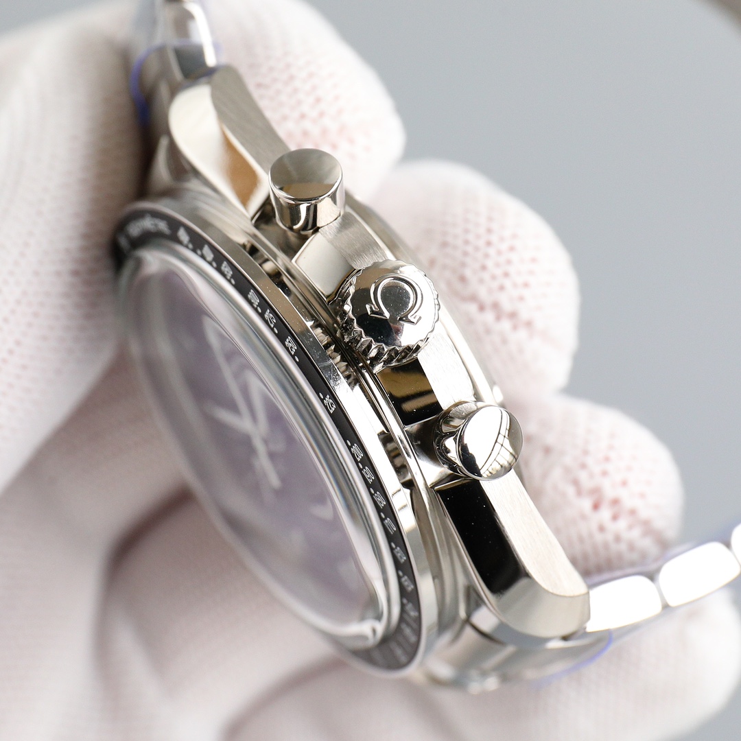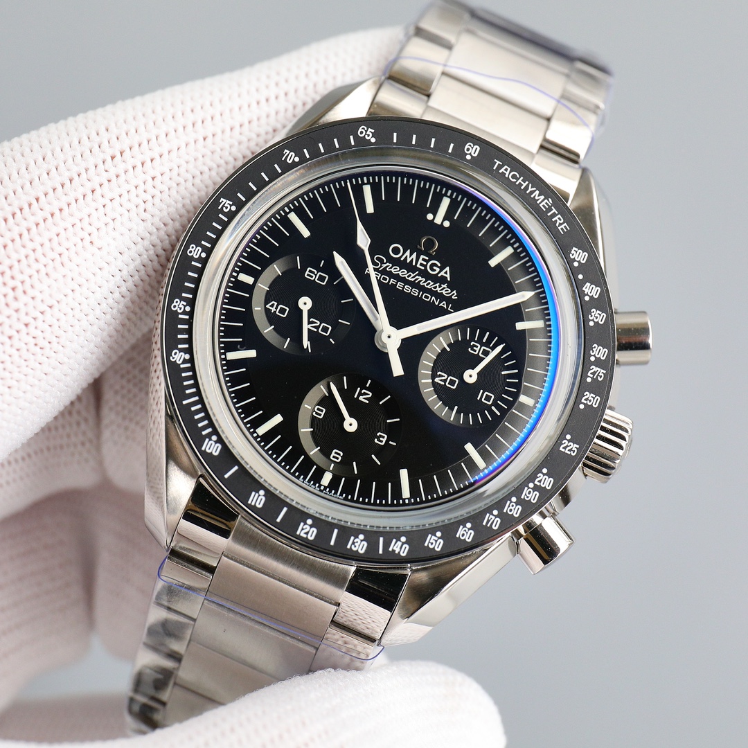 This Moonwatch is inspired by the style of the fourth generation Speedmaster watches. It comes with an integrated black rubber strap and is crafted from Moonshine 18K gold, giving it an elegant and timeless tone. The watch features a Moonshine 18K gold stepped dial with sunray brushed effect, blackened sub-dials and hour markers, a ceramic bezel adorned with a tachymeter scale made using OMEGA Ceragold technology, and the iconic Dot Over Ninety seen on early Speedmaster models, paying tribute to the illustrious lunar landing history of the Speedmaster.