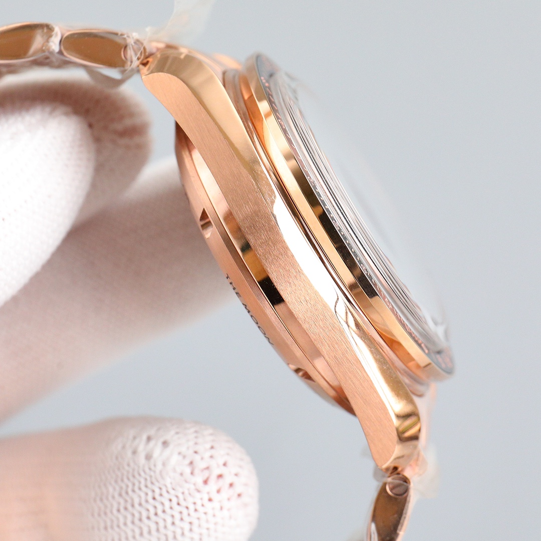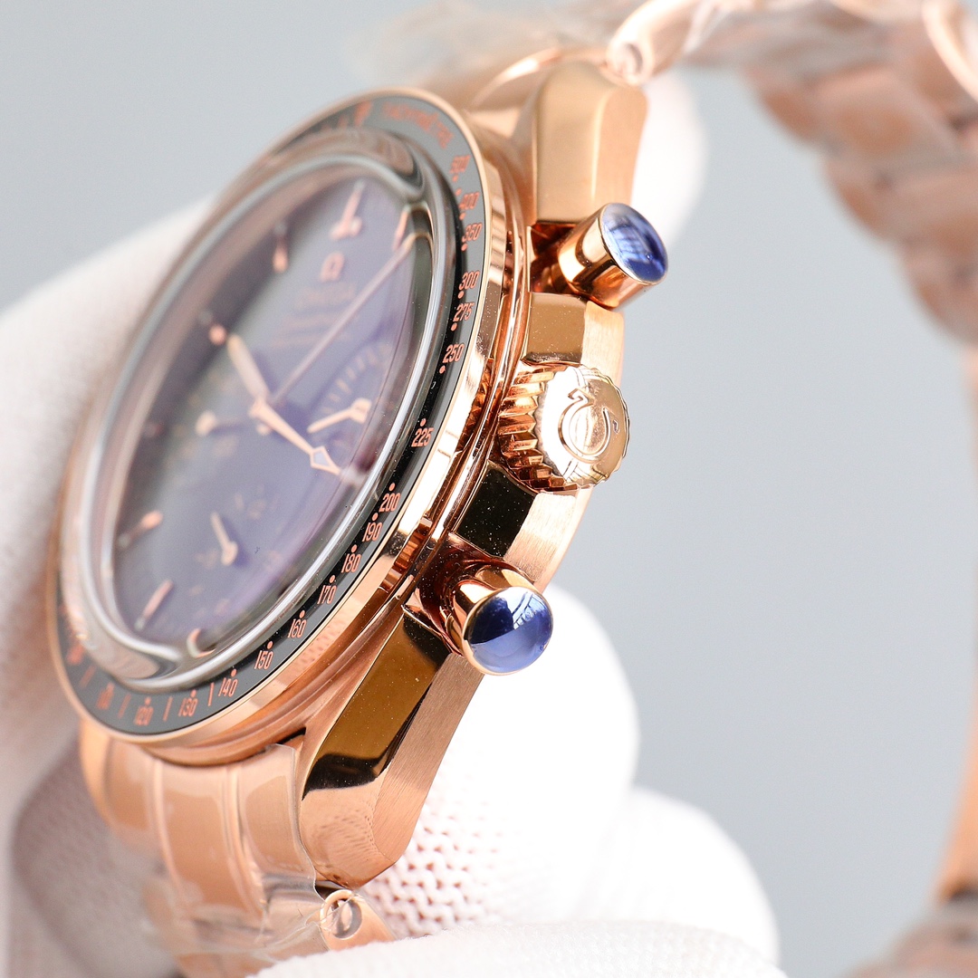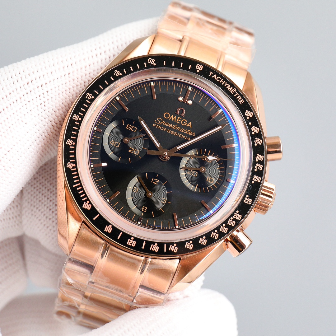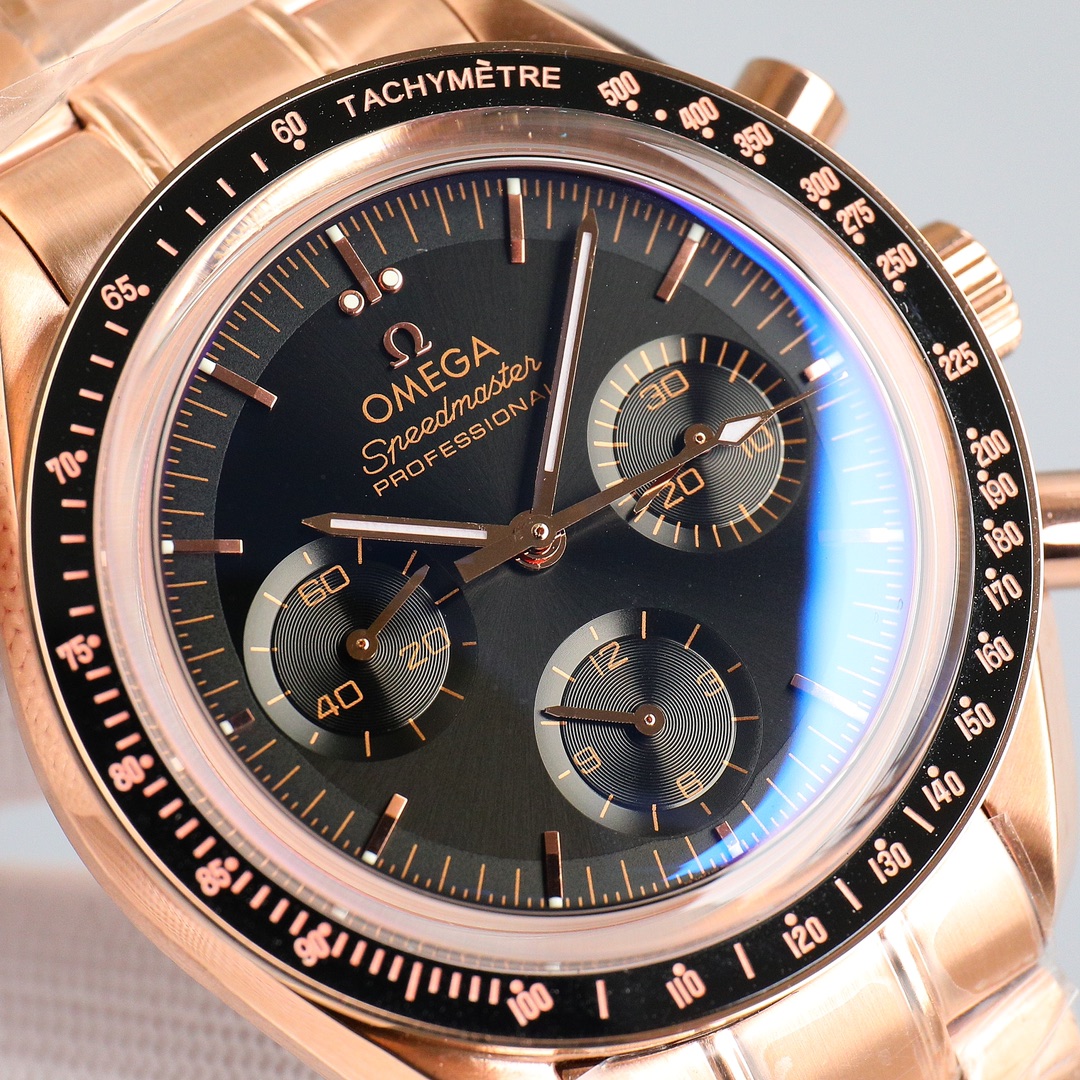 This Moonwatch is inspired by the style of the fourth generation Speedmaster watches. It comes with an integrated black rubber strap and is crafted from Moonshine 18K gold, giving it an elegant and timeless tone. The watch features a Moonshine 18K gold stepped dial with sunray brushed effect, blackened sub-dials and hour markers, a ceramic bezel adorned with a tachymeter scale made using OMEGA Ceragold technology, and the iconic Dot Over Ninety seen on early Speedmaster models, paying tribute to the illustrious lunar landing history of the Speedmaster.
