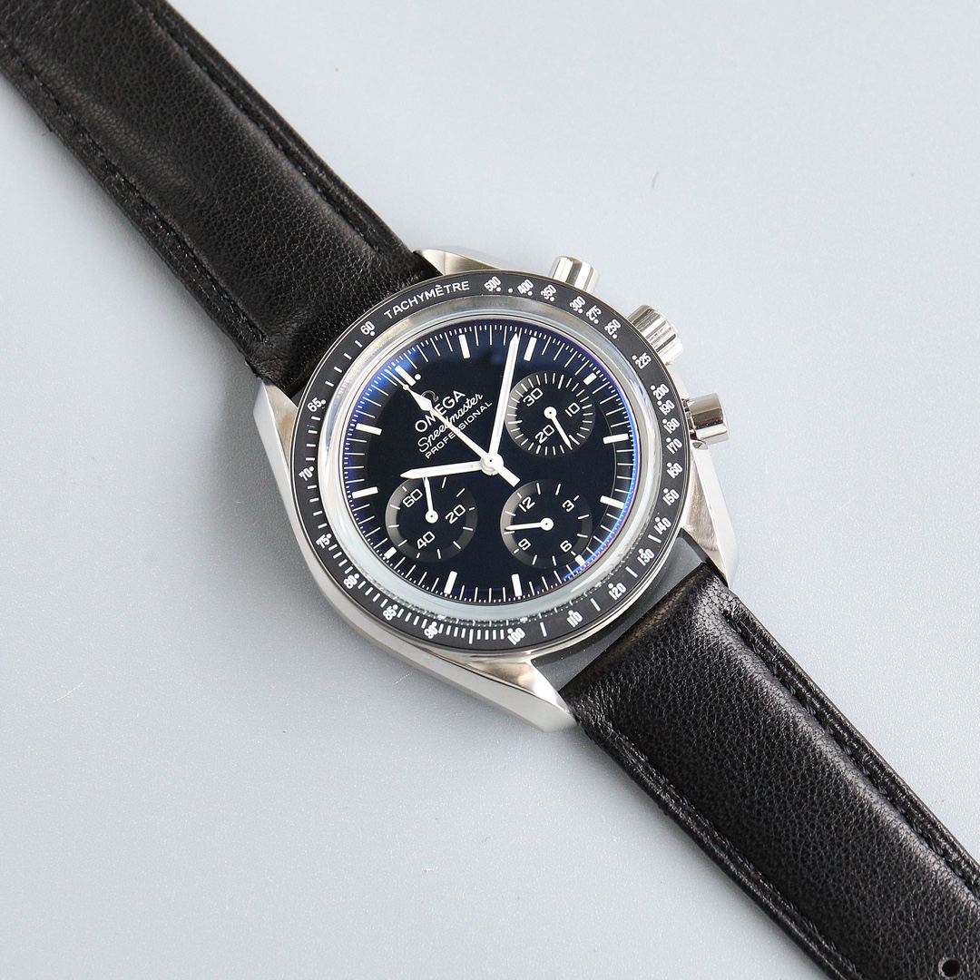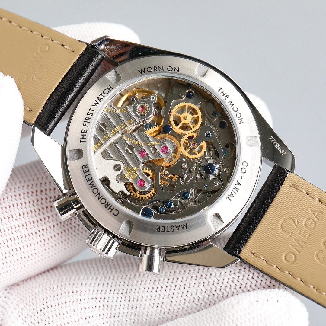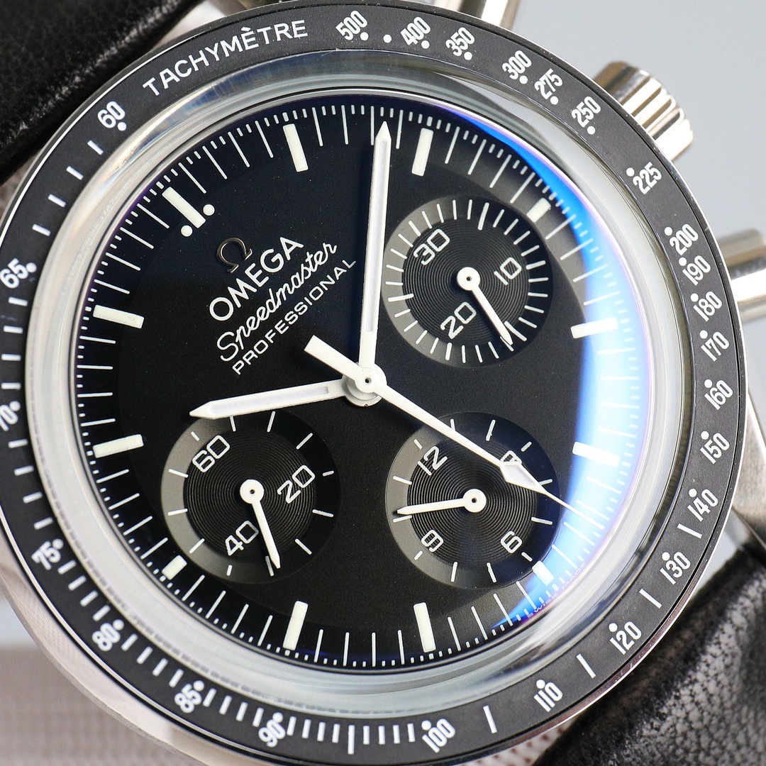 This Moonwatch is inspired by the style of the fourth generation Speedmaster watches. It comes with an integrated black rubber strap and is crafted from Moonshine 18K gold, giving it an elegant and timeless tone. The watch features a Moonshine 18K gold stepped dial with sunray brushed effect, blackened sub-dials and hour markers, a ceramic bezel adorned with a tachymeter scale made using OMEGA Ceragold technology, and the iconic Dot Over Ninety seen on early Speedmaster models, paying tribute to the illustrious lunar landing history of the Speedmaster.