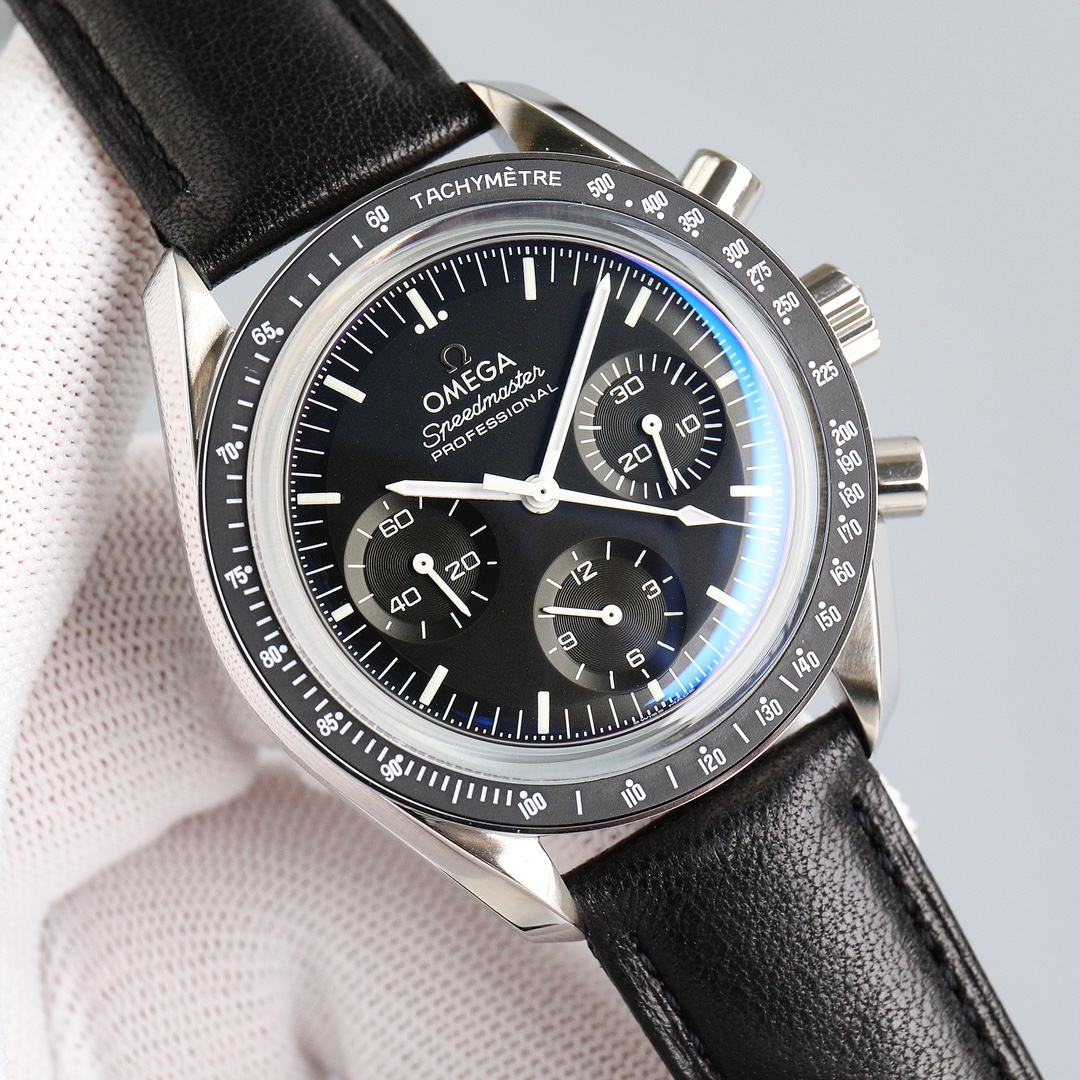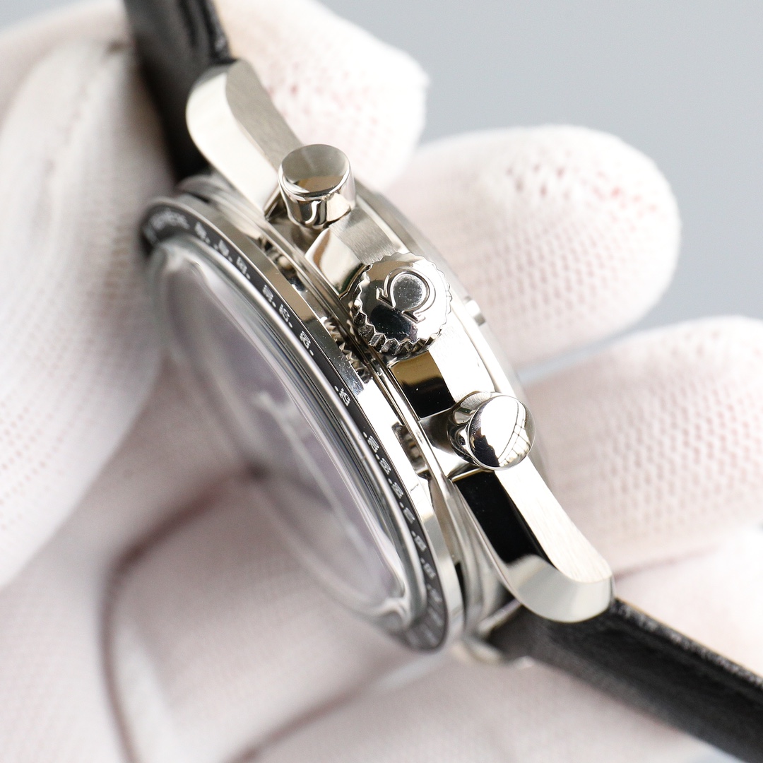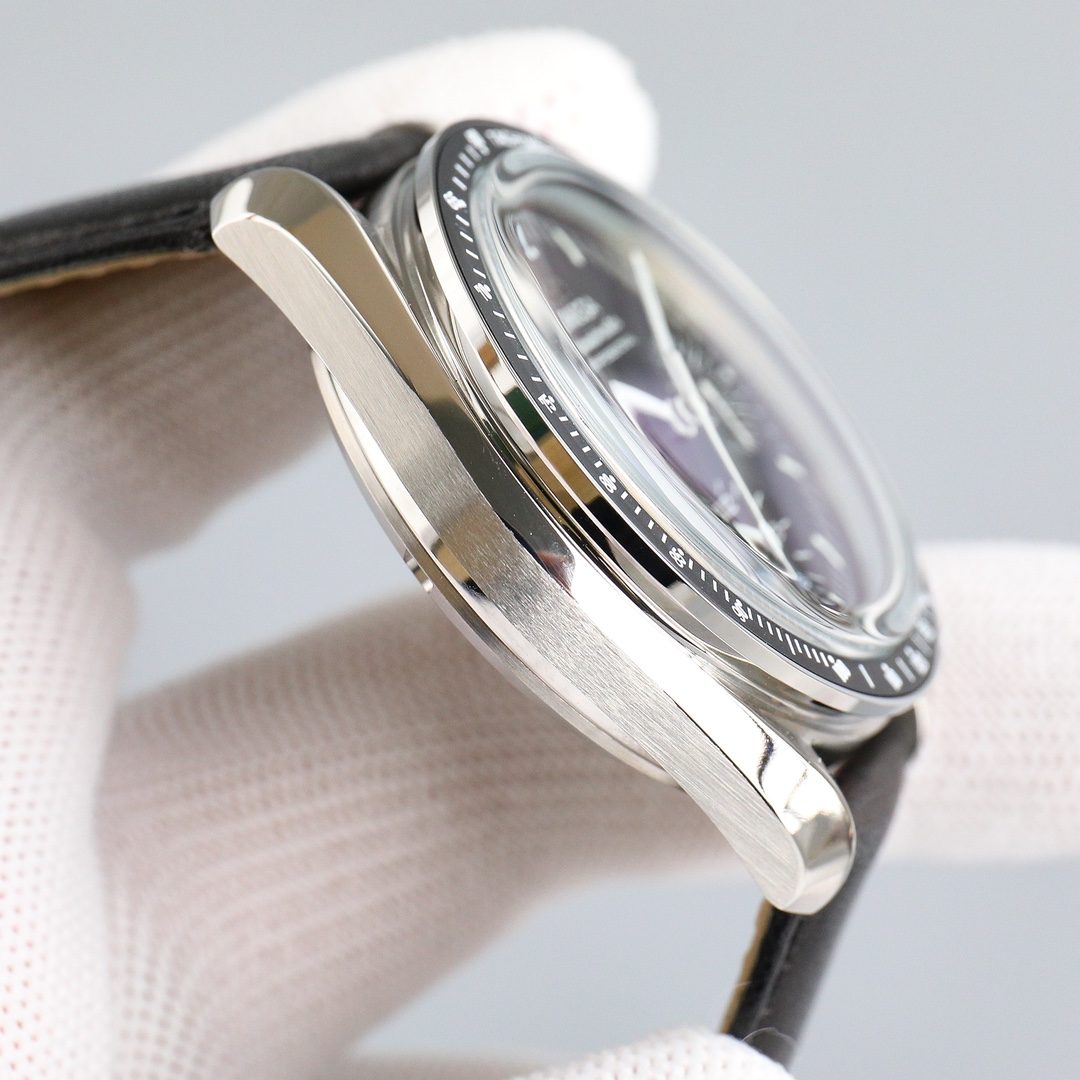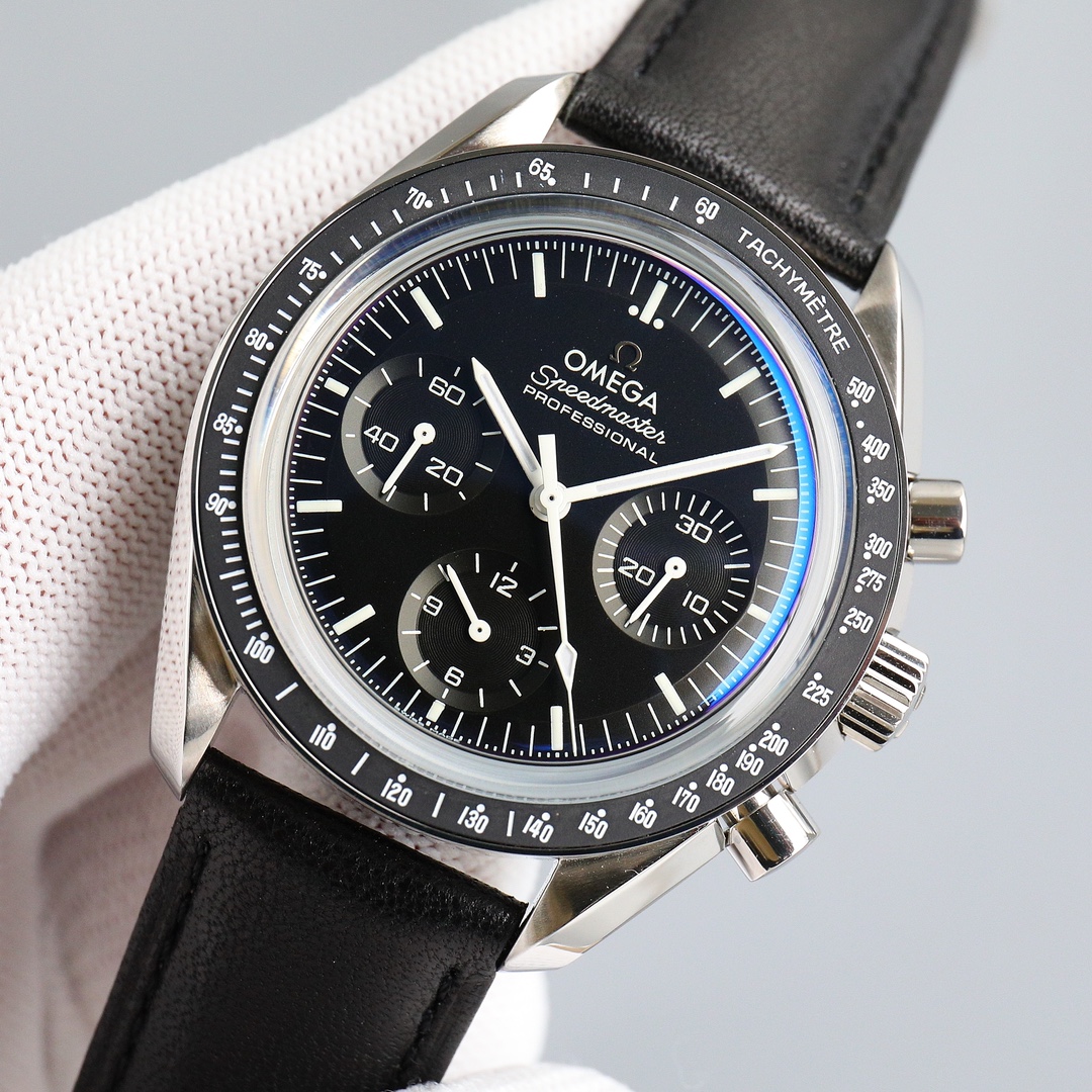 This Moonwatch is inspired by the style of the fourth generation Speedmaster watches. It comes with an integrated black rubber strap and is crafted from Moonshine 18K gold, giving it an elegant and timeless tone. The watch features a Moonshine 18K gold stepped dial with sunray brushed effect, blackened sub-dials and hour markers, a ceramic bezel adorned with a tachymeter scale made using OMEGA Ceragold technology, and the iconic Dot Over Ninety seen on early Speedmaster models, paying tribute to the illustrious lunar landing history of the Speedmaster.