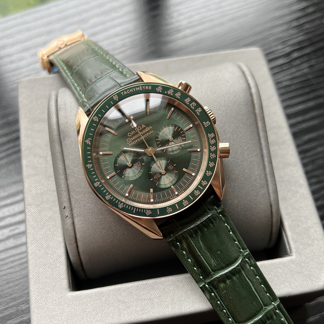 This watch features a green PVD-treated “step” dial with sunray polishing, moonwatch-style hands, and a green ceramic bezel adorned with a tachymeter scale made with OMEGA Ceragold technology. It also showcases the iconic “Dot over 90” (a dot positioned above the numeral 90) found in early Speedmaster models. The watch is protected by a scratch-resistant sapphire crystal with anti-reflective treatment.