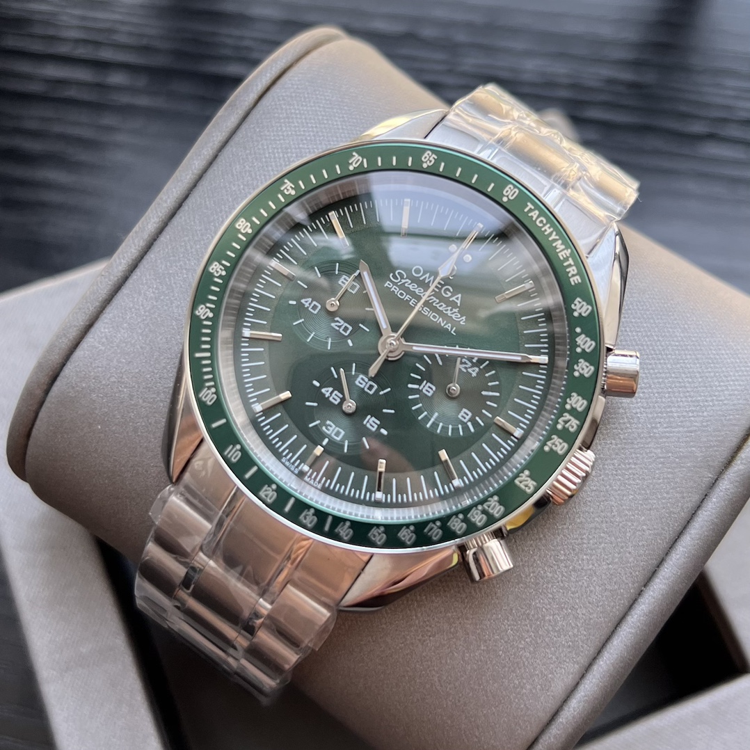 This watch features a green PVD-treated “step” dial with sunray polishing, moonwatch-style hands, and a green ceramic bezel adorned with a tachymeter scale made with OMEGA Ceragold technology. It also showcases the iconic “Dot over 90” (a dot positioned above the numeral 90) found in early Speedmaster models. The watch is protected by a scratch-resistant sapphire crystal with anti-reflective treatment.