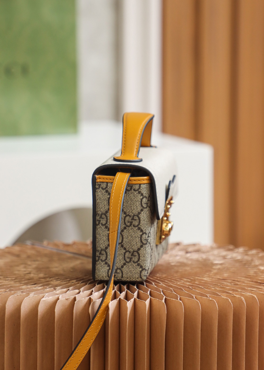 A mini version of the archival style, the Padlock is defined by its signature lock and key closure. The accessory is crafted from beige and ebony GG Supreme canvas with a white leather top. Adding a pop of colour, burnt orange leather details complete the mini bag.