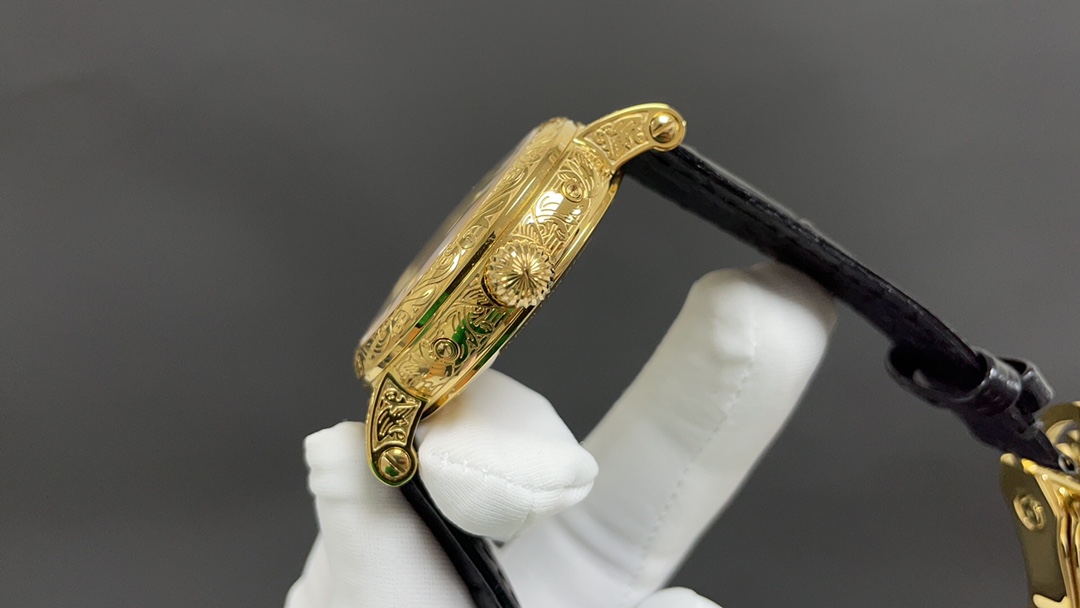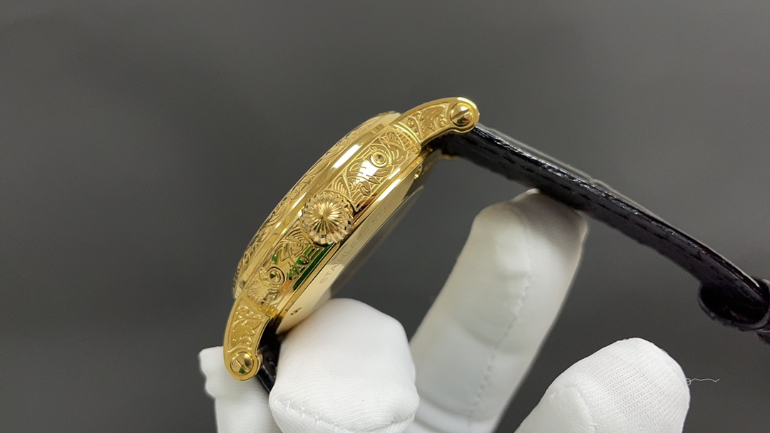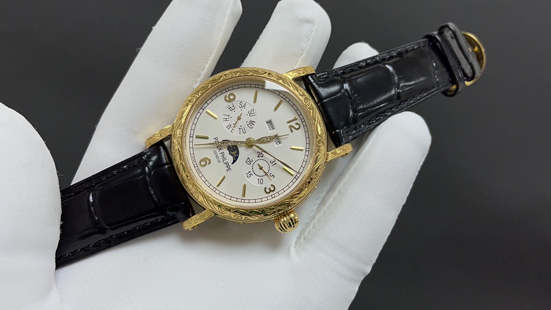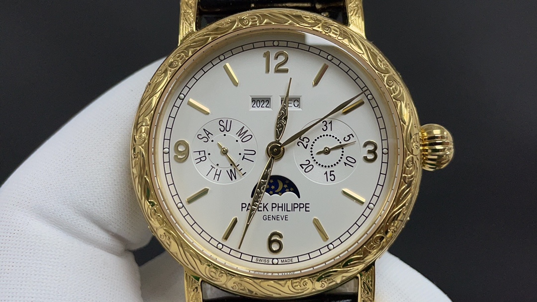 Dial: The dial features minute and second scales along the periphery, with gold Arabic numerals and raised circular hour markers, adding a sense of depth. The hour and minute hands are based on the “Baton” design, with sharp and elongated tips, reminiscent of the hands on the 1950s Ref. 1463 chronograph. The moon phase display and date sub-dial are located at 6 o’clock, and all the indications of the perpetual calendar are easily readable at a glance.