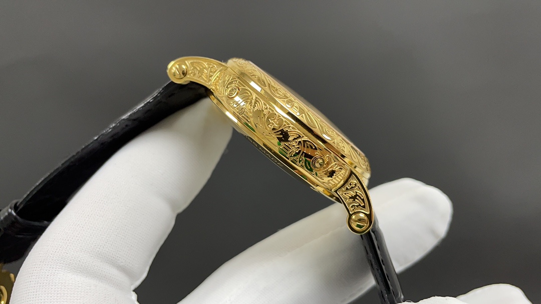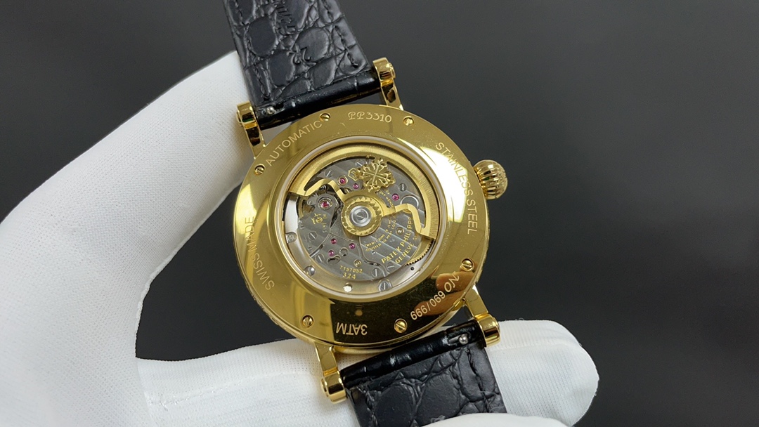 Movement: Equipped with a modified version of the Caliber 324 S Q self-winding movement, which is a refined version of the legendary Caliber 324 automatic movement. The movement features chamfered bridges with finely polished edges, a fish-scale pattern on the main bridge, Geneva waves on the rotor, and gold engraving on the bridge surfaces. The screw slots are also polished and chamfered, and even the holes are treated with the same level of craftsmanship.