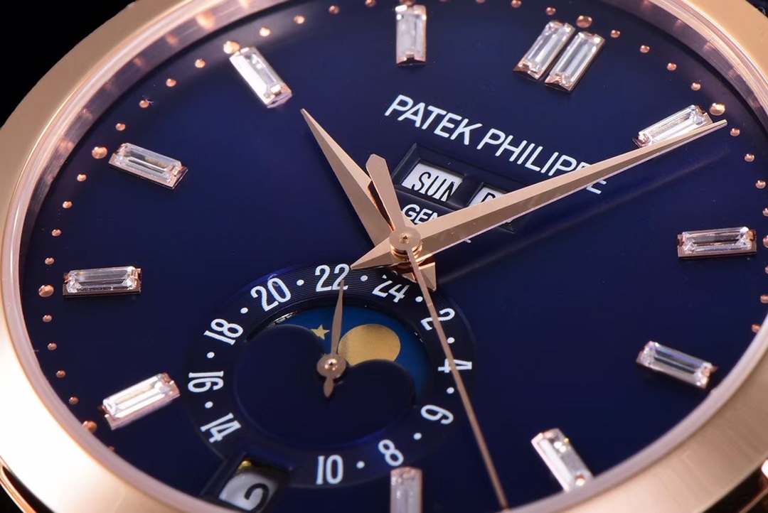 1. Functions: The new generation GR 5396 moon phase disc rotates once a month synchronously with the original. A hidden button at the five o’clock position allows for quick adjustment of the moon phase. The stars and moon on the moon phase disc are sandblasted, just like the original. The crown in the second position can quickly adjust the calendar, and the crown in the third position adjusts the time along with the 24-hour hand. At the twelve o’clock position, there are the weekday and month displays, which can be quickly adjusted using the side buttons at the ten o’clock and three o’clock positions. All functions automatically transition with the passage of time.