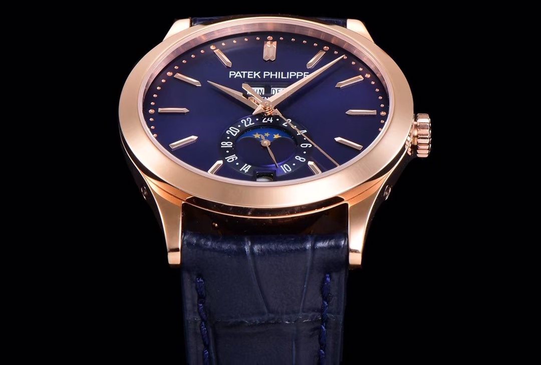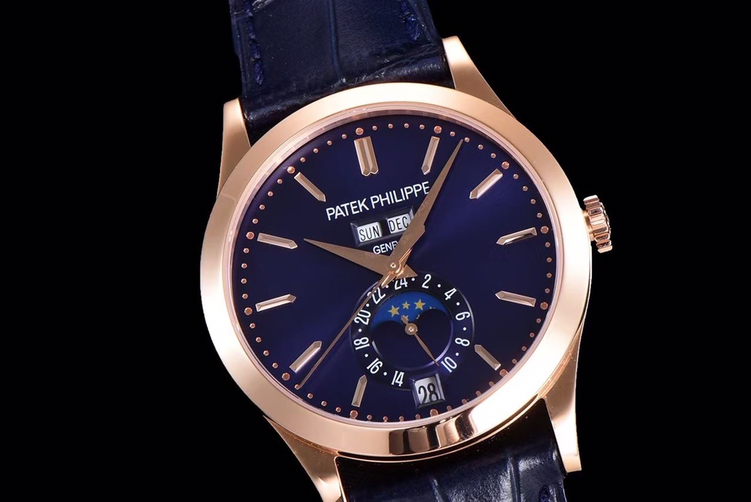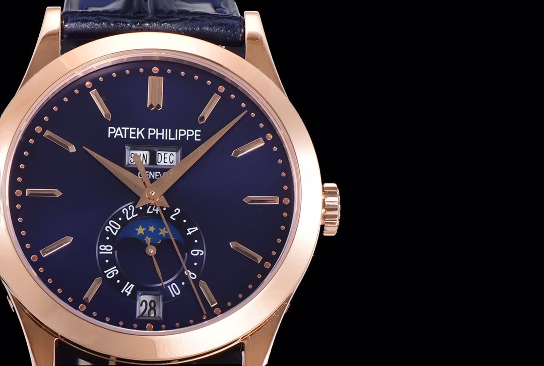1. Functions: The new generation GR 5396 moon phase disc rotates once a month synchronously with the original. A hidden button at the five o’clock position allows for quick adjustment of the moon phase. The stars and moon on the moon phase disc are sandblasted, just like the original. The crown in the second position can quickly adjust the calendar, and the crown in the third position adjusts the time along with the 24-hour hand. At the twelve o’clock position, there are the weekday and month displays, which can be quickly adjusted using the side buttons at the ten o’clock and three o’clock positions. All functions automatically transition with the passage of time.