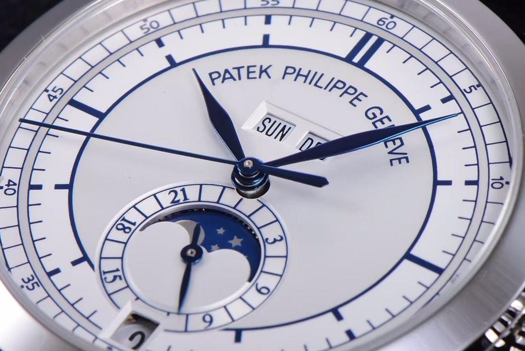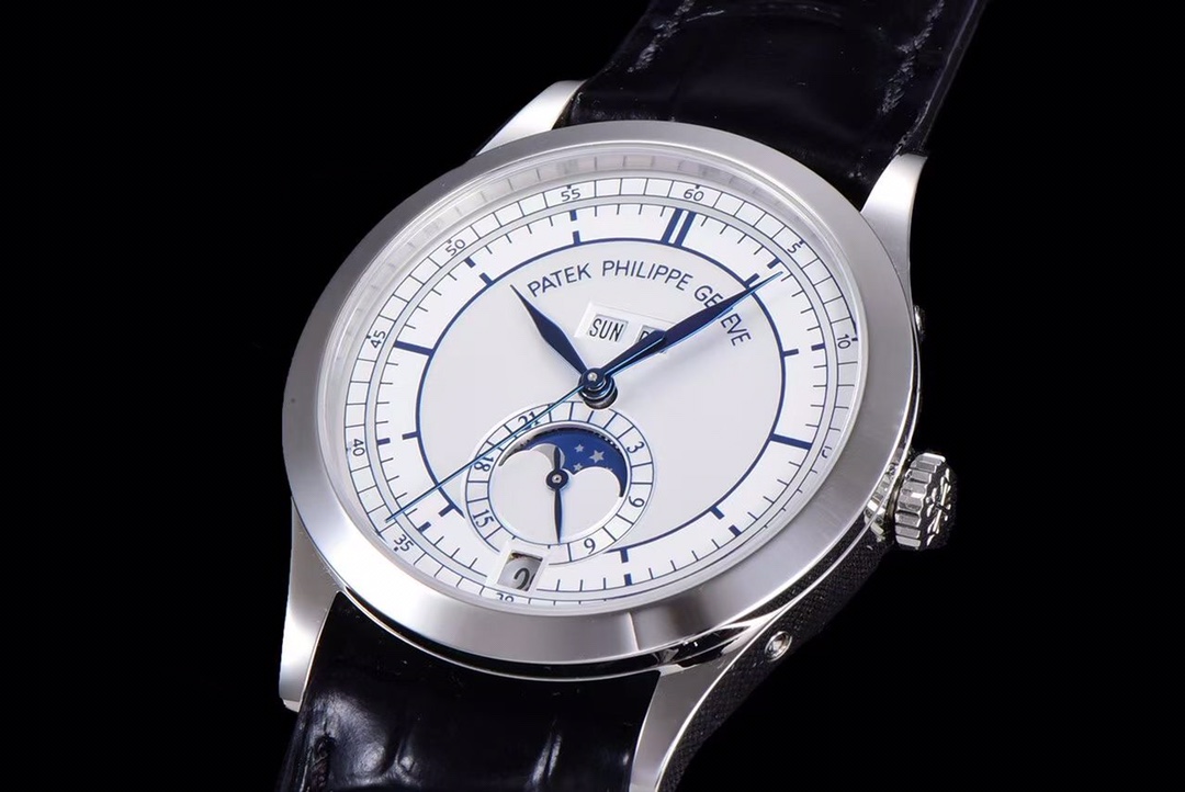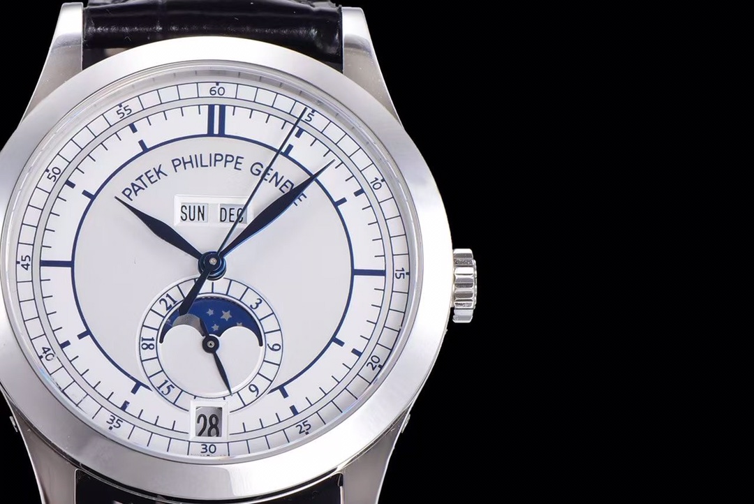 1. Functions: The new generation GR 5396 moon phase disc rotates once a month synchronously with the original. A hidden button at the five o’clock position allows for quick adjustment of the moon phase. The stars and moon on the moon phase disc are sandblasted, just like the original. The crown in the second position can quickly adjust the calendar, and the crown in the third position adjusts the time along with the 24-hour hand. At the twelve o’clock position, there are the weekday and month displays, which can be quickly adjusted using the side buttons at the ten o’clock and three o’clock positions. All functions automatically transition with the passage of time.