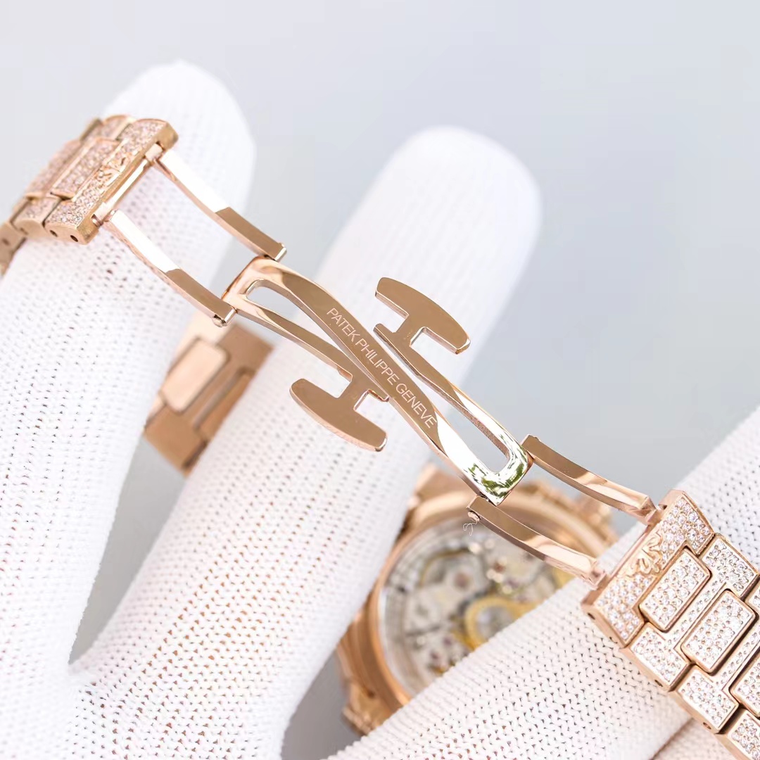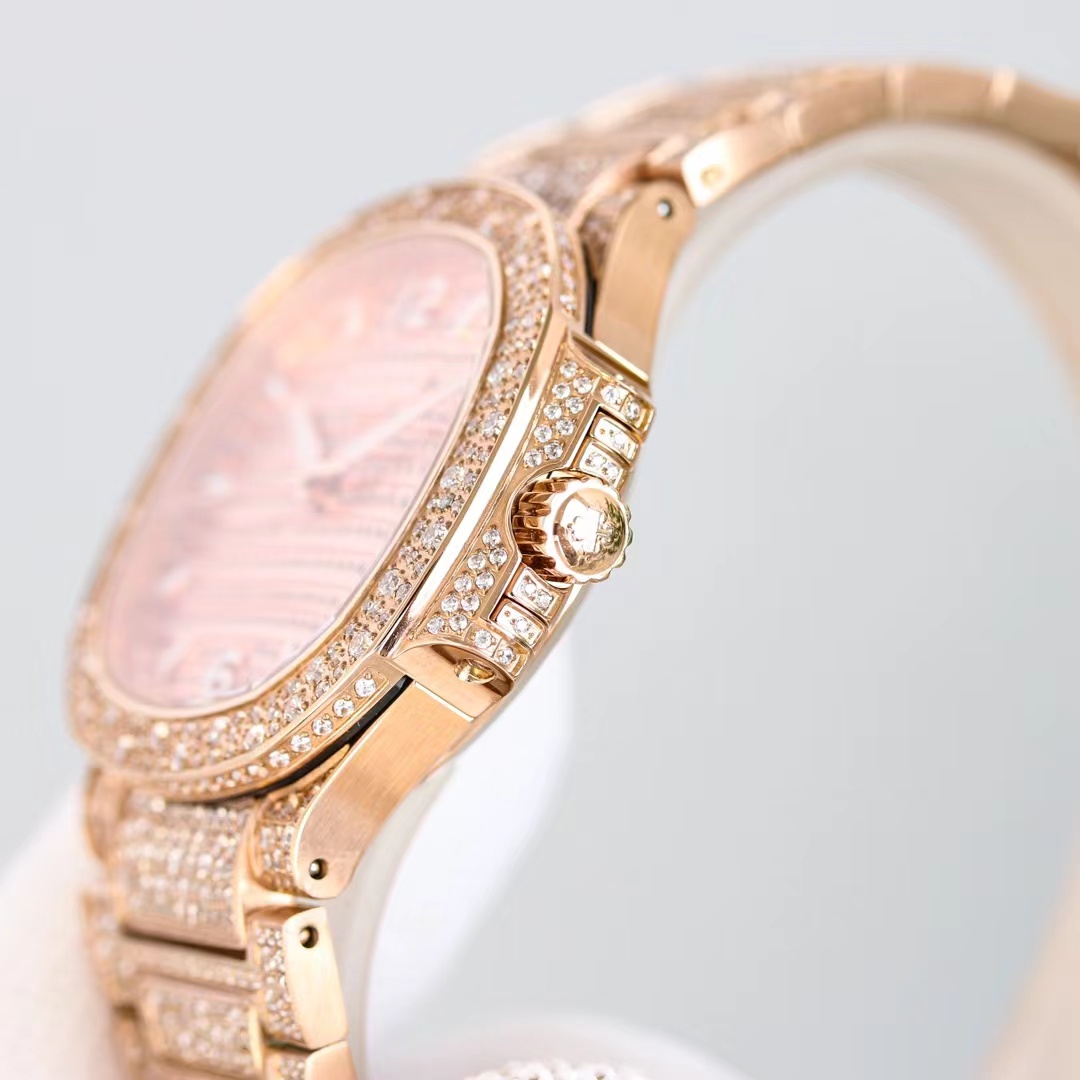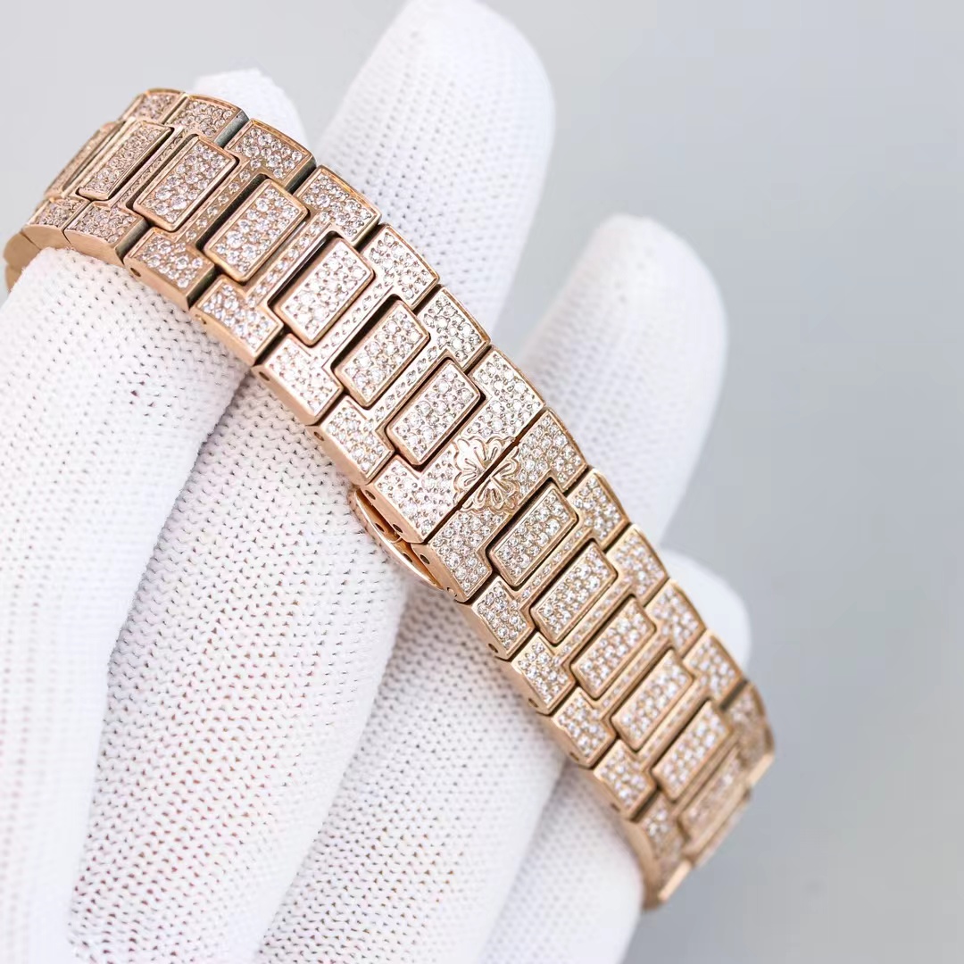 The top-of-the-line Patek Philippe 7118 Ladies’ Nautilus is the epitome of luxury. It is an irresistible timepiece with its full diamond embellishment, sparkling on both the dial and bracelet. The watch is available in either vacuum furnace white gold or nano-rose gold (white for vacuum furnace white gold, and rose for nano-rose gold).