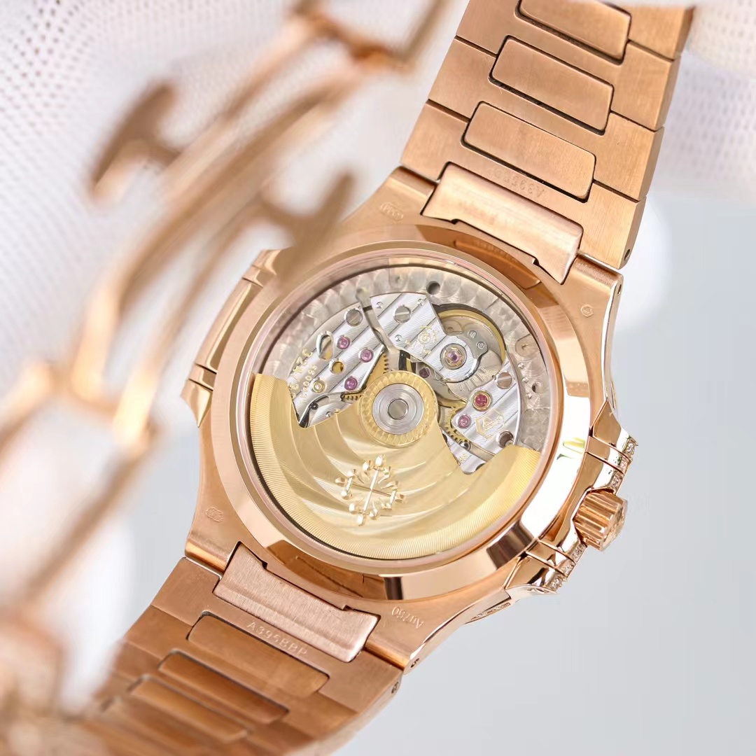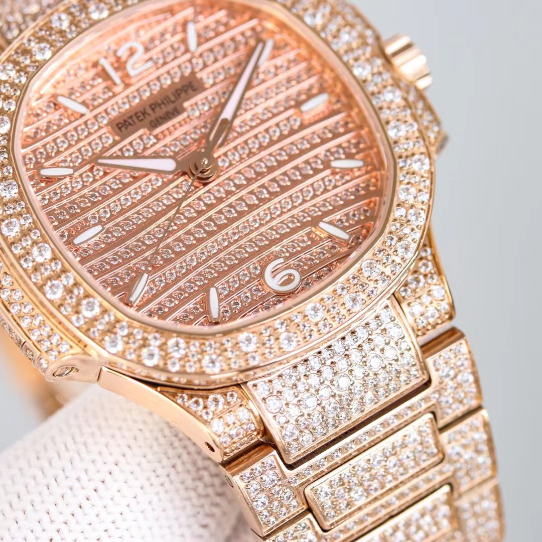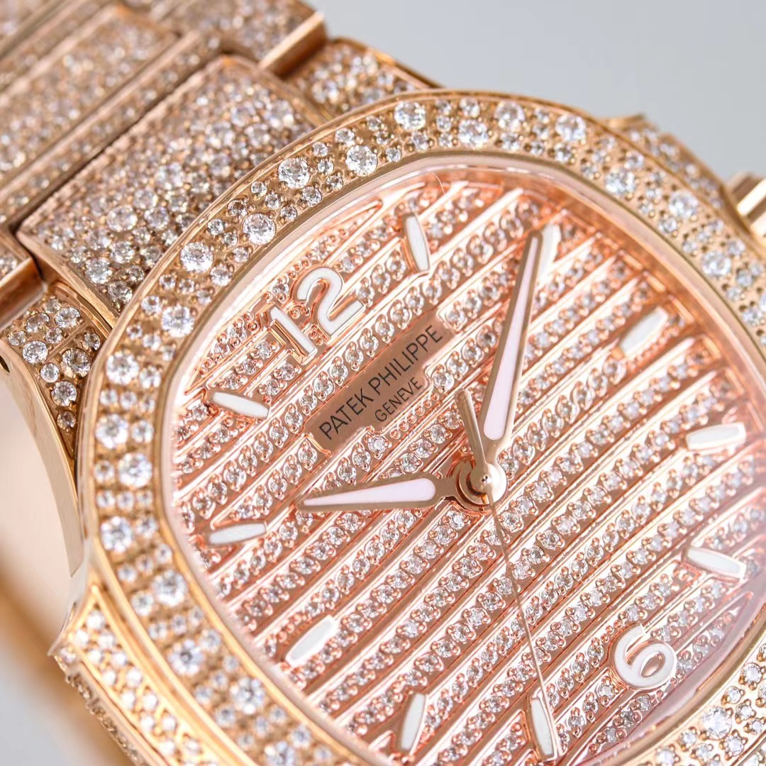 The top-of-the-line Patek Philippe 7118 Ladies’ Nautilus is the epitome of luxury. It is an irresistible timepiece with its full diamond embellishment, sparkling on both the dial and bracelet. The watch is available in either vacuum furnace white gold or nano-rose gold (white for vacuum furnace white gold, and rose for nano-rose gold).