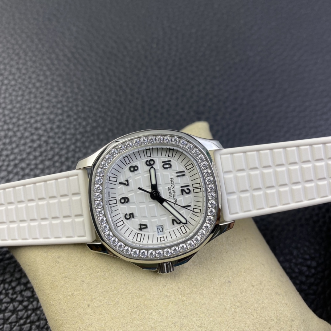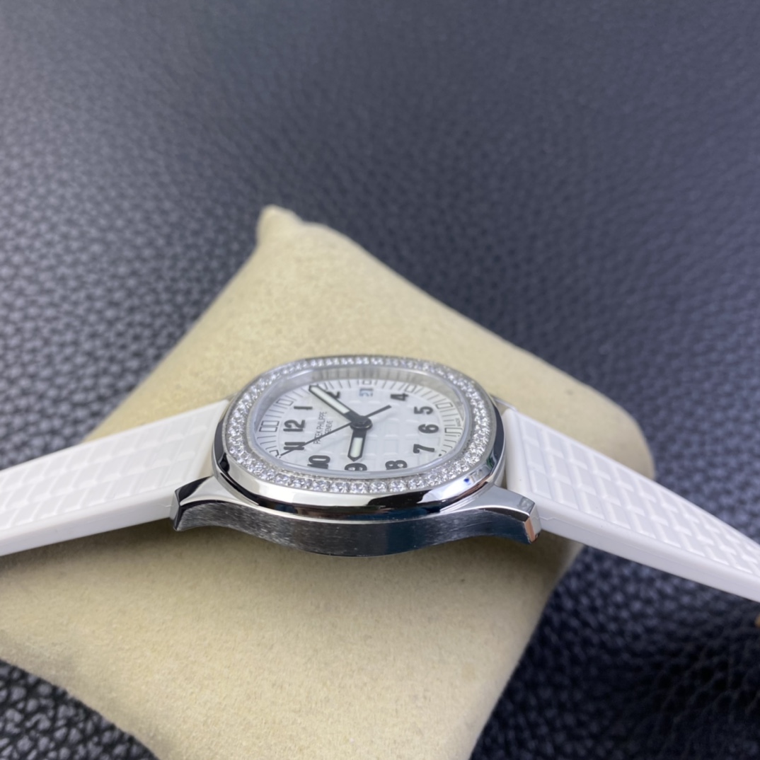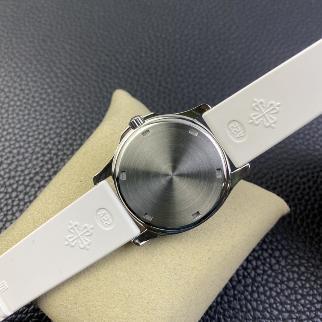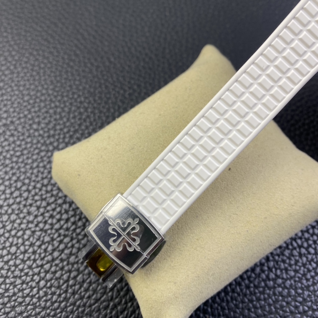 4. Clasp: Perfectly cloned Aquanaut classic fold-over clasp. Even the smallest corners are chamfered to ensure the same comfort as the authentic piece. The screw-in crown design and solid case back align with the original.