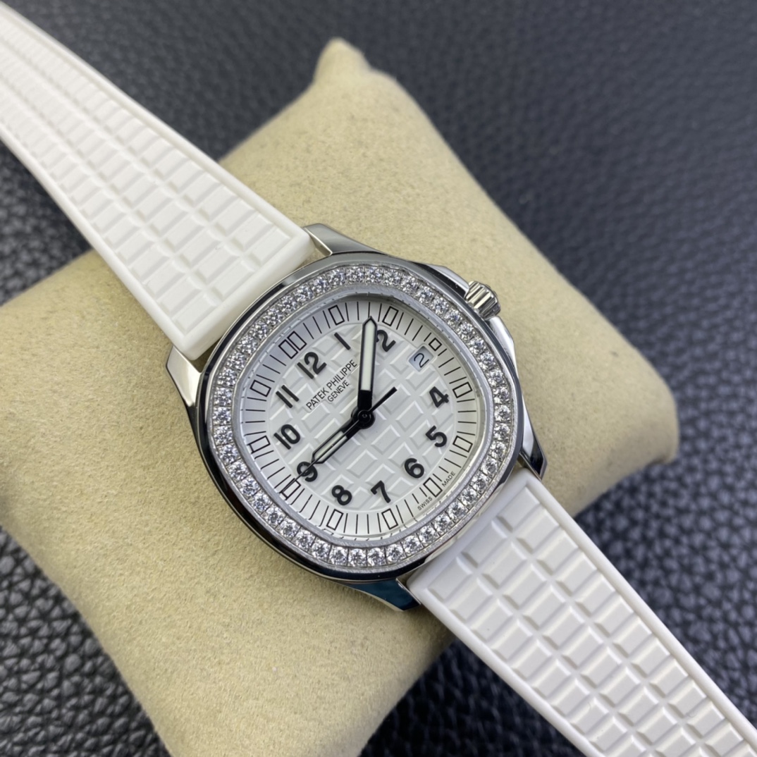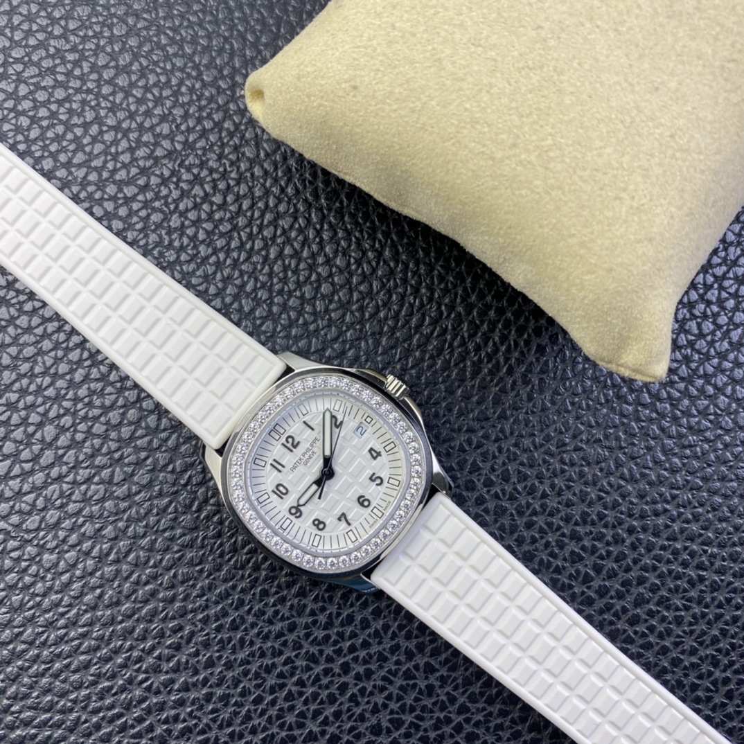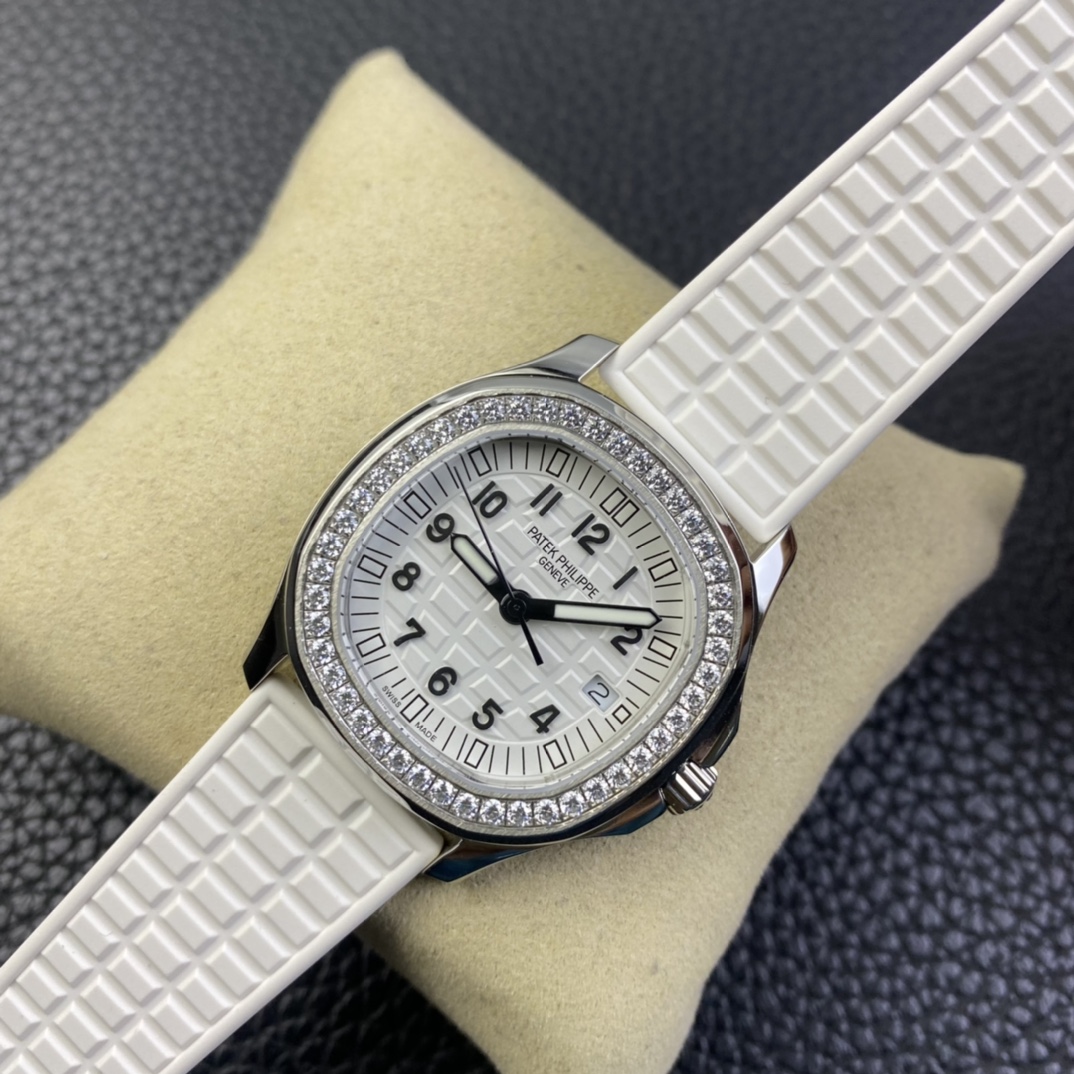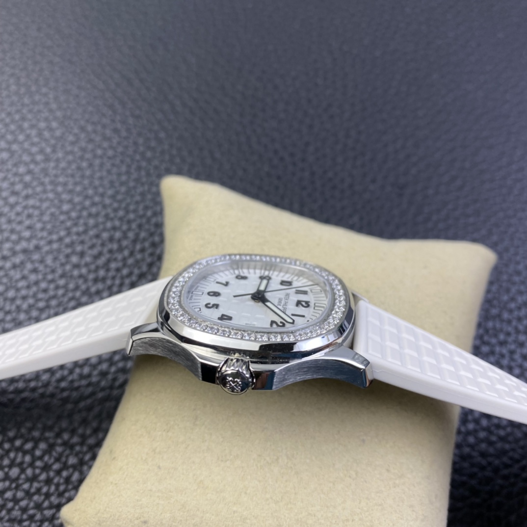 4. Clasp: Perfectly cloned Aquanaut classic fold-over clasp. Even the smallest corners are chamfered to ensure the same comfort as the authentic piece. The screw-in crown design and solid case back align with the original.