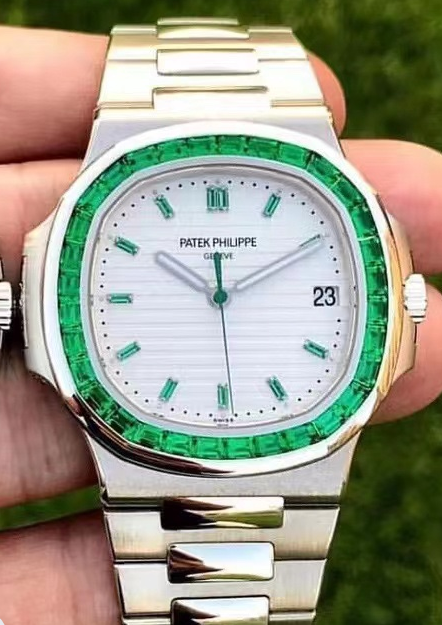 Exquisite diamonds are meticulously set on the case, reflecting a beautiful radiance. The presence of rubies and emeralds enhances the Nautilus’s elegance and sophistication.