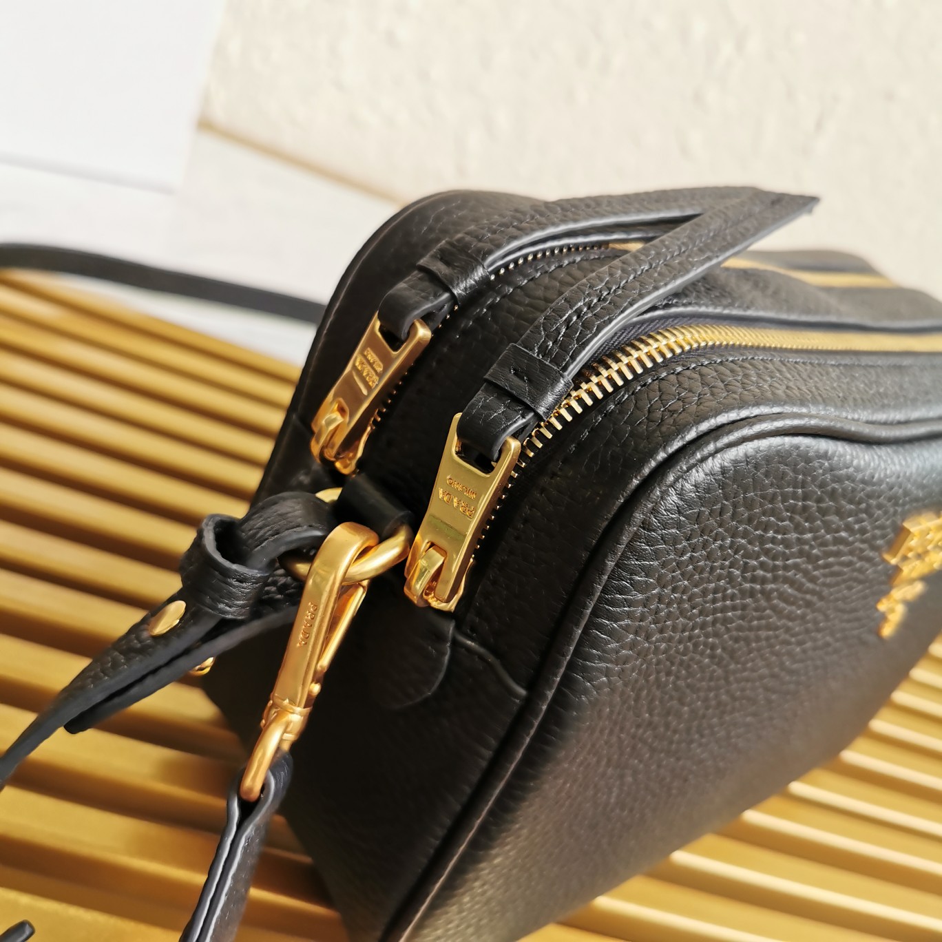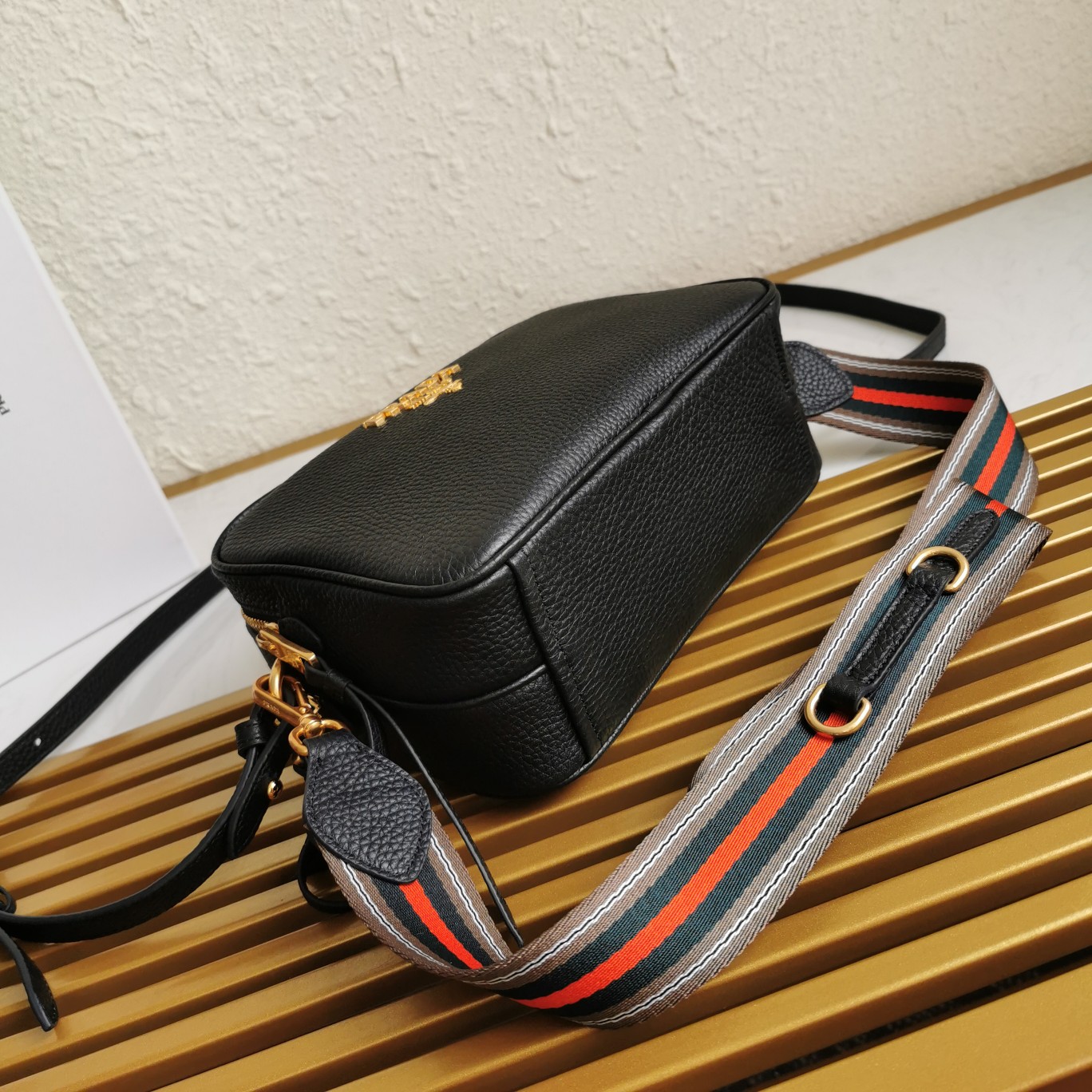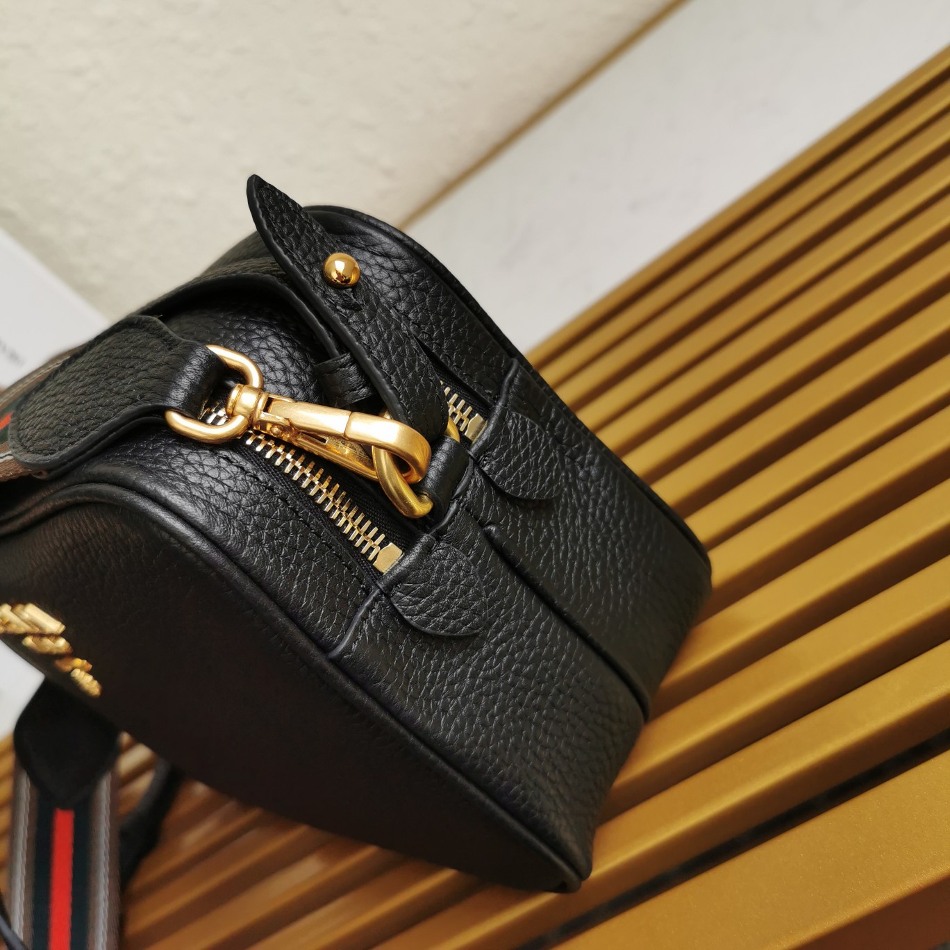 This is an original and popular item, made of Prada’s textured small cowhide leather. It features adjustable double shoulder straps, a detachable leather shoulder strap, and a detachable colored fabric shoulder strap. The bag is adorned with gold-plated hardware, metal engraved logo, two zipper compartments, Prada logo lining, and it is synchronized with the items available at Prada’s official stores.