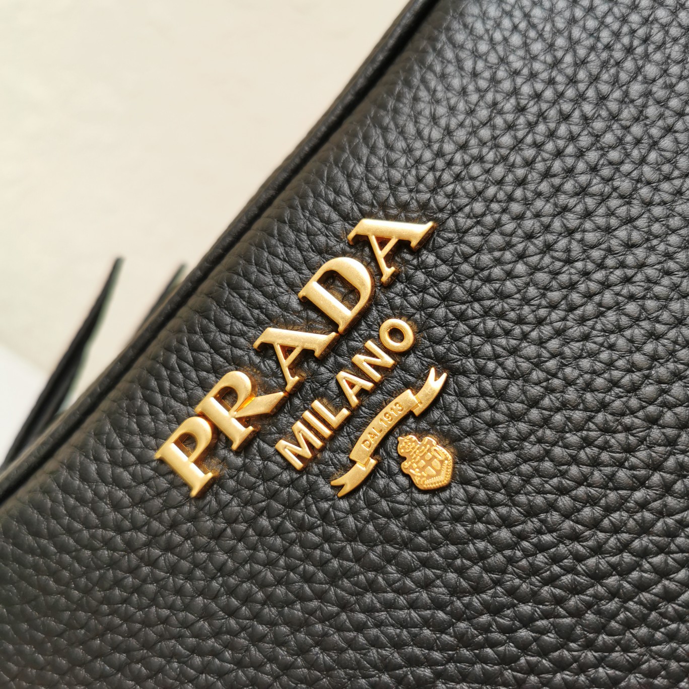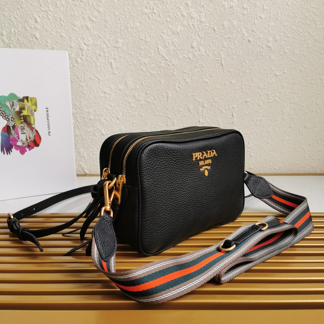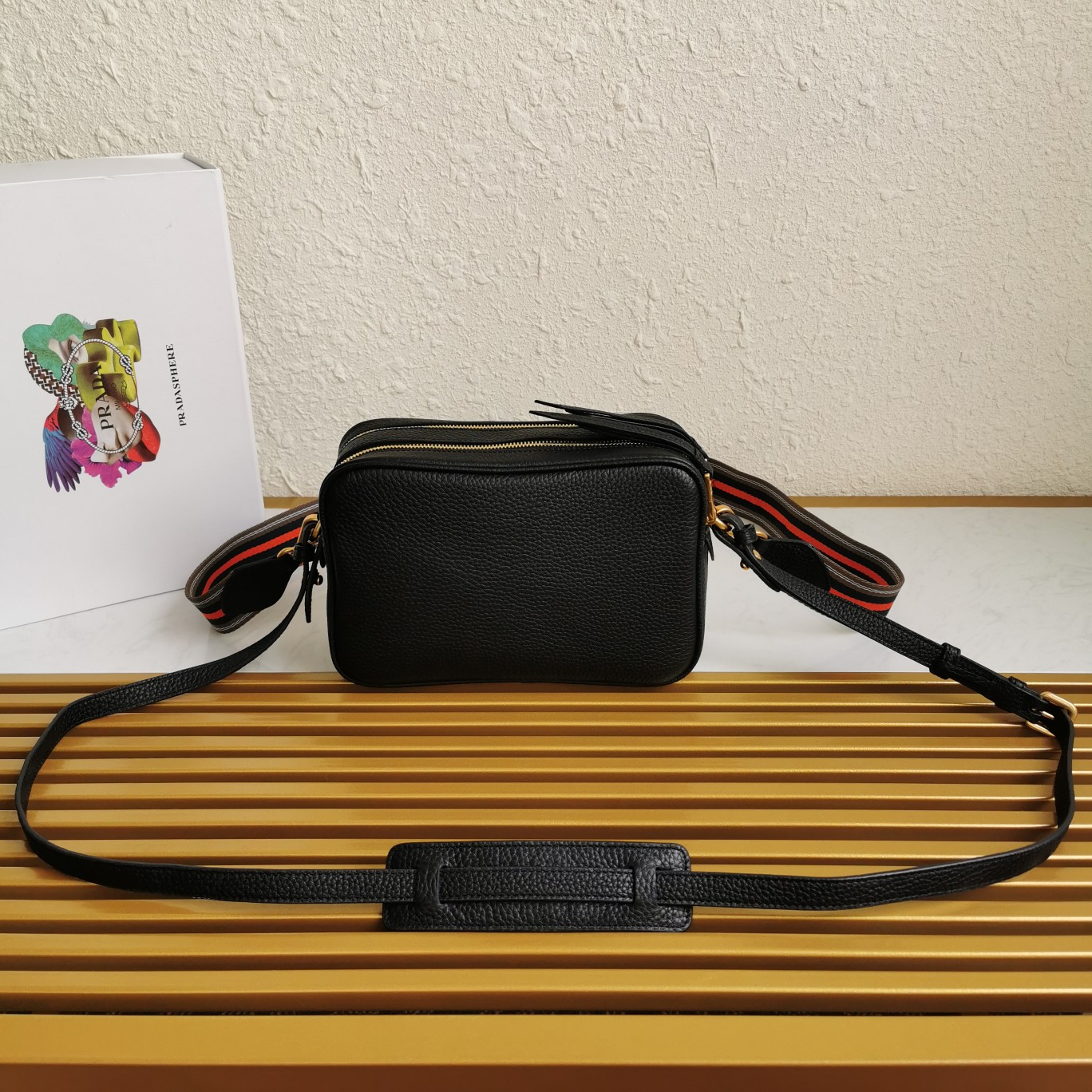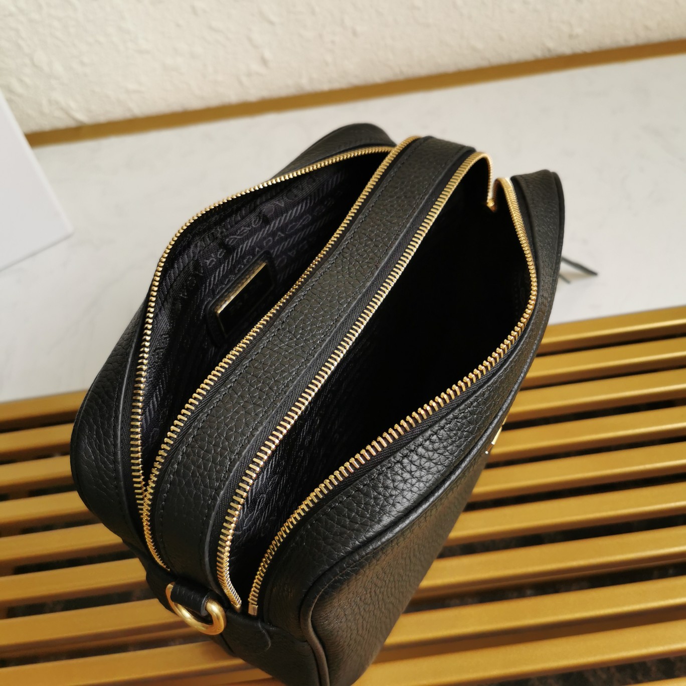 This is an original and popular item, made of Prada’s textured small cowhide leather. It features adjustable double shoulder straps, a detachable leather shoulder strap, and a detachable colored fabric shoulder strap. The bag is adorned with gold-plated hardware, metal engraved logo, two zipper compartments, Prada logo lining, and it is synchronized with the items available at Prada’s official stores.