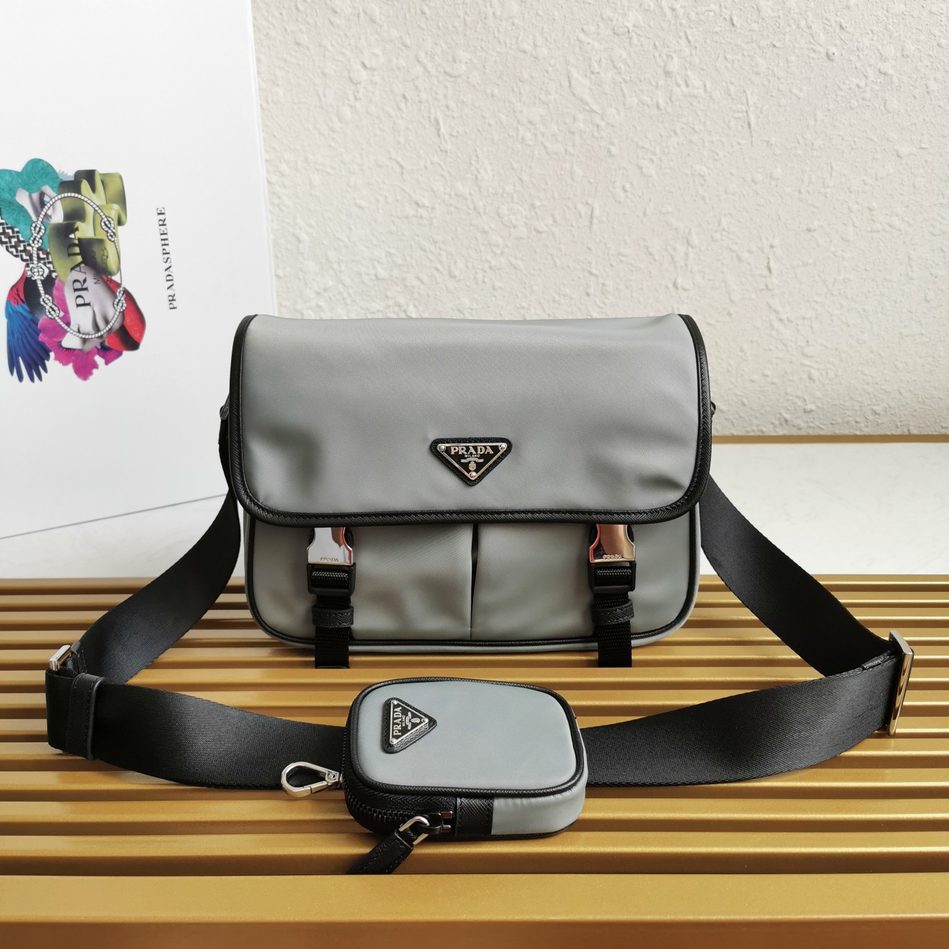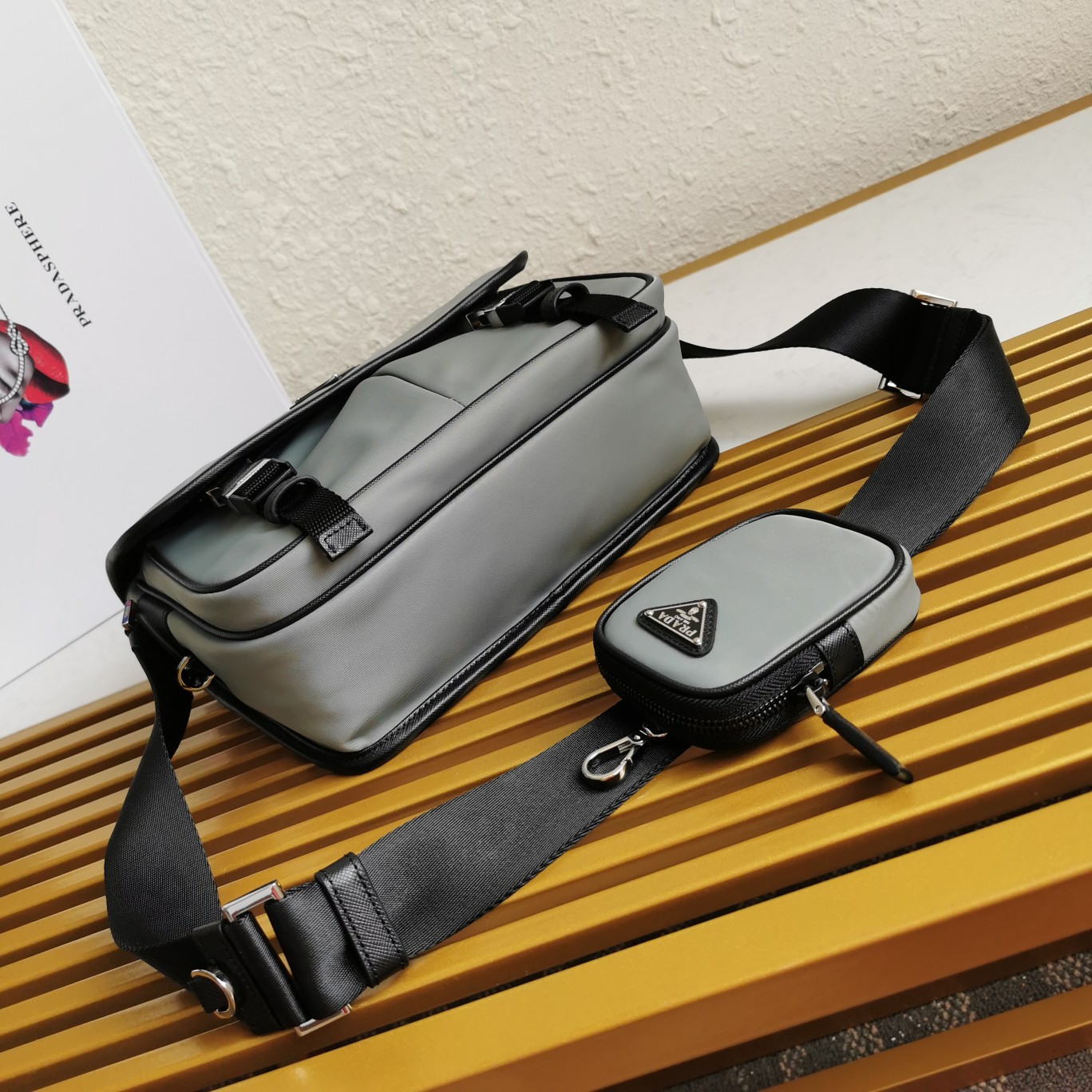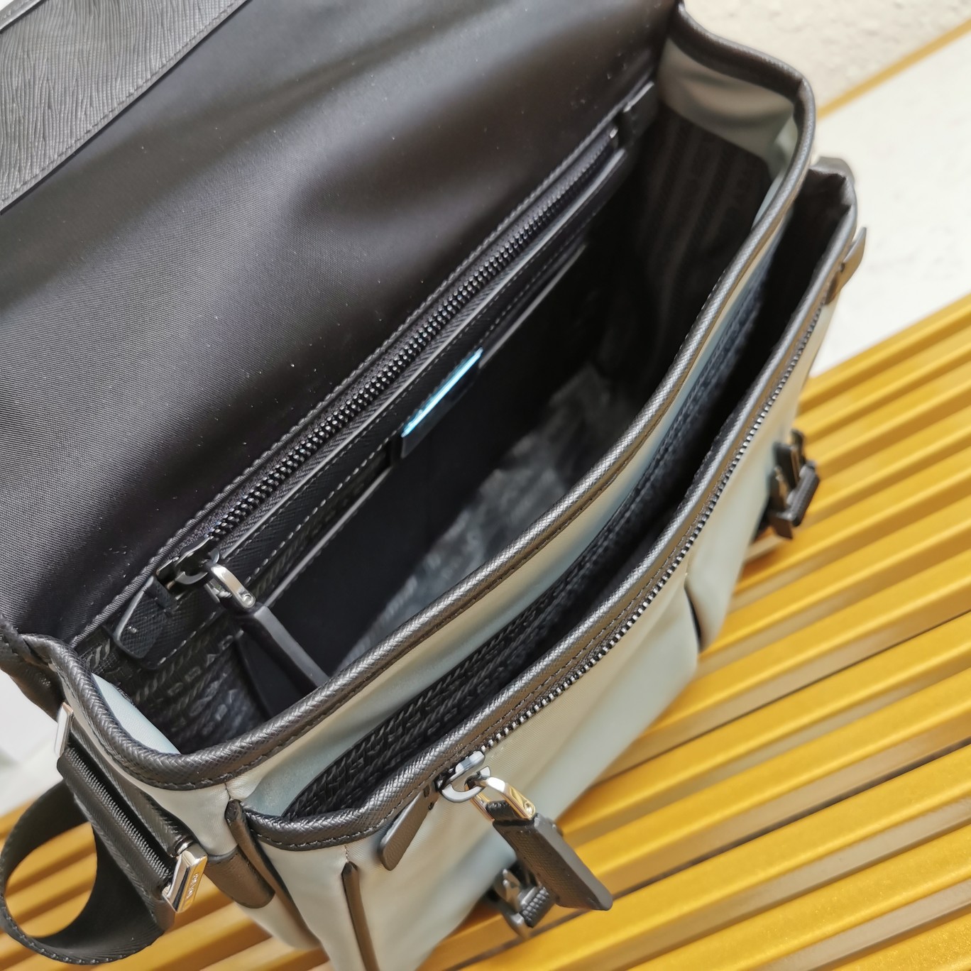 This new model of men’s crossbody bag is adorned with a classic Saffiano leather trim on the nylon flap. It features two side-release buckles and a signature triangular metal logo, showcasing a fashionable design style. Made with imported nylon and Saffiano leather materials, it has two front pockets, one of which has a zippered back pocket. There are also two interior cellphone pockets and an adjustable nylon logo jacquard shoulder strap. It is a classic and stylish messenger bag.