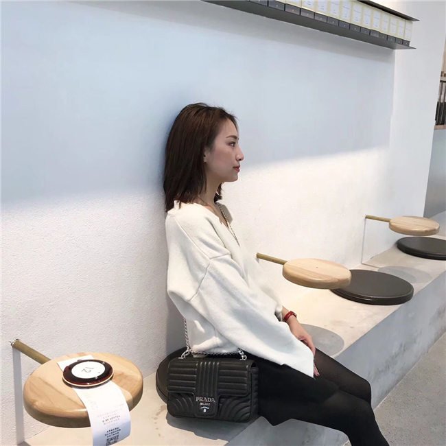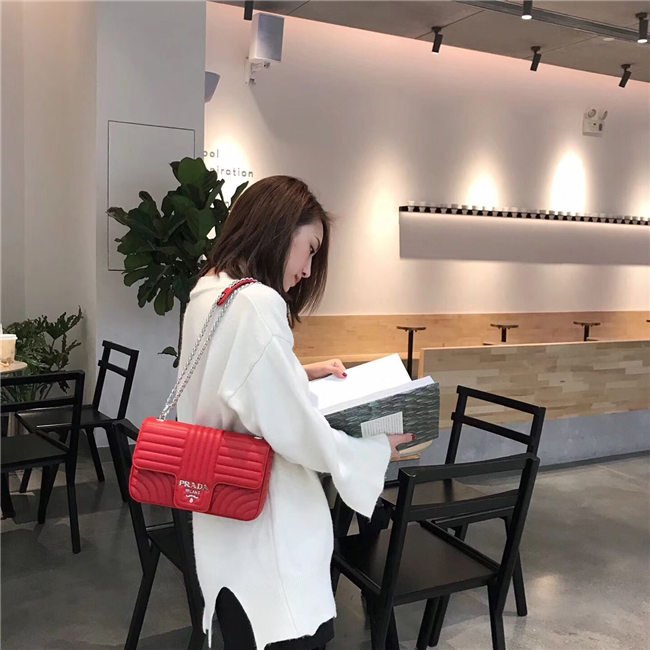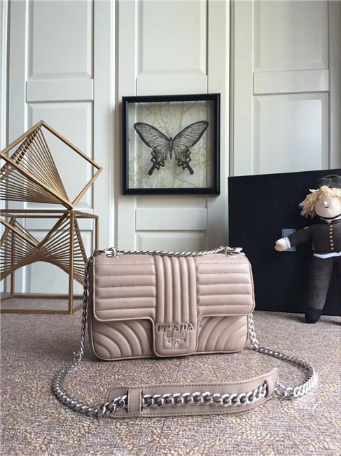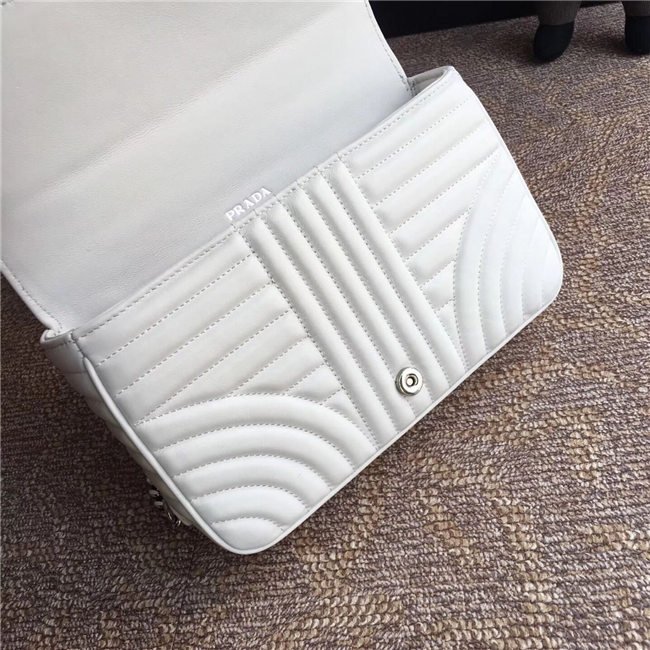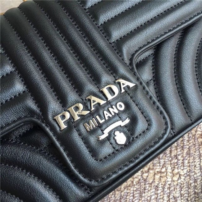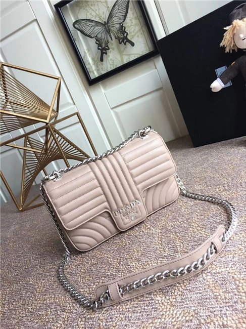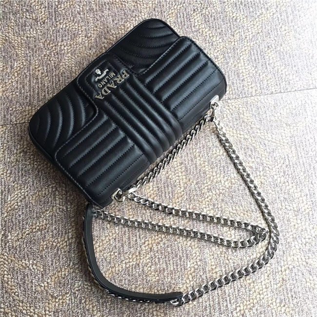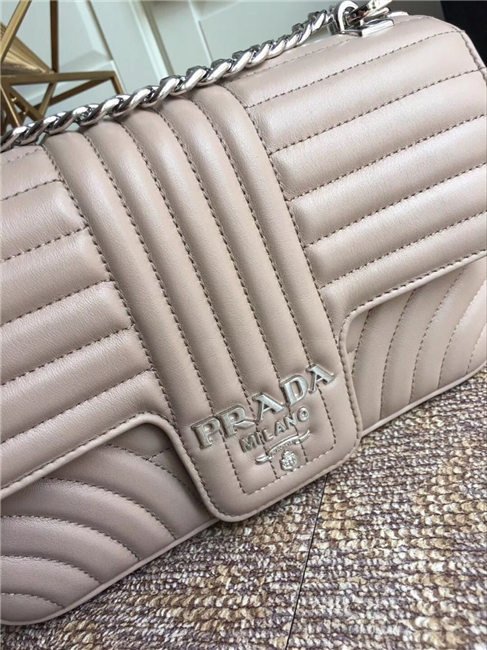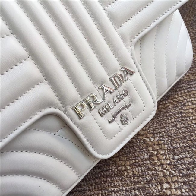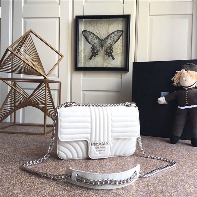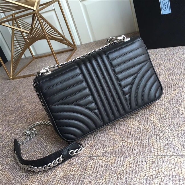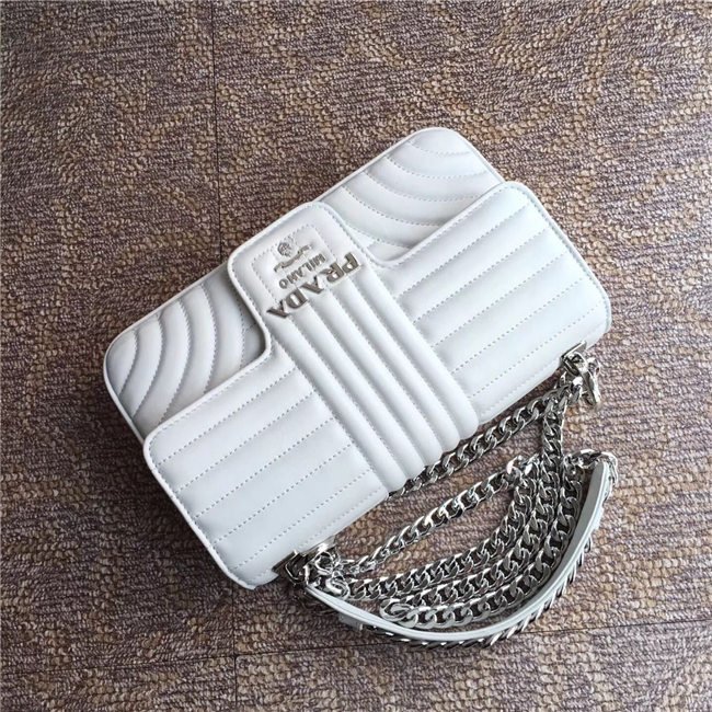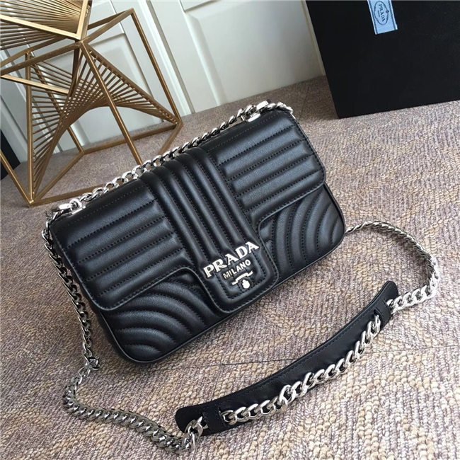 Prada Diagramme bag in refined matelasse leather. The chain shoulder strap, logo lettering and hardware add a touch of light to the model.