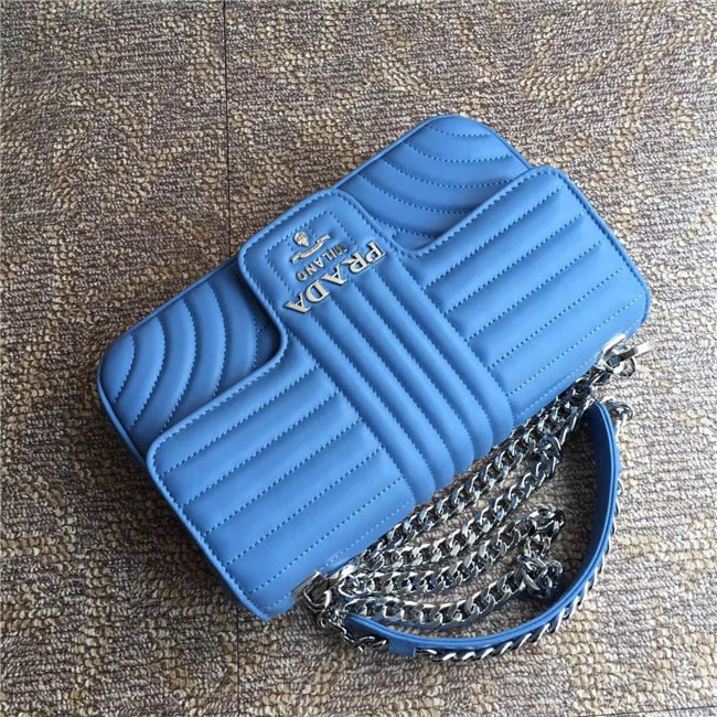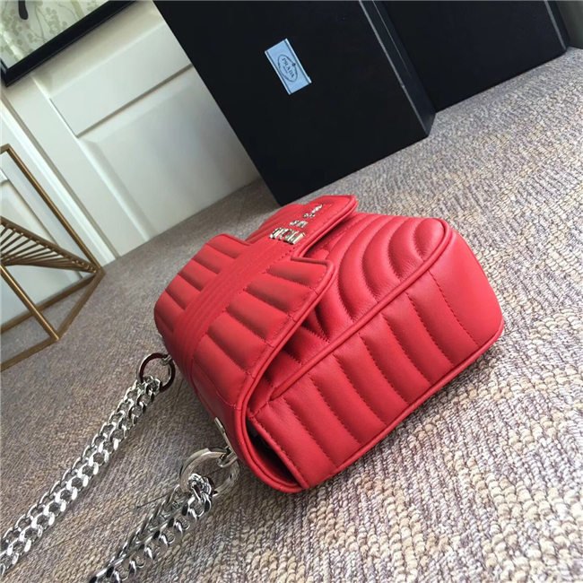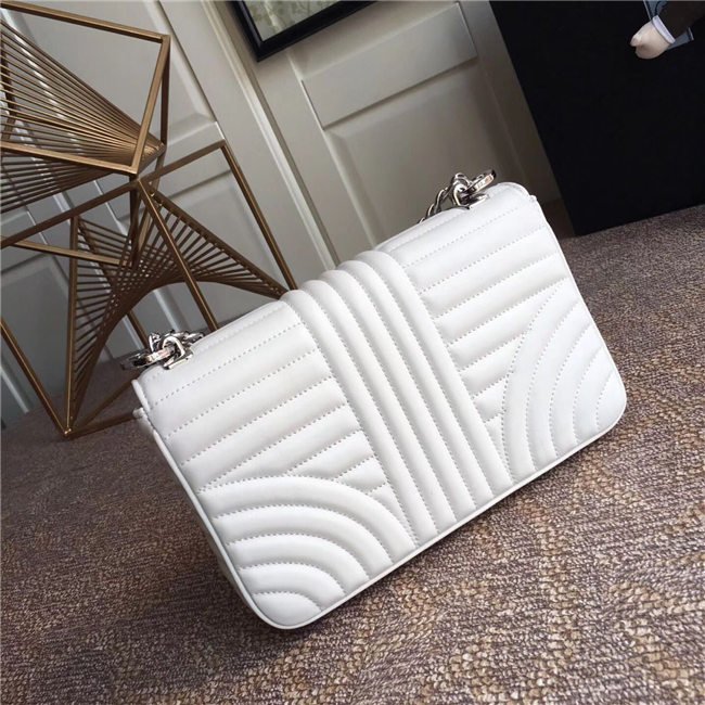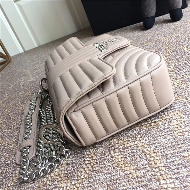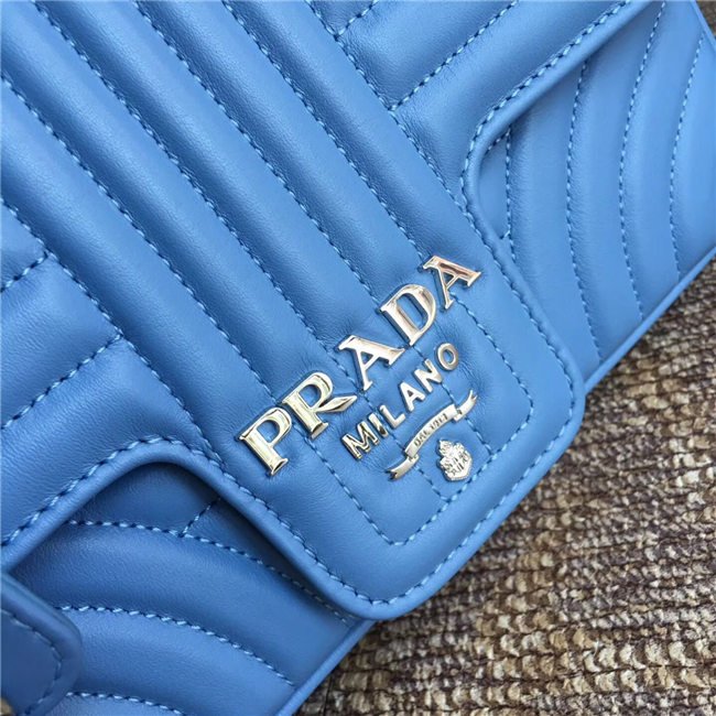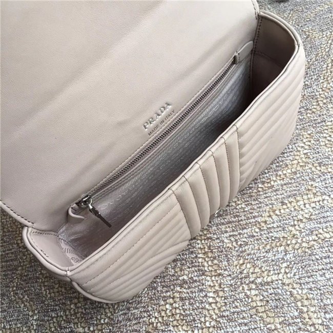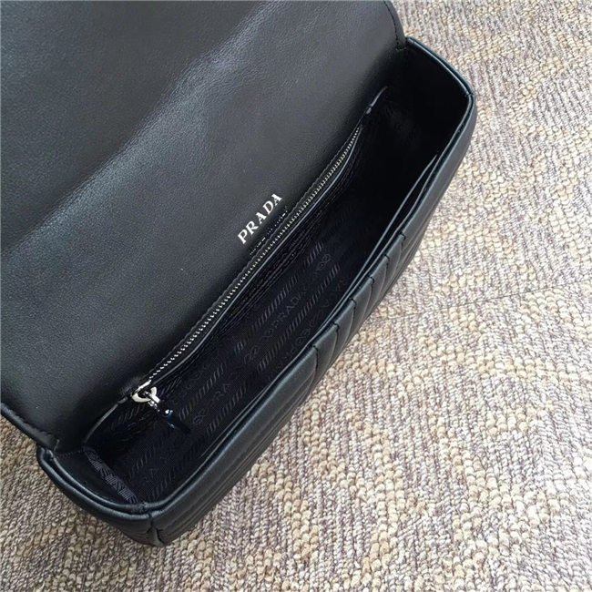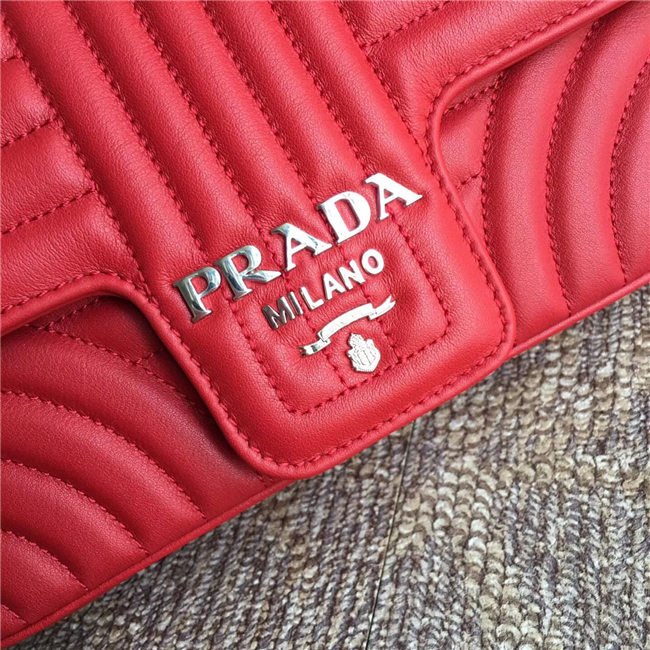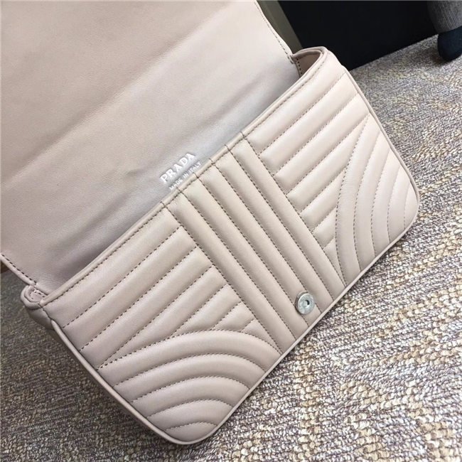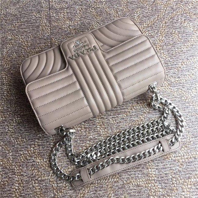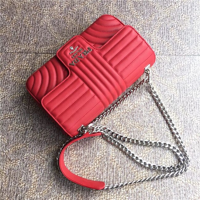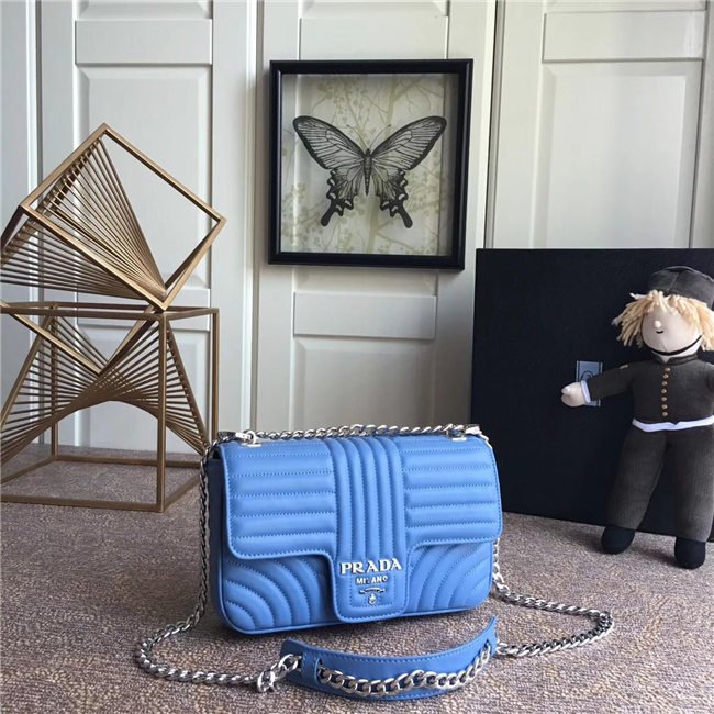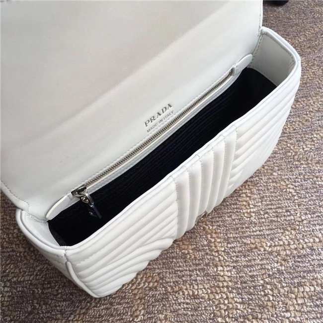 Prada Diagramme bag in refined matelasse leather. The chain shoulder strap, logo lettering and hardware add a touch of light to the model.