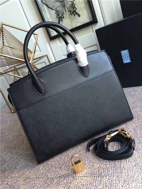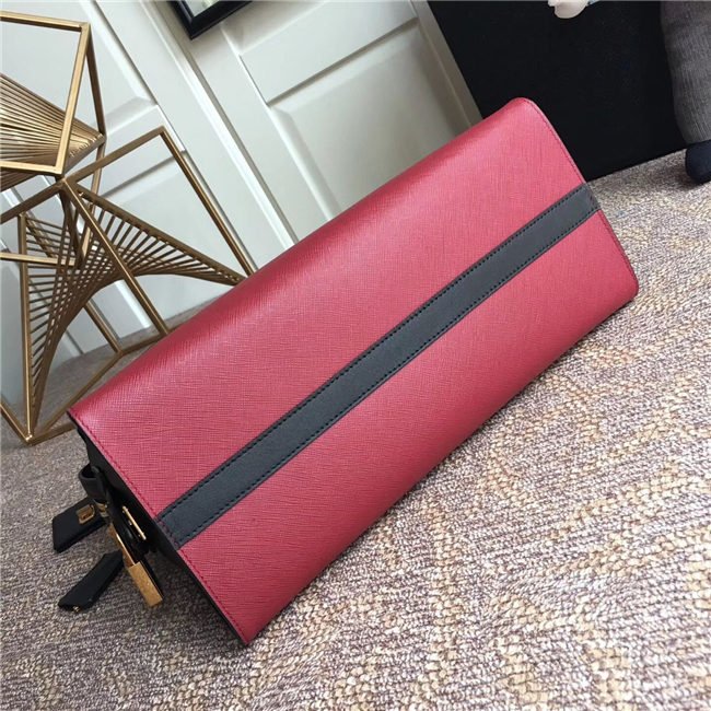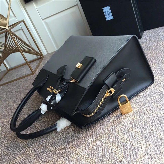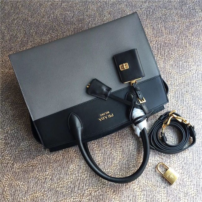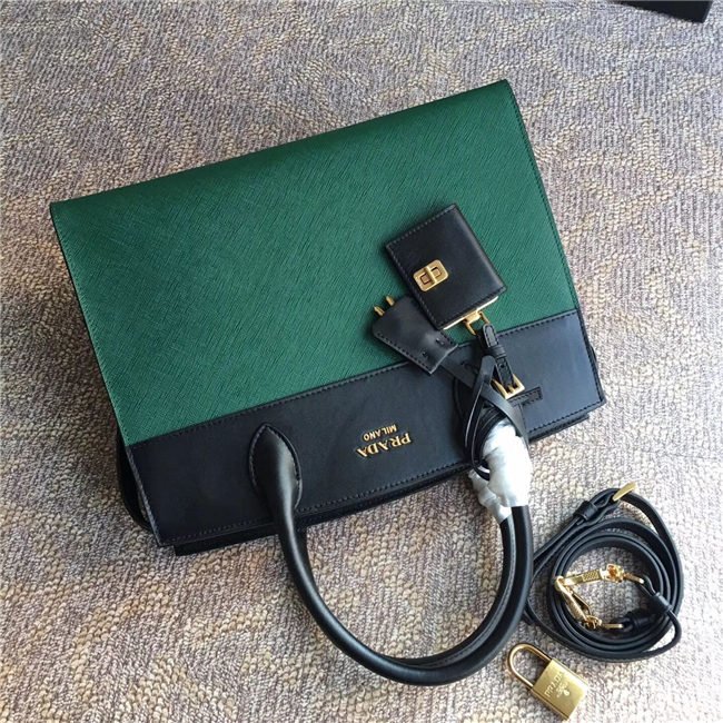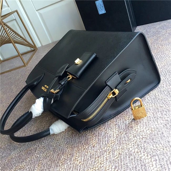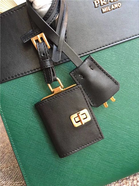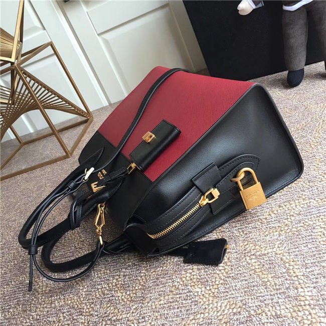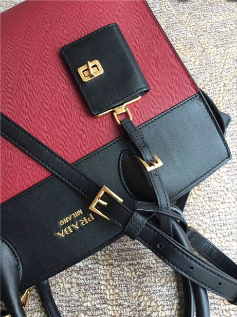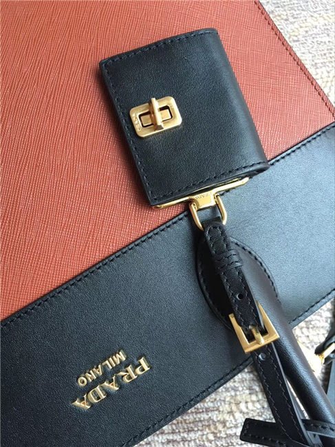 A Prada Esplanade bag crafted in Saffiano and calf leathers. Gold-colored Prada lettering, padlock and hardware embellish the piece, while the detachable leather shoulder strap lends versatility.