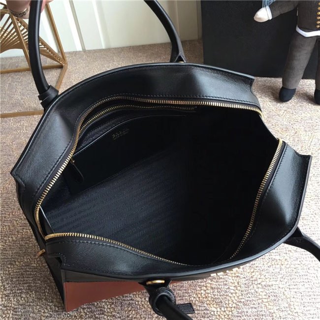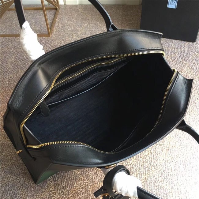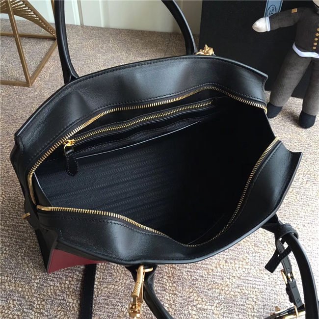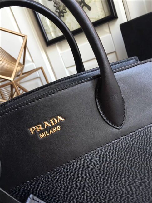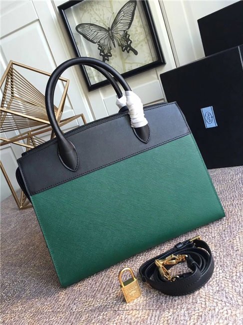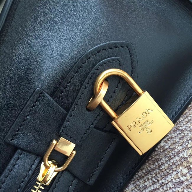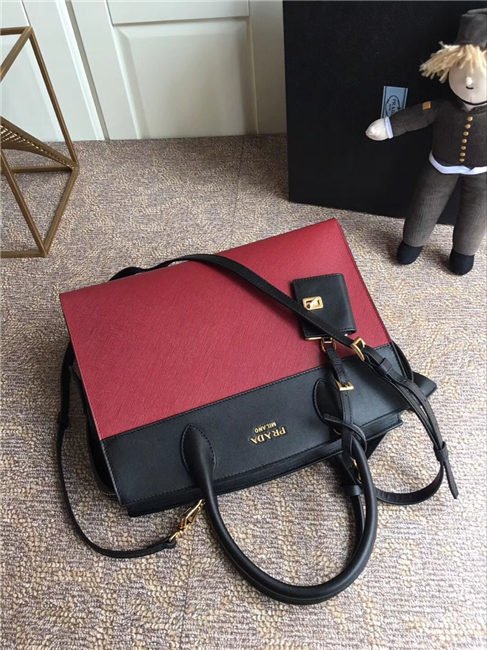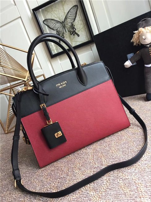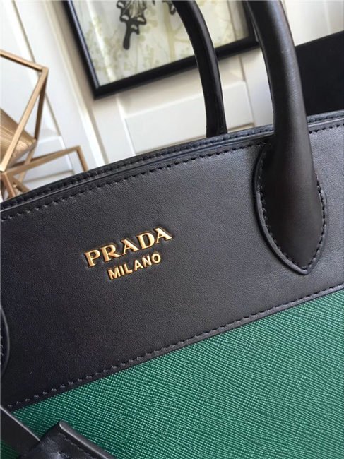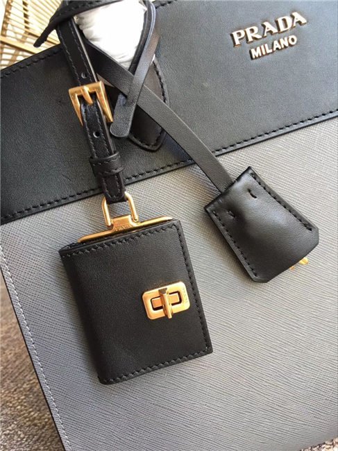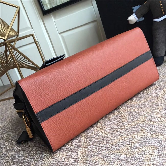 A Prada Esplanade bag crafted in Saffiano and calf leathers. Gold-colored Prada lettering, padlock and hardware embellish the piece, while the detachable leather shoulder strap lends versatility.