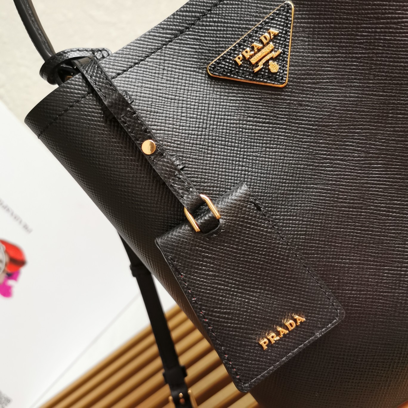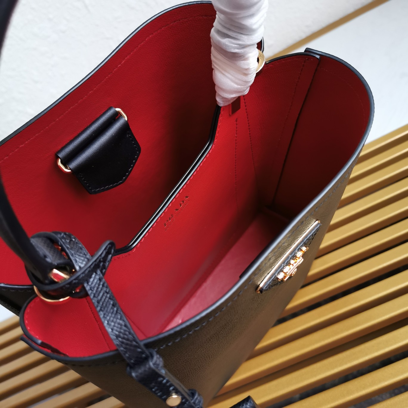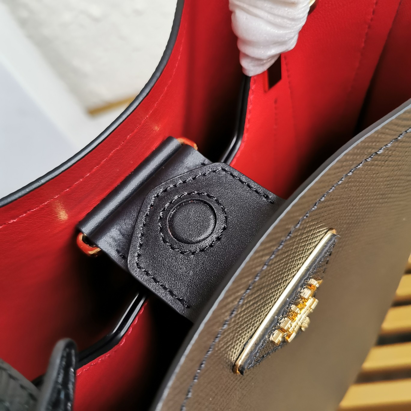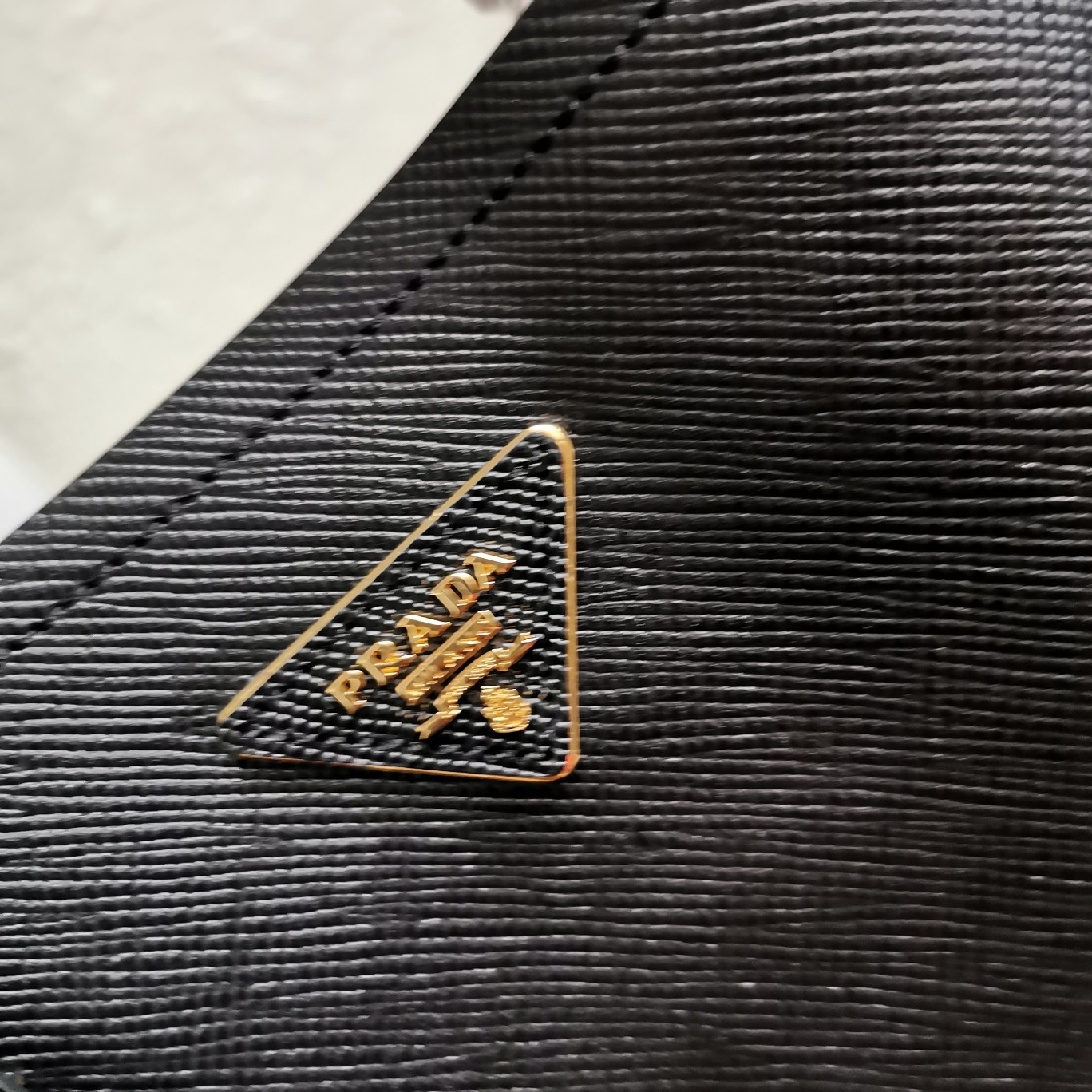 Original item, made with imported Saffiano leather material. The detachable shoulder strap, leather nameplate, and metal logo complement each other. The central pocket with leather-wrapped magnetic closure features a contrasting soft lambskin lining with a Saffiano leather triangle logo. This Double handbag style is elegant, eye-catching, and unique.