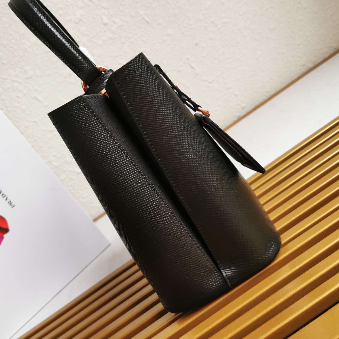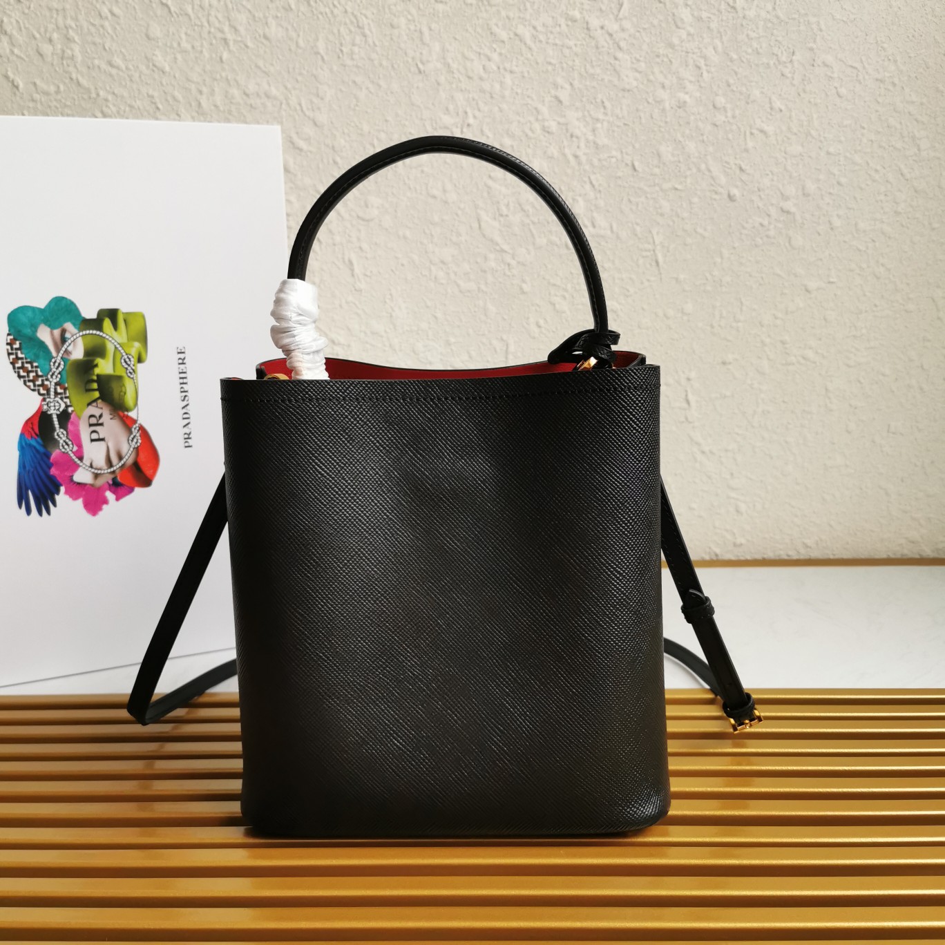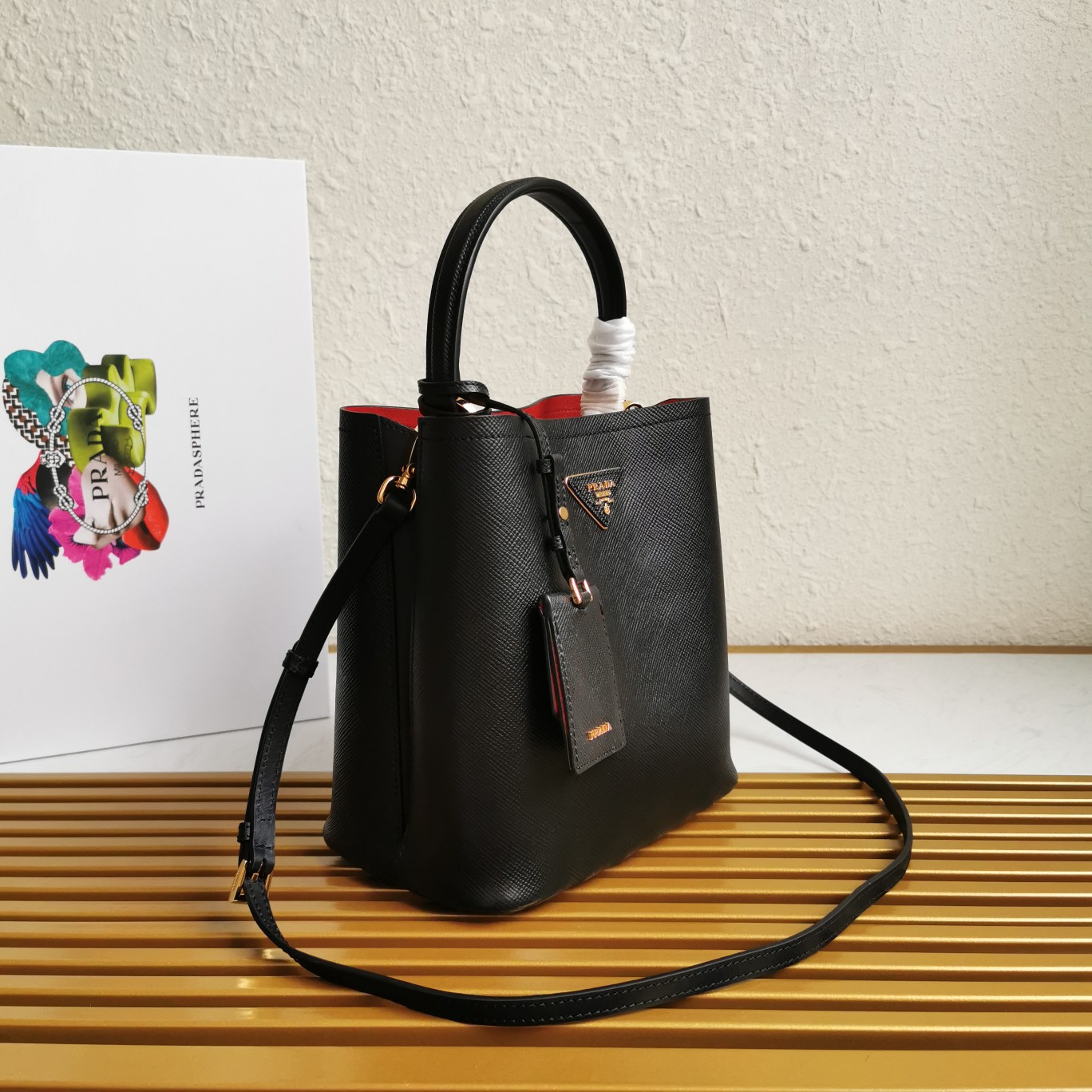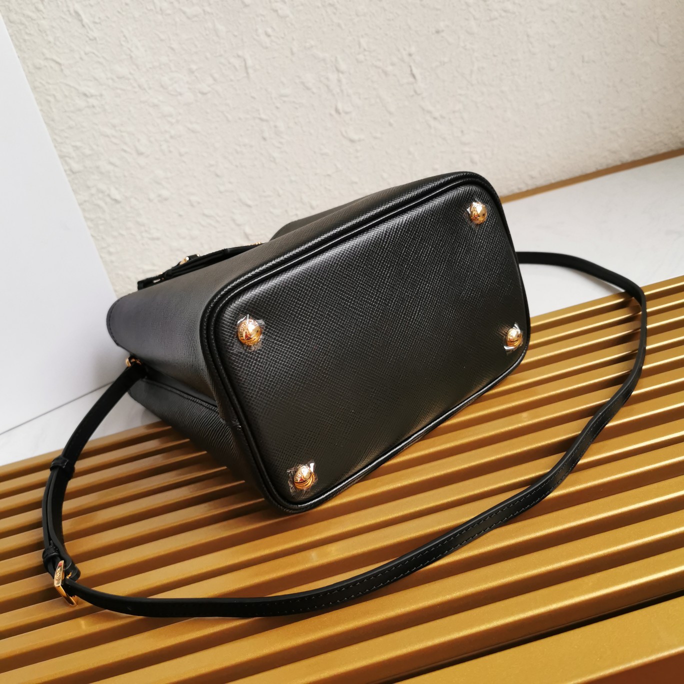 Original item, made with imported Saffiano leather material. The detachable shoulder strap, leather nameplate, and metal logo complement each other. The central pocket with leather-wrapped magnetic closure features a contrasting soft lambskin lining with a Saffiano leather triangle logo. This Double handbag style is elegant, eye-catching, and unique.