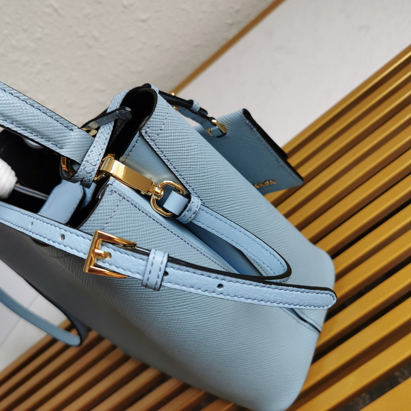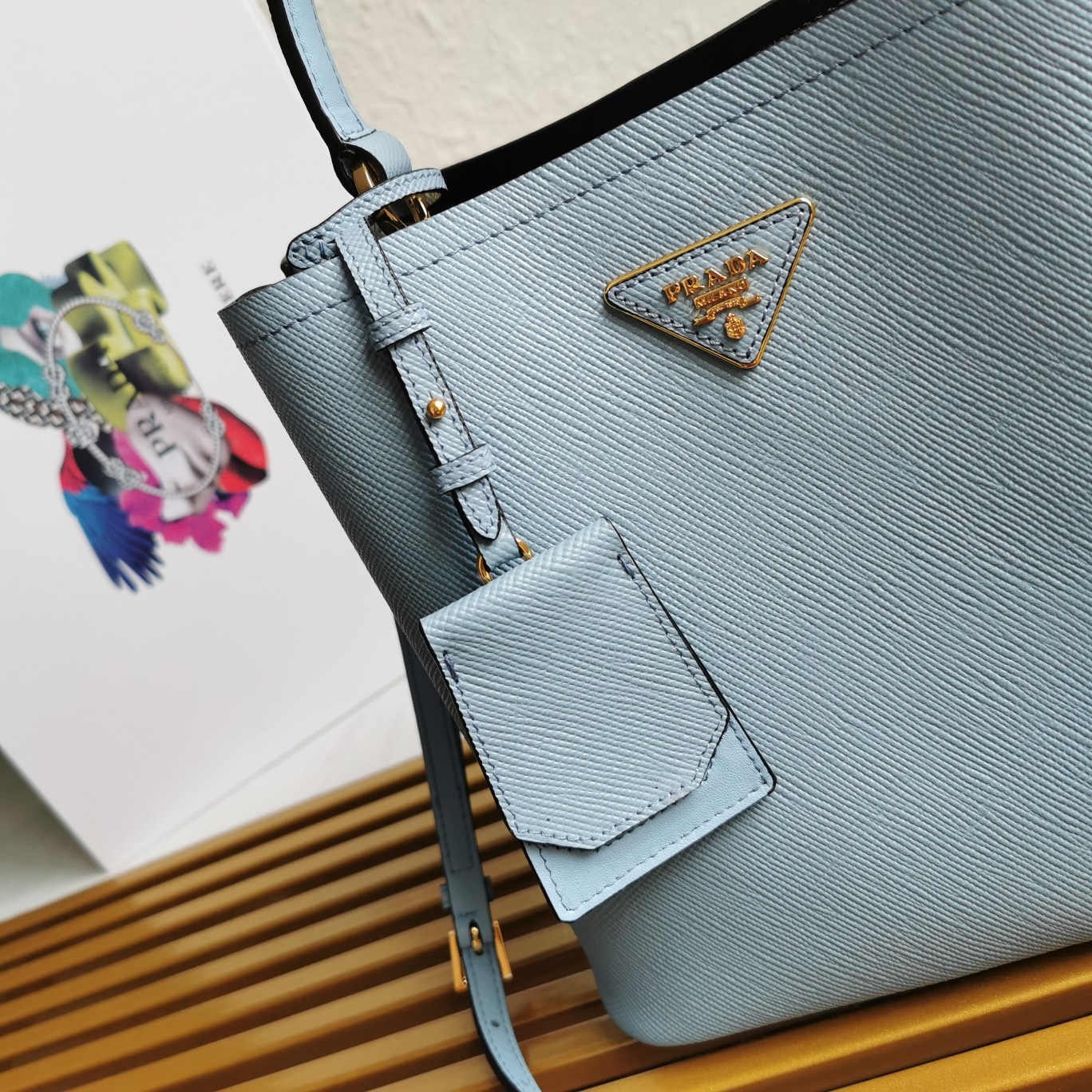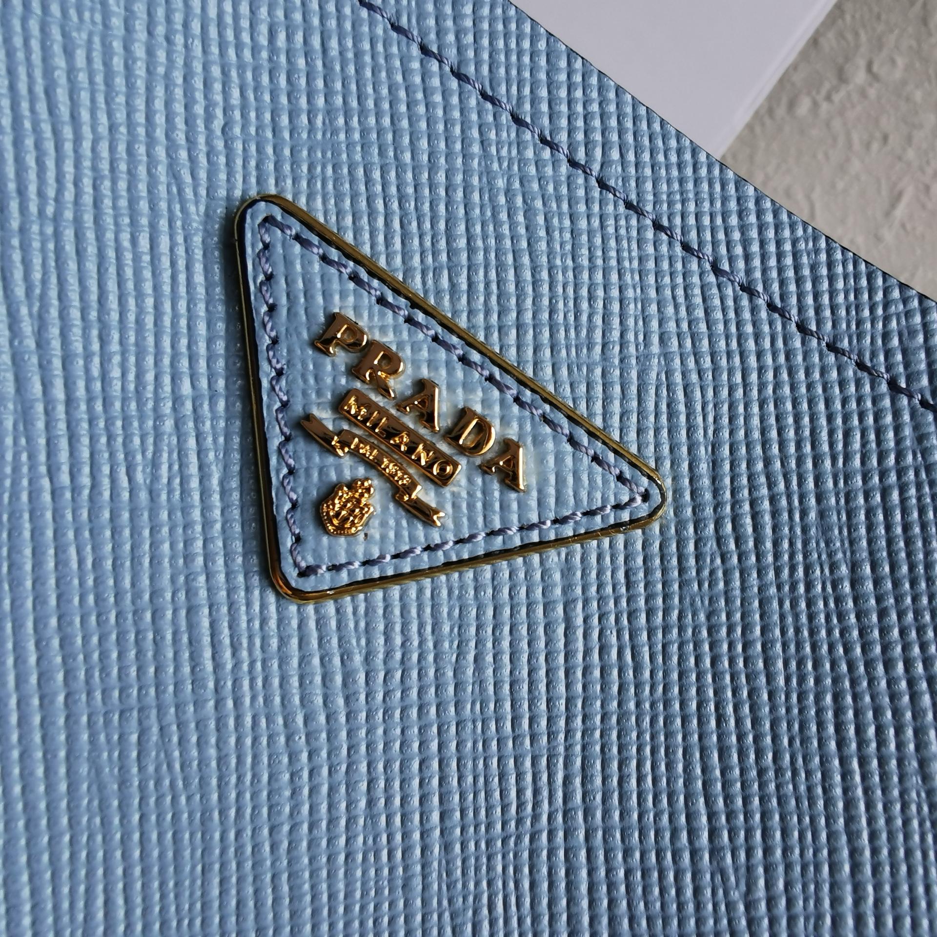 Original item, made with imported Saffiano leather material. The detachable shoulder strap, leather nameplate, and metal logo complement each other. The central pocket with leather-wrapped magnetic closure features a contrasting soft lambskin lining with a Saffiano leather triangle logo. This Double handbag style is elegant, eye-catching, and unique.