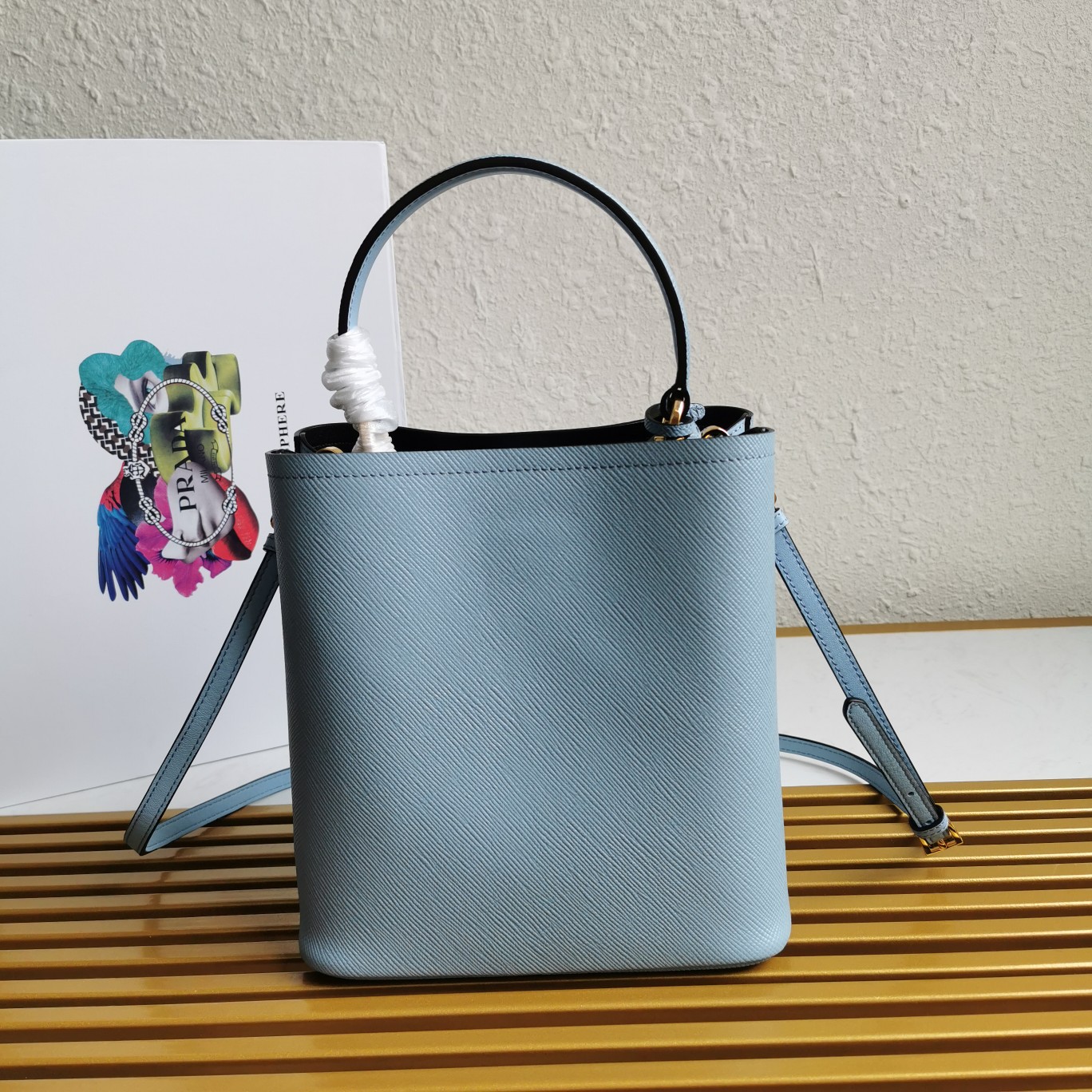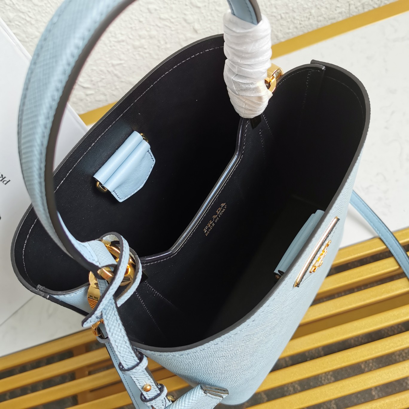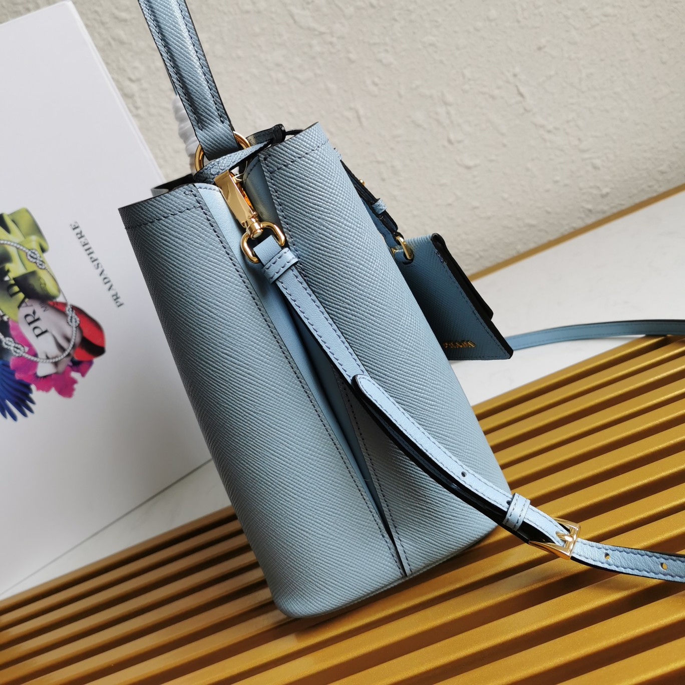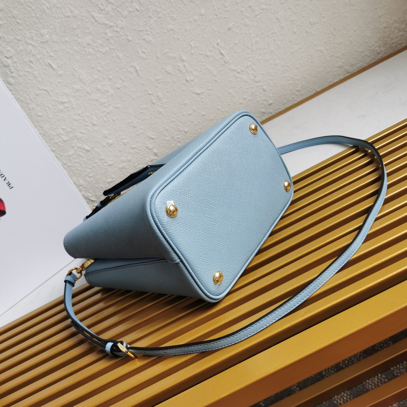 Original item, made with imported Saffiano leather material. The detachable shoulder strap, leather nameplate, and metal logo complement each other. The central pocket with leather-wrapped magnetic closure features a contrasting soft lambskin lining with a Saffiano leather triangle logo. This Double handbag style is elegant, eye-catching, and unique.
