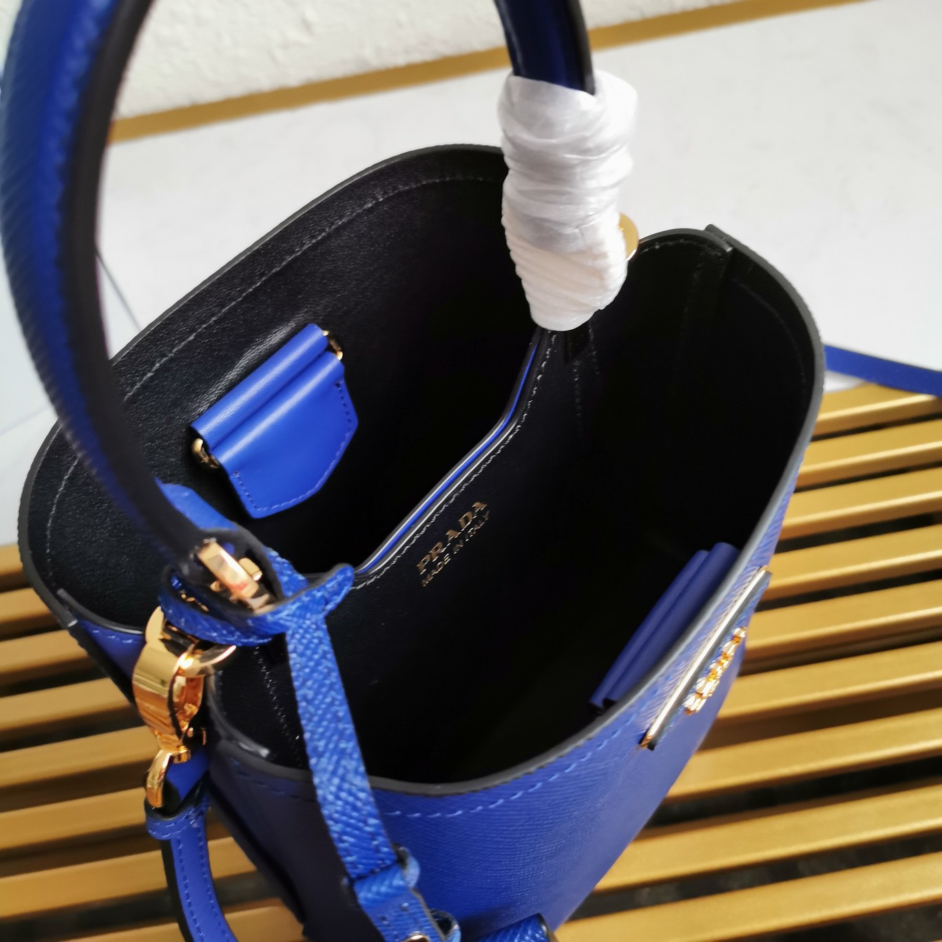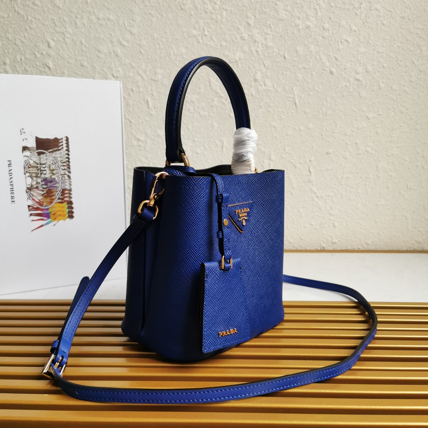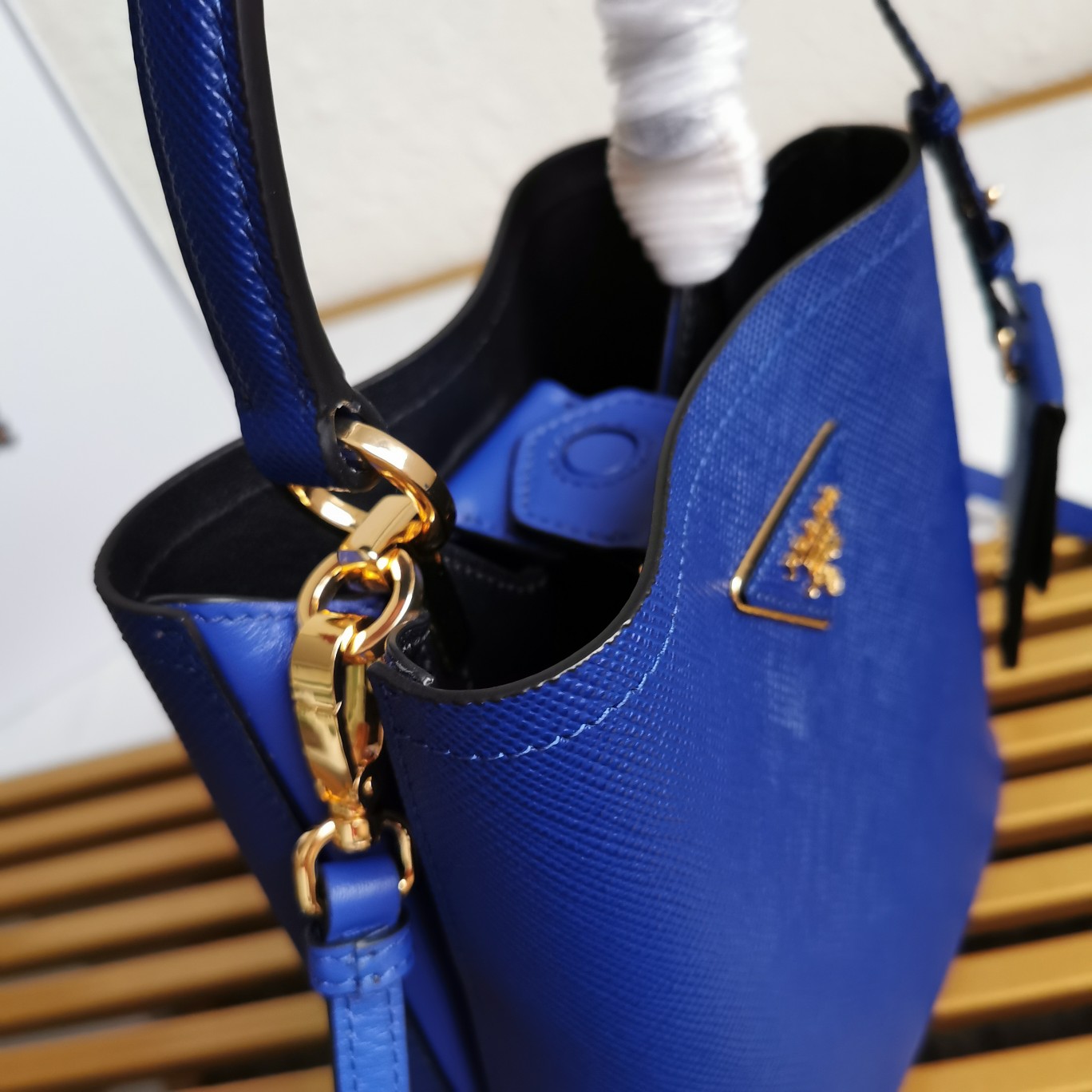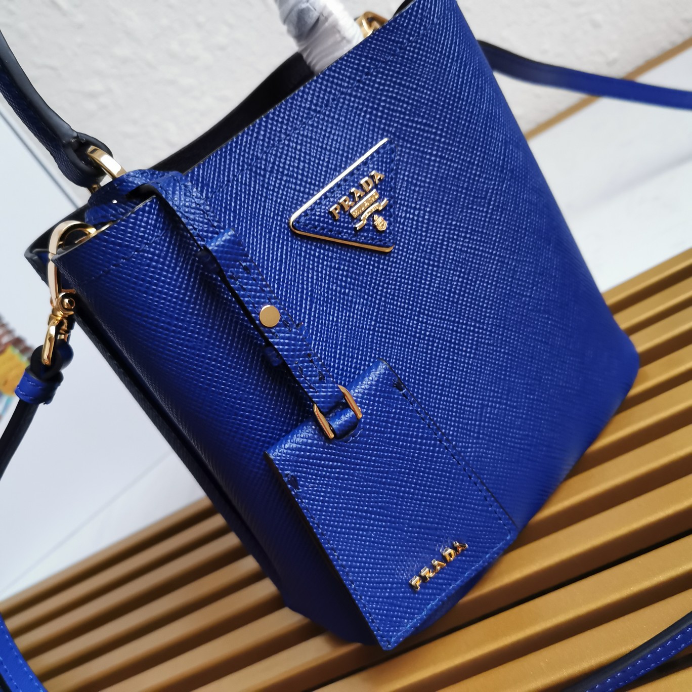 This top-grade original piece is crafted with imported Saffiano leather material. It features a detachable shoulder strap, leather nameplate, and complementing metal logo. The central pocket is secured with a leather-covered magnetic closure, adorned with a Saffiano leather triangular logo. The contrasting soft lambskin lining adds a touch of sophistication to this elegant and eye-catching Double handbag style.