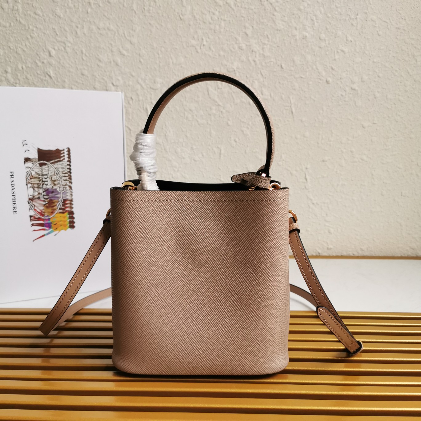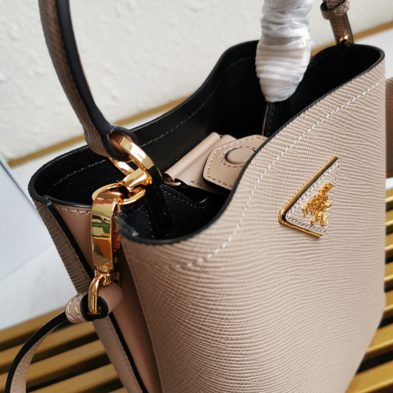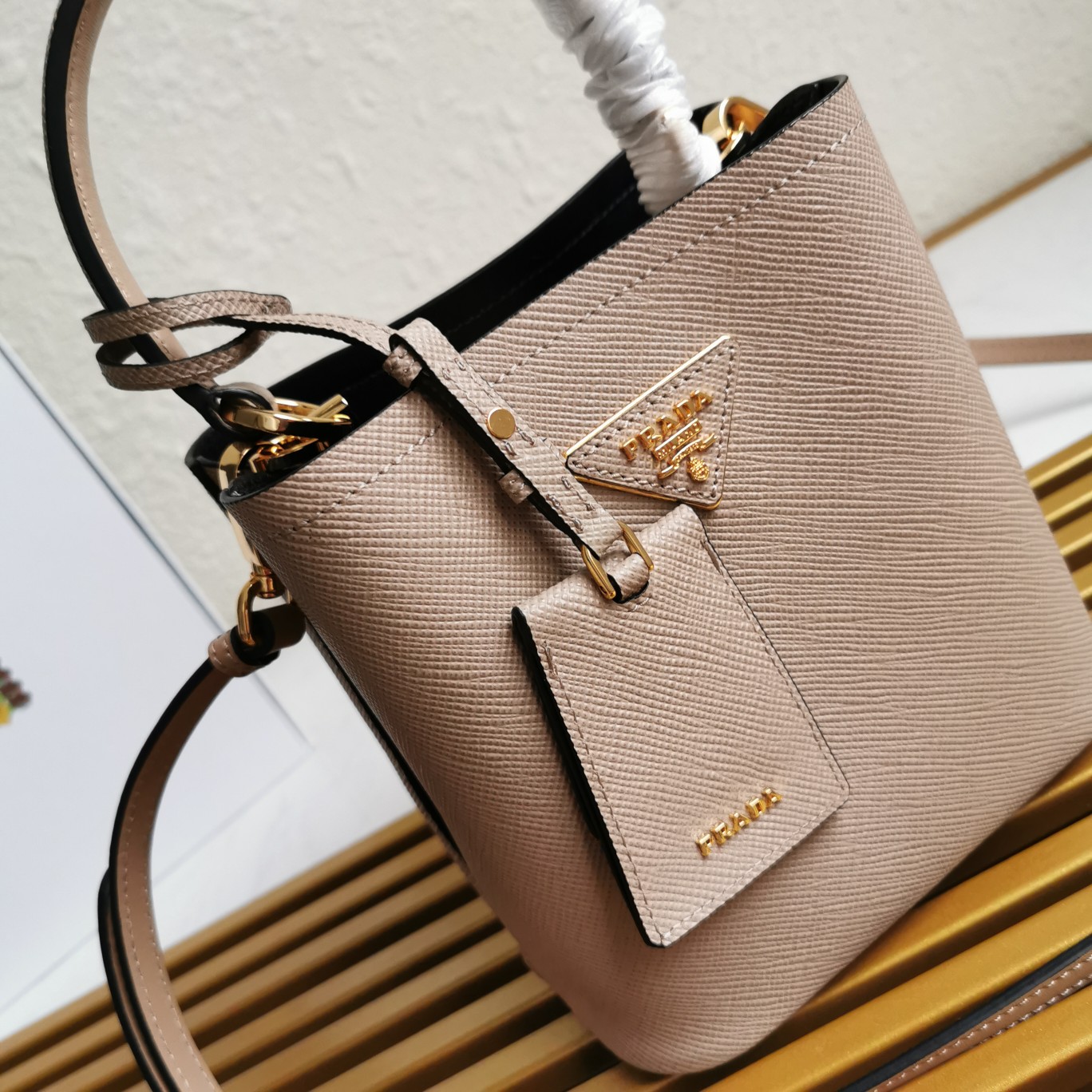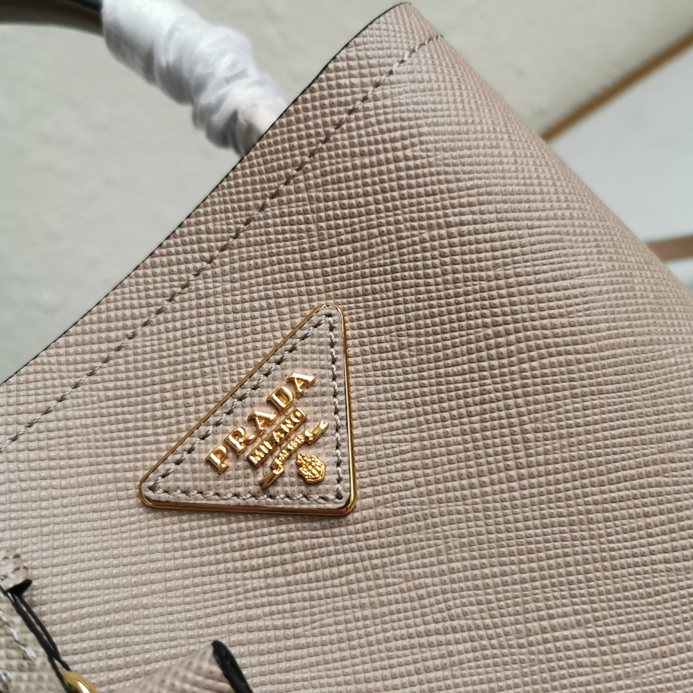 This top-grade original piece is crafted with imported Saffiano leather material. It features a detachable shoulder strap, leather nameplate, and complementing metal logo. The central pocket is secured with a leather-covered magnetic closure, adorned with a Saffiano leather triangular logo. The contrasting soft lambskin lining adds a touch of sophistication to this elegant and eye-catching Double handbag style.