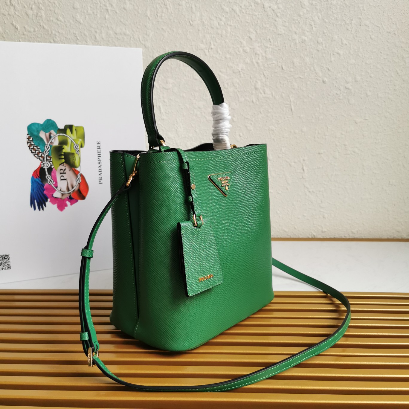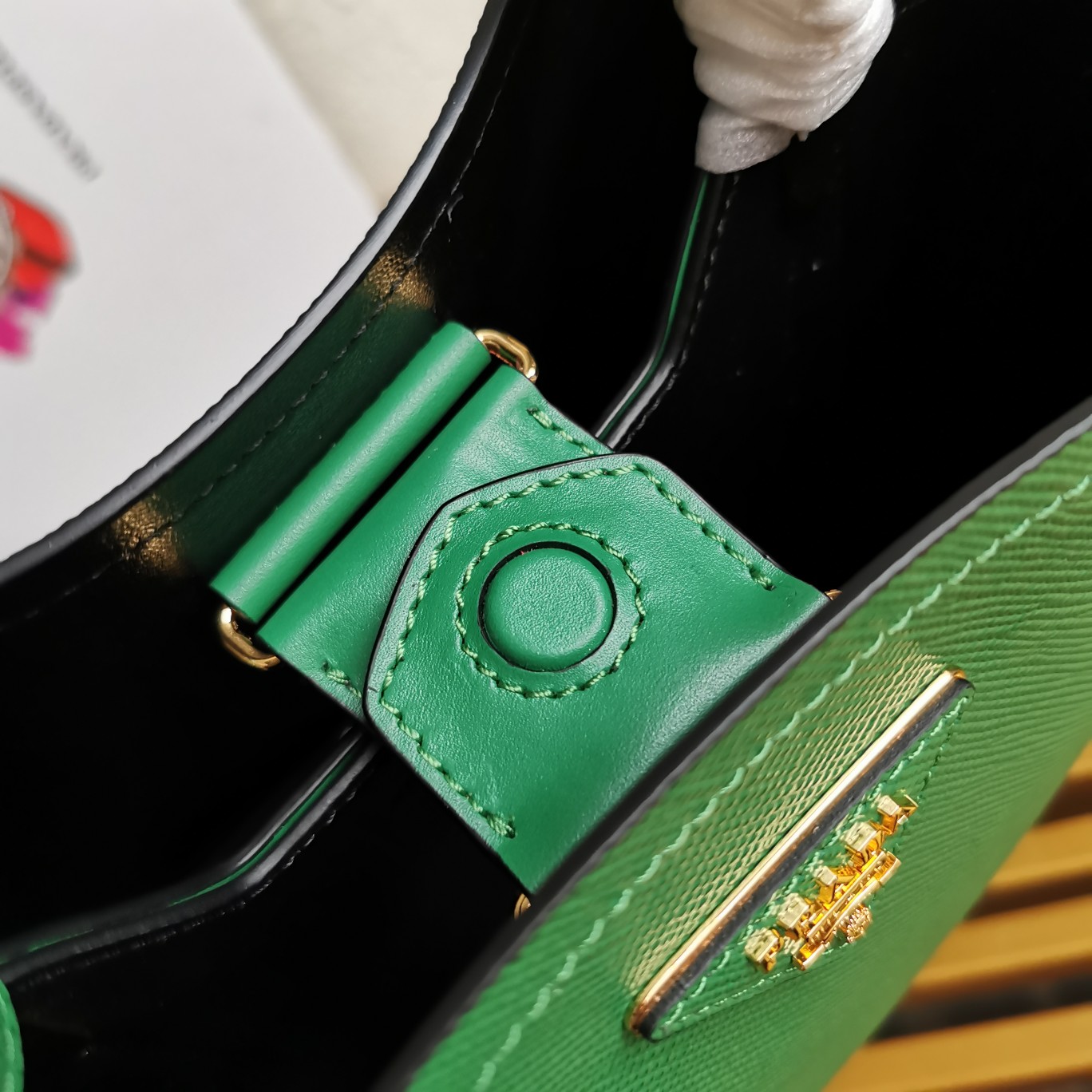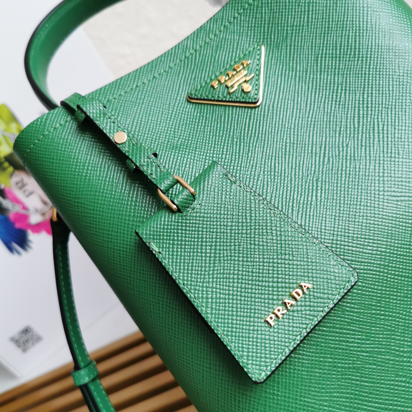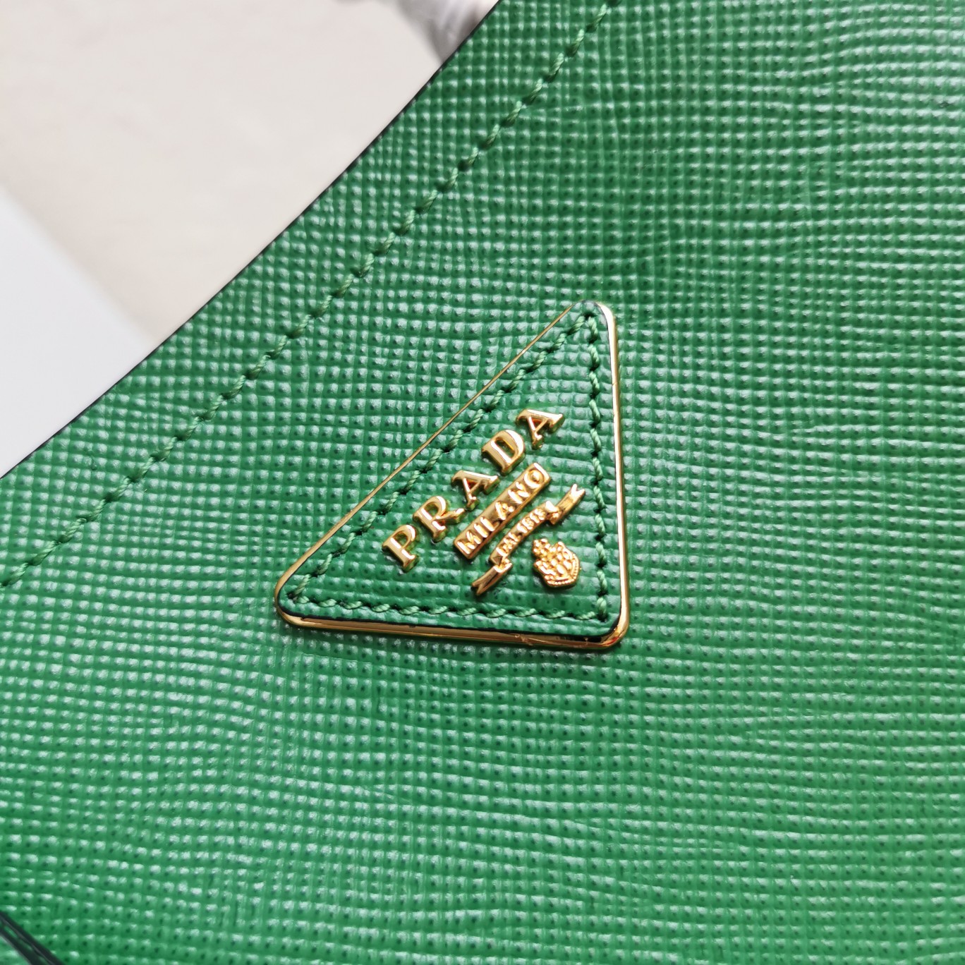 Original item, made with imported Saffiano leather material. The detachable shoulder strap, leather nameplate, and metal logo complement each other. The central pocket with leather-wrapped magnetic closure features a contrasting soft lambskin lining with a Saffiano leather triangle logo. This Double handbag style is elegant, eye-catching, and unique.
