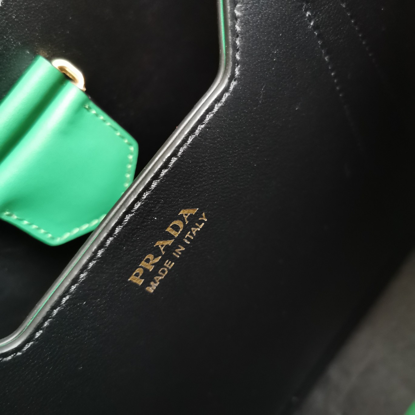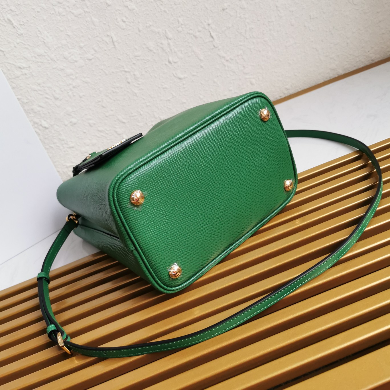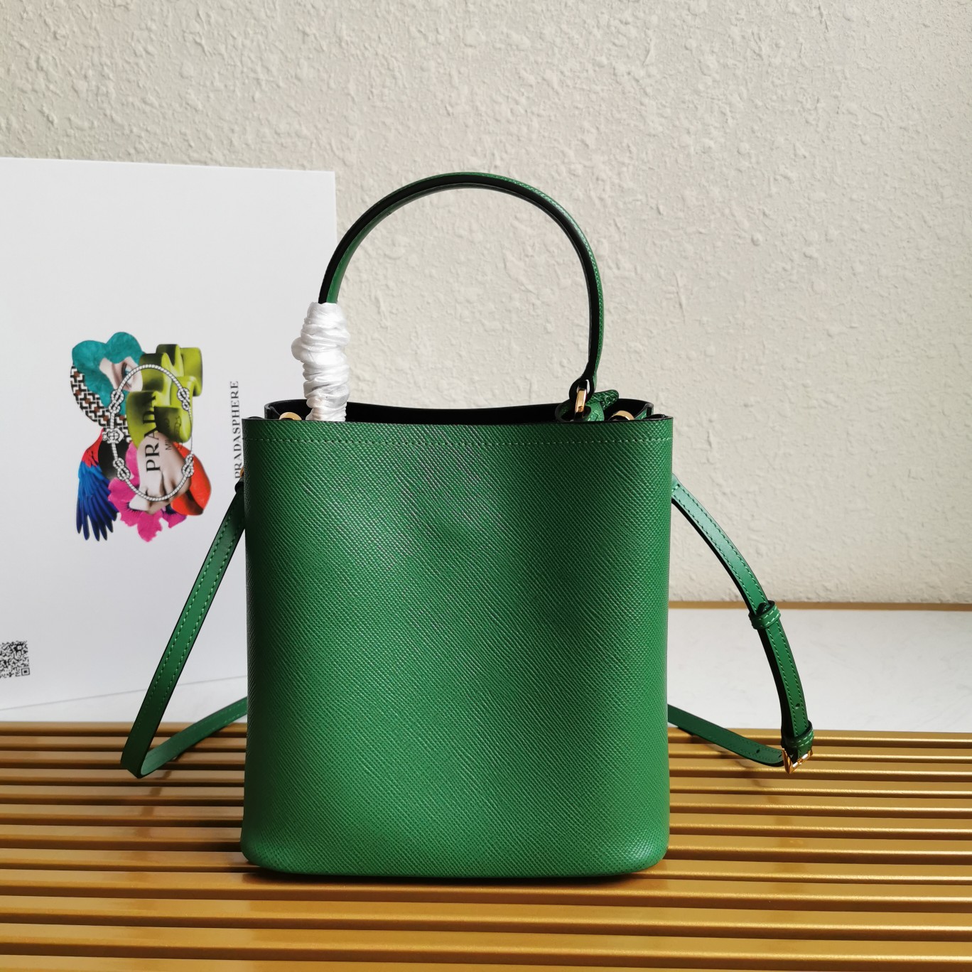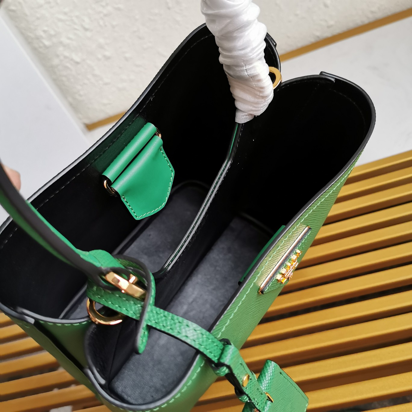 Original item, made with imported Saffiano leather material. The detachable shoulder strap, leather nameplate, and metal logo complement each other. The central pocket with leather-wrapped magnetic closure features a contrasting soft lambskin lining with a Saffiano leather triangle logo. This Double handbag style is elegant, eye-catching, and unique.