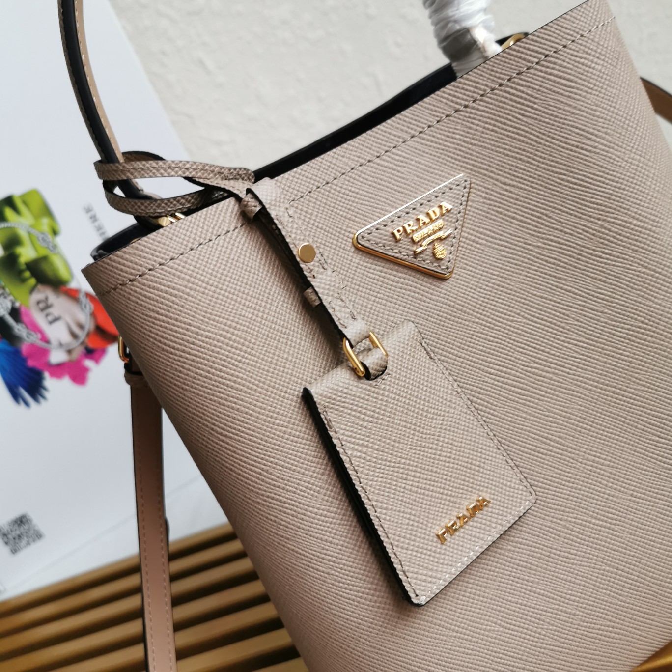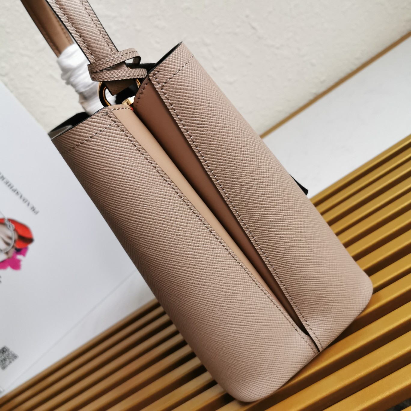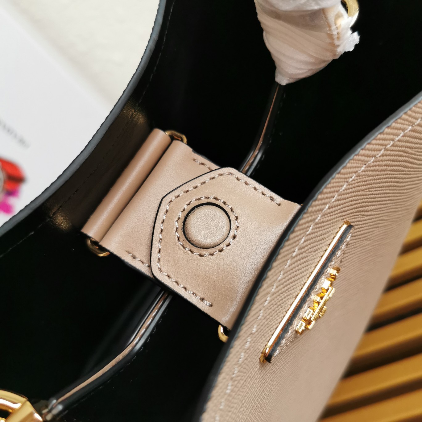 Original item, made with imported Saffiano leather material. The detachable shoulder strap, leather nameplate, and metal logo complement each other. The central pocket with leather-wrapped magnetic closure features a contrasting soft lambskin lining with a Saffiano leather triangle logo. This Double handbag style is elegant, eye-catching, and unique.