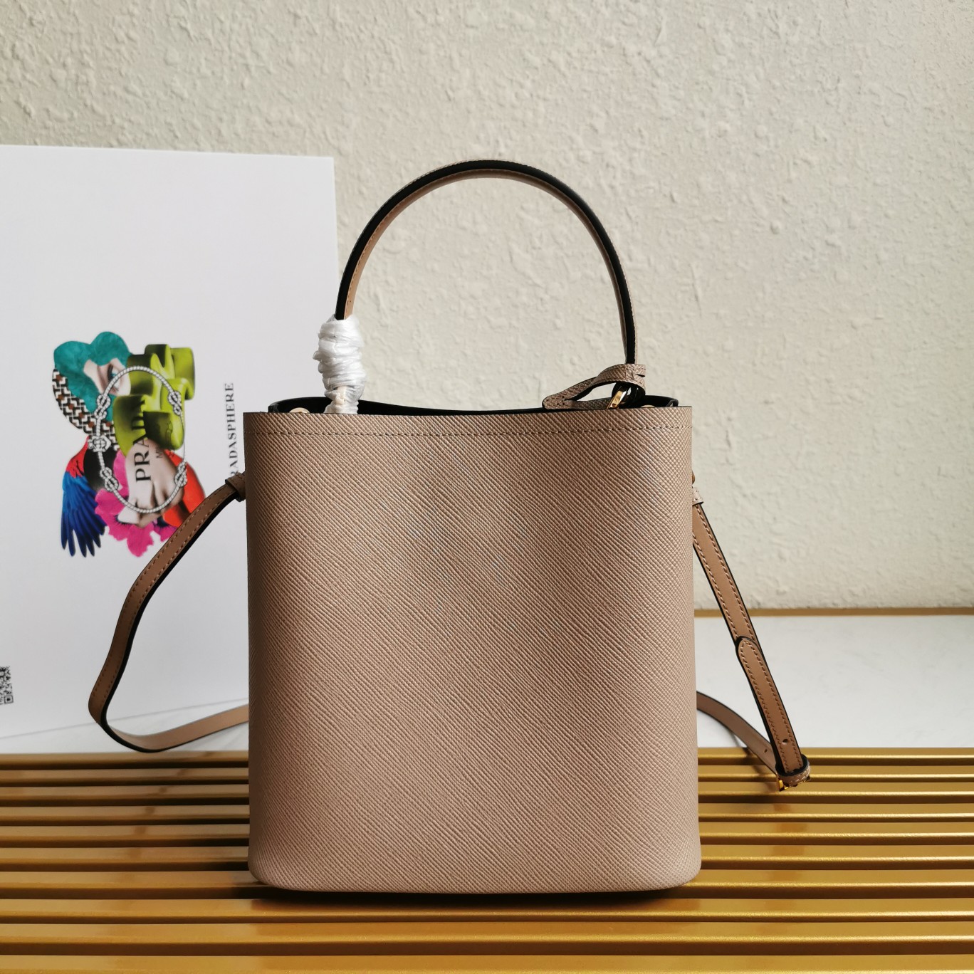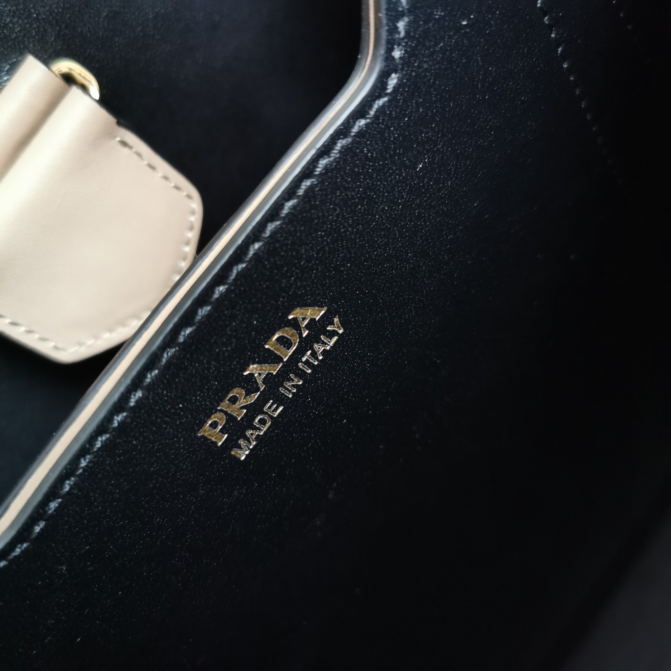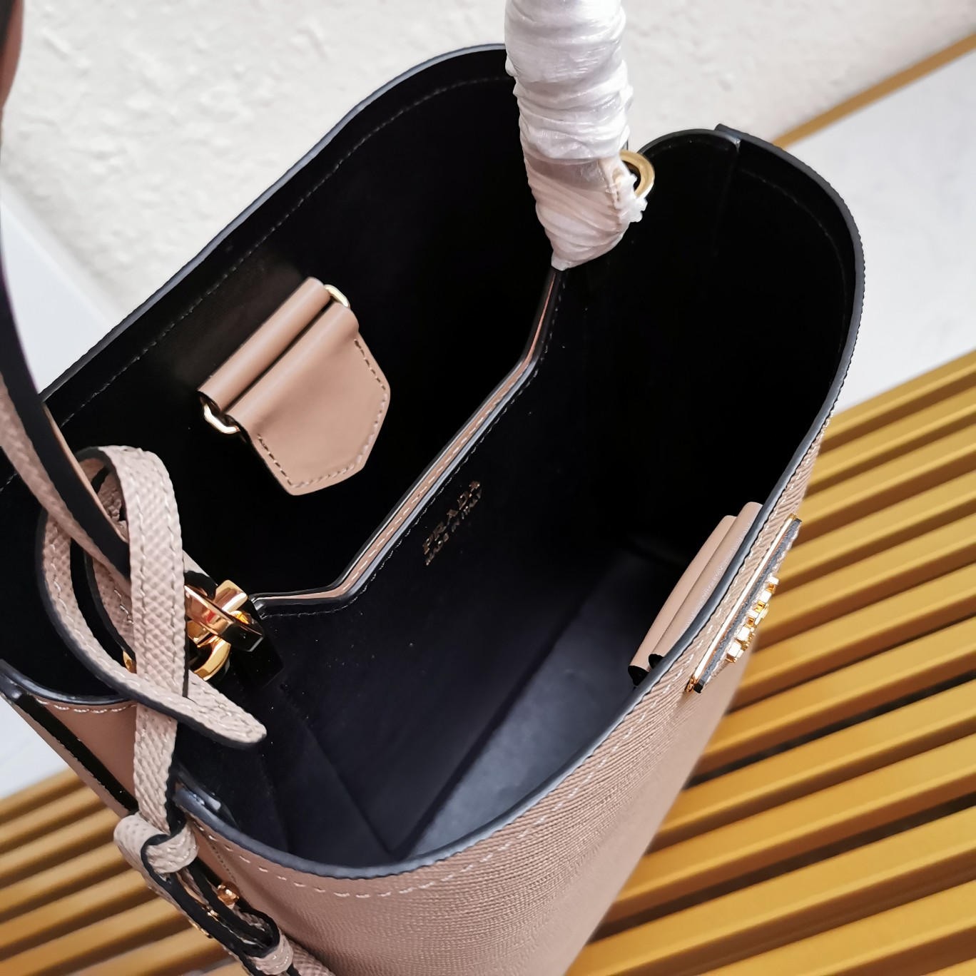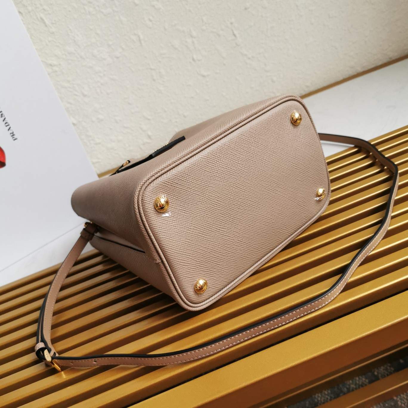 Original item, made with imported Saffiano leather material. The detachable shoulder strap, leather nameplate, and metal logo complement each other. The central pocket with leather-wrapped magnetic closure features a contrasting soft lambskin lining with a Saffiano leather triangle logo. This Double handbag style is elegant, eye-catching, and unique.
