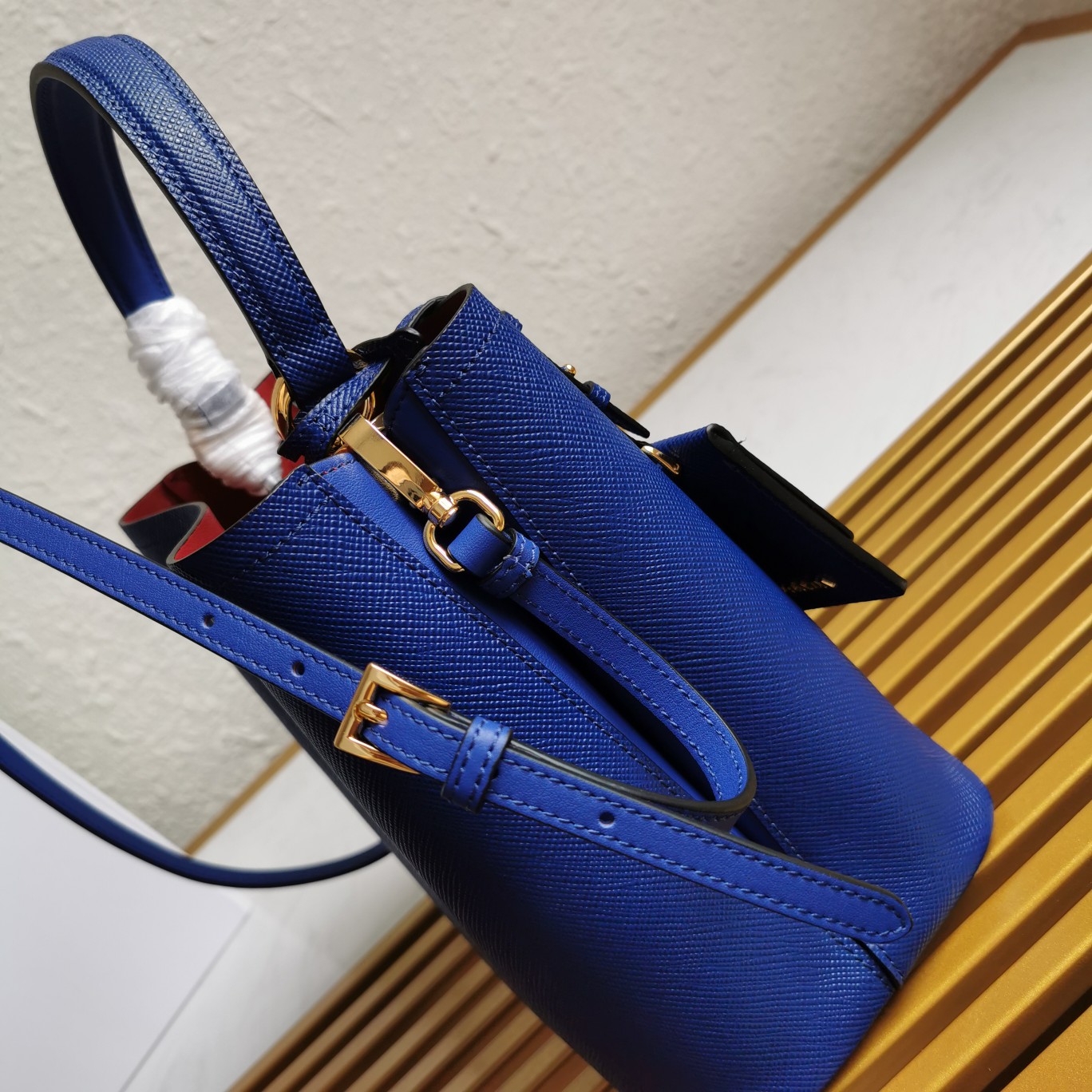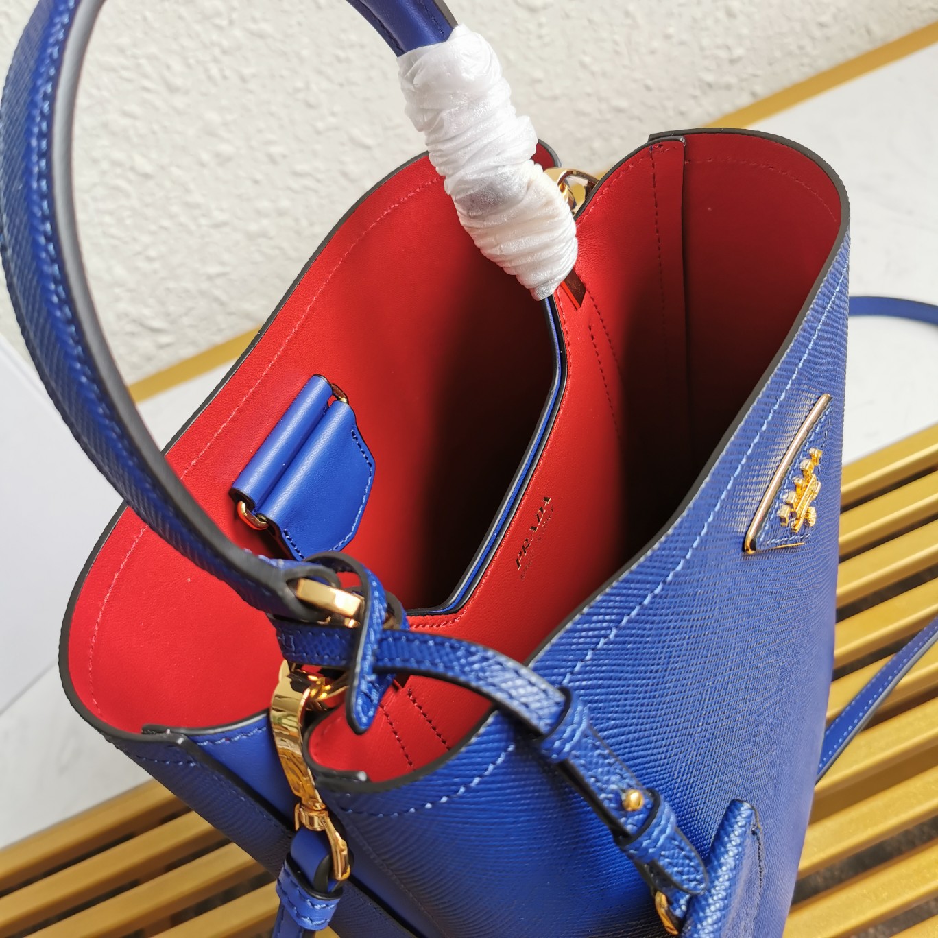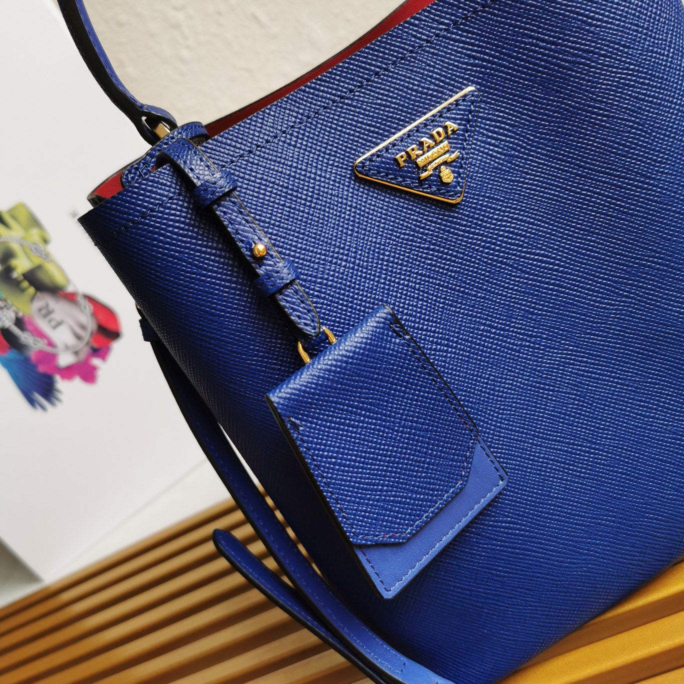 Original item, made with imported Saffiano leather material. The detachable shoulder strap, leather nameplate, and metal logo complement each other. The central pocket with leather-wrapped magnetic closure features a contrasting soft lambskin lining with a Saffiano leather triangle logo. This Double handbag style is elegant, eye-catching, and unique.
