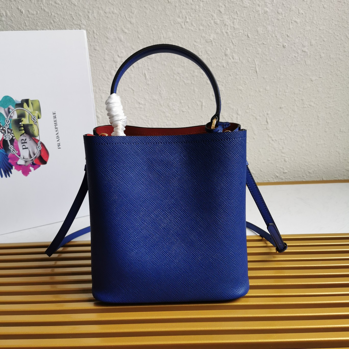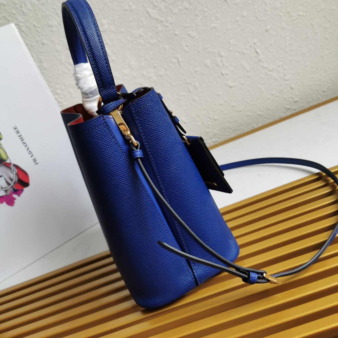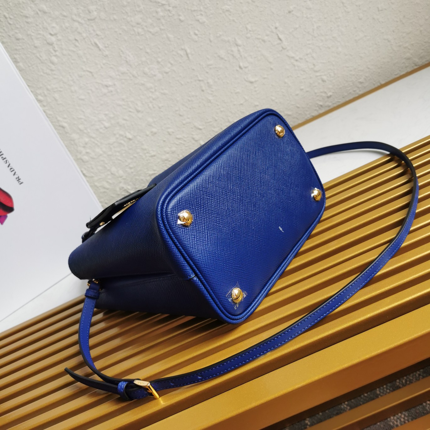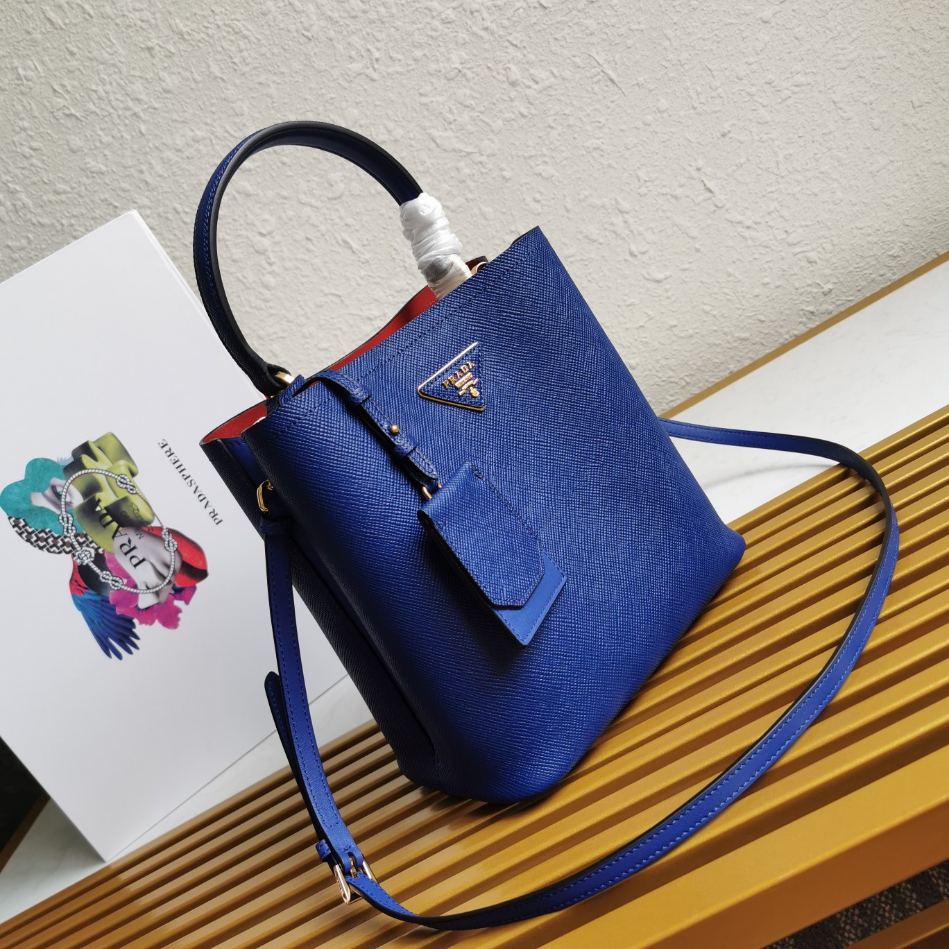 Original item, made with imported Saffiano leather material. The detachable shoulder strap, leather nameplate, and metal logo complement each other. The central pocket with leather-wrapped magnetic closure features a contrasting soft lambskin lining with a Saffiano leather triangle logo. This Double handbag style is elegant, eye-catching, and unique.